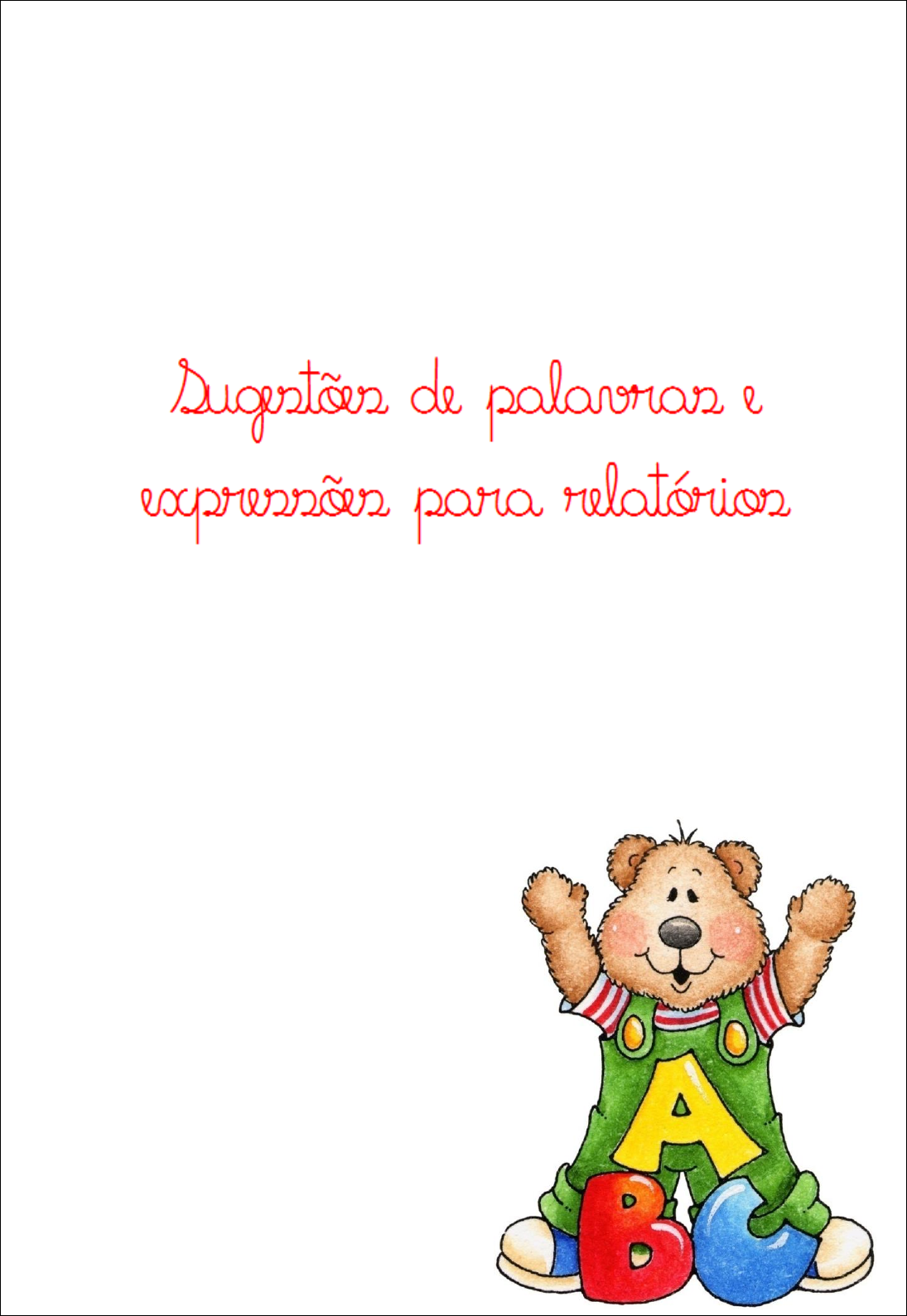 Sugestões para iniciar relatórios: • Com base nos objetivos trabalhados no bimestre, foi possível observar que o aluno... • Observando diariamente o desempenho do aluno, foi constatado que neste bimestre... • A partir das atividades apresentadas, o aluno demonstrou habilidades em... • Com base na observação diária, foi possível constatar que o aluno... SUGESTÕES DE FRASES E EXPRESSÕES PARA USO EM RELATÓRIOS VOCÊ PENSA VOCÊ ESCREVE O aluno não sabe O aluno não adquiriu os conceitos, está em fase de aprendizado. Não tem limites Apresenta dificuldades de auto-regulação, pois... É nervoso Ainda não desenvolveu habilidades para o convívio no ambiente escolar, pois... Tem o costume de roubar Apresenta dificuldades de autocontrole quando... É agressivo Demonstra agressividade em situações de conflito; usa de meios físicos para alcançar o que deseja. É bagunceiro, relaxado, porco Ainda não desenvolveu hábitos próprios de higiene e de cuidados com seus pertences. Não sabe nada Aprendeu algumas noções, mais necessita desenvolver... É largado da família Aparenta ser desassistido pela família, pois... É desobediente Costuma não aceitar e compreender as solicitações dos adultos; Tem dificuldades em cumprir regras... É apático, distraído Ainda não demonstra interesse em participar das atividades propostas; Muitas vezes parece se desligar da realidade, envolvido em seus pensamentos É mentiroso Costuma utilizar inverdades para justificar seus atos ou relatar as atitudes dos colegas. É fofoqueiro Costuma se preocupar com os hábitos e atitudes dos colegas. É chiclete É muito afetuoso; demonstra constantemente seu carinho... É sonso e dissimulado Em situações de conflito coloca-se como espectador, mesmo quando está clara a sua participação. É preguiçoso Não realiza as tarefas, aparentando desânimo e cansaço, porém logo parte para brincadeiras e outras atividades. É mimado Aparenta desejar atenções diferenciadas para si, solicitando que sejam feitas todas as suas vontades. É deprimido, isolado, anti-social Evita o contato e o diálogo com colegas e professores preferindo permanecer sozinho; Ainda não desenvolveu hábitos e atitudes próprias do convívio social. É tagarela Costuma falar mais do que o necessário, não respeitando os momentos em que o grupo necessita de silêncio. Tem a boca suja Utiliza-se de palavras pouco cordiais par repelir ou afrontar Possui distúrbio de comportamento Apresenta comportamento fora do comum para sua idade e para o convívio em grupo, tais como... É egoísta Ainda não sabe dividir o espaço e os materiais de forma coletiva RELATÓRIO INDIVIDUAL Em relação à assimilação e fixação dos conteúdos: ✓ O aluno é excelente, independente e realiza todas as atividades ✓ O aluno é muito bom, porém tem necessidade de consultar o professor. ✓ O aluno possui dificuldade, é dependente do professor, mas realiza apesar de apresentar bastante lentidão. ✓ O aluno possui dificuldade, é extremamente dependente do professor, não consegue realizar nada sozinho e não demonstra vontade em aprender. Concentração e atenção às explicações em sala de aula: ✓ O aluno é participativo. ✓ O aluno é participativo, mas se empolga demais o que às vezes atrapalha. ✓ O aluno participa somente quando é solicitado. ✓ O aluno não participa da aula. Demonstra apatia. ✓ O aluno é distraído, conversa e ainda atrapalha os demais. Quanto à correção: ✓ O aluno não consegue corrigir os erros (clipes) sozinho, necessita que o professor lhe oriente durante a correção, seja ela no caderno ou na apostila, pois se distrai com muita facilidade. ✓ O aluno é excelente. Consegue identificar e corrigir seus erros (clipes) sem auxílio do professor sejam eles no caderno ou na apostila. ✓ O aluno não corrige certo da lousa, pois apresenta deficiência visual. ✓ O aluno não corrige certo da lousa, devido à falta de atenção. Quanto ao relacionamento do aluno com os colegas: ✓ Relaciona-se bem com todos os colegas. ✓ Não se relaciona bem com os colegas, gosta de se isolar. ✓ Não se relaciona bem com os colegas, é agressivo. ✓ Gosta de realizar trabalhos em grupo. ✓ Demonstra resistência em fazer trabalhos em equipe. Quanto à Caligrafia e desempenho do aluno em sala de aula: ✓ O aluno é excelente, tem a letra linda, é caprichoso e não apresenta erros. ✓ O aluno é excelente, mas por querer ser o primeiro da classe a terminar, acaba deixando a desejar no capricho e na letra. ✓ O aluno tem uma caligrafia boa, porém com muitos erros. ✓ O aluno tem uma caligrafia ruim, mas não apresenta erros. ✓ O aluno tem uma letra muito bonita e sem erros, mas demora muito para copiar. ✓ O aluno precisa fazer caligrafia (caderno). ✓ O aluno não precisa fazer caligrafia. Quanto à disciplina: ✓ O aluno apresenta comportamento excelente tanto em sala de aula , como na fila. ✓ O aluno apresenta comportamento excelente em sala, porém na fila, deixa a desejar. ✓ O aluno conversa, porém acata às regras da sala.Uma chamada de atenção é suficiente. ✓ O aluno é indisciplinado, cabendo ao professor chamar-lhe a atenção em muitos momentos. Quanto ao reforço: ✓ O aluno não necessita de reforço paralelo. ✓ O aluno necessita de reforço e comparece a todos. ✓ O aluno necessita de reforço, mas não comparece devido à resistência dos pais ou do próprio aluno. ✓ O aluno comparece aos reforços, mas apresenta resistência em realizar as atividades propostas (pede para ir ao banheiro; beber água distrai-se com facilidade, conversa, brinca). Quanto ao material usado em sala e lição de casa: ✓ O aluno realiza a lição de casa com capricho. ✓ O aluno realiza a lição de casa sem capricho. ✓ O aluno não realiza a lição de casa. ✓ O aluno traz todos os materiais necessários. ✓ O aluno esquece o material escolar. Quanto à Leitura: ✓ O aluno lê c