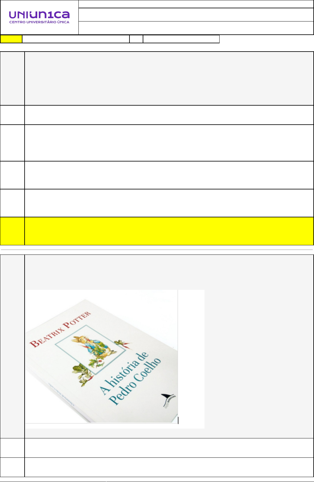 15/10/2024 17:27:34 1/6 REVISÃO DE SIMULADO Nome: MARCELA MIRANDA GOMES Disciplina: Literatura Infanto Juvenil Respostas corretas são marcadas em amarelo X Respostas marcardas por você. Questão 001 Teixeira (2019) considera que “o aluno precisa ter a capacidade de interpretação de textos advindos desses diferentes meios, ou mídias, em diversas linguagens” (p. 218), por isso, “necessita de um letramento multissemiótico e multimidiático”. Sendo assim, o melhor objetivo, ainda nas palavras da autora, que melhor se enquadra ao letramento multissemiótico ou multimidiático, a partir de livros infantojuvenis físicos e virtuais, equivale à opção: A) “Em bons livros infantis ilustrados, o texto e a imagem compõem, juntos, a compreensão da narrativa, da poesia, do texto em si”. B) “Os critérios a serem levados em consideração na seleção de textos infantis e juvenis para se trabalhar em sala de aula com os alunos vão de critérios formais, referentes à obra literária em si, a critérios subjetivos, não necessariamente estéticos, referentes aos leitores, seus valores e preferências, bem como seu contexto”. C) “A qualidade estética de uma obra literária é, em grande parte, a linguagem empregada nela, afinal, a literatura é a arte da palavra. Dessa forma, não é só o conteúdo da história que importa, a forma como ela é contada também.” D) “Letramento é saber usar a leitura e a escrita nas diferentes práticas sociais que as exigem em nossa sociedade. É a apropriação dos diferentes usos da leitura e da escrita nas sociedades modernas.” X E) “[O aluno] deve sair da escola com a capacidade de compreender textos complexos, com relação entre imagem, palavra escrita e som, entre texto e plataforma digital, cores e design”. Questão 002 Outra forma de relação entre o texto verbal e visual definido por Golden (apud NIKOLAJEVA; SCOTT, 2011) é quando a ilustração reforça e elabora o texto. Com isso, analise a capa a seguir e, em seguida, escolha a alternativa que melhor conceitua esse tipo de integração palavra-imagem: A) A narrativa principal é dada pelo texto verbal escrito, pois o título depende da palavra para transmitir sentido, enquanto a imagem não gera nenhum significado. B) Há uma narrativa elementar, representada pela ilustração, na qual o texto é seletivo, pois não oferece nenhum acréscimo de sentido. 15/10/2024 17:27:34 2/6 C) Texto e imagem estabelecem uma relação simétrica, pois ambas linguagens expressam um tipo de narrativa tanto verbal como visual. X D) O texto verbal corresponde ao título e o texto visual equivale à ilustração do coelho. Logo, a imagem reforça e elabora o título, ao passo que a primeira não elabora uma narrativa, mas ilustra o personagem citado no texto verbal. E) Não há um tipo de relação palavra-imagem, pois tanto o texto verbal como o visual são representados na capa do livro, quando os tipos de interação verbal e visual apenas são considerados quando estão na parte interna do livro. Questão 003 Wave (2008), ou Onda, é um livro da autora e ilustradora Suzy Lee com uma narrativa a partir de uma sequência de ilustrações. Segundo Nikolajeva e Scott (2011), o texto pode ser construído sem imagens ou completamente com imagens. Avalie a parte interna da obra de Lee, abaixo: A partir das páginas representadas acima, é possível afirmar que: A) Wave deve ser desconsiderado enquanto narrativa, já que este tipo textual depende exclusivamente da palavra para gerar qualquer nível de significado. X B) Wave demonstra ser uma narrativa não verbal, uma vez que o livro é composto a partir de uma sequência de ilustrações, sendo um livro de imagens. C) Assim como o poema, a parte interna do livro Wave demonstra ser um texto não narrativo repleto de ilustrações. D) Wave demonstra que está inacabado, considerando que o livro possui apenas imagens, de modo que as ilustrações precisam vir acompanhadas da palavra para produzir uma narrativa. E) Wave é uma narrativa verbal, visto que podemos inventar histórias a partir das imagens, que podem ser ilustradas por uma ou várias imagens. 15/10/2024 17:27:34 3/6 Questão 004 Ao citar Golden a respeito dos tipos de relação palavra-imagem, Nikolajeva e Scott (2011) trazem cinco formas de interação. A primeira delas ocorre quando o texto verbal e o visual geram redundância. Sendo assim, observe a capa do abecedário a seguir: É possível afirmar que a imagem acima gera redundância na relação palavra-imagem porque A) embora sejam simétricas entre si, a linguagem verbal depende do texto visual para ter o seu sentido revelado B) a interação entre o texto e a imagem é dada de uma forma poética, em que o leitor pode estabelecer diferentes significados, conforme o contexto de recepção da obra. C) o significado do texto está presente apenas no texto verbal escito, ou seja, a palavra. Com isso, a imagem não possui qualquer valor visual, apenas representativo X D) tanto o texto verbal escrito (isto é, o nome das coisas) quanto o texto visual (as imagens que representam os nomes) estabelecem uma relação simétrica de entre si, no que se refere à produção de significado E) a ilustração compreende uma narrativa literária de cada imagem, representando distintos significados e acontecimentos Questão 005 Ribeiro (2008) entende que, se pensada do ponto de vista da comunicação, a imagem produz significado “tanto quanto um gesto ou uma frase, pois a imagem é também uma fala e, consequentemente, uma mensagem” (RIBEIRO, 2008, p. 125). Desse modo, cita Jacques Aumont para afirmar que a imagem só existe a partir da descrição, já que, durante o processo de leitura, explica Ribeiro (2008), o espaço da narrativa estabelece relação com A) o mundo ao seu redor, sendo opcional descrever a representação nela contida. Em outras palavras, o autor apresenta uma noção ampla de texto, não sendo aquela apenas desti