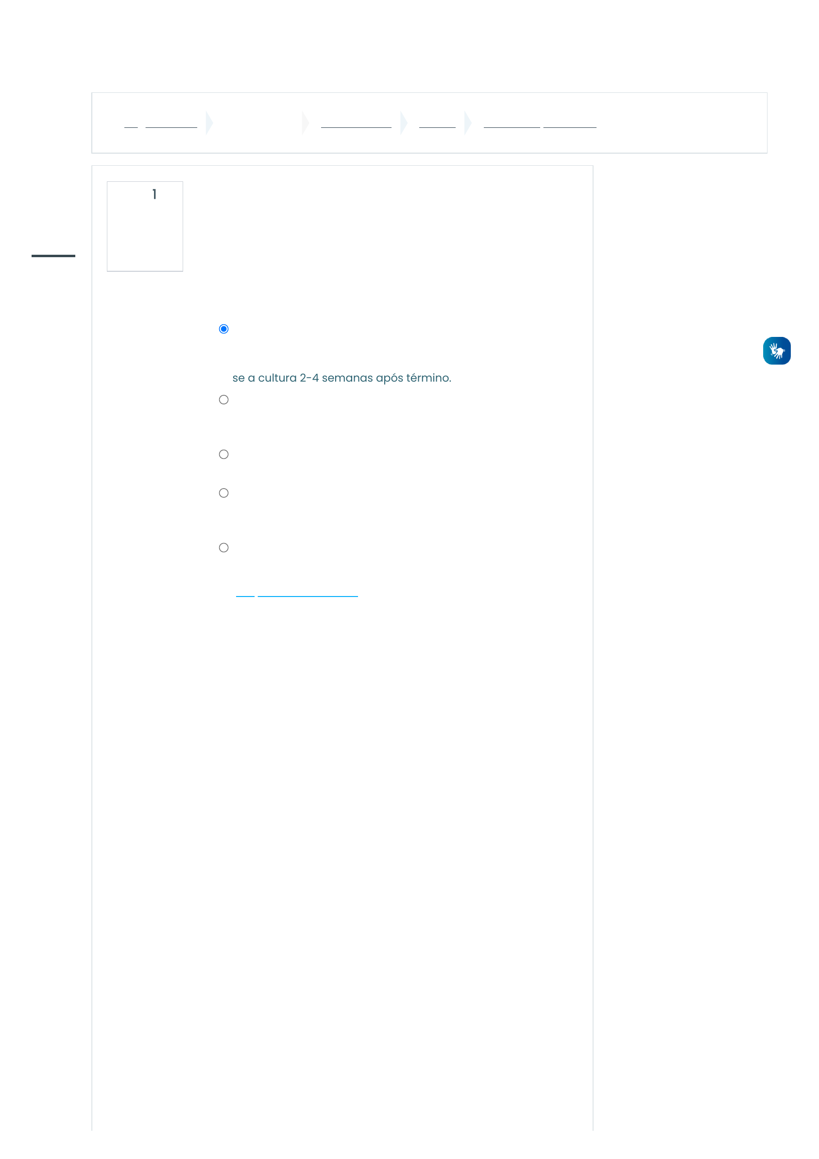 <p>07/10/21, 18:47 AV1 Tbl respiratório B</p><p>https://ava.fmo.edu.br/mod/quiz/attempt.php 1/11</p><p>Página inicial Meus cursos 2021.2 UC19 B PROVA AV1 Tbl respiratório B</p><p>Questão 1</p><p>Resposta</p><p>salva</p><p>Vale 1,00</p><p>ponto(s).</p><p>S.B.S., 58 anos portador de bronquiectasias por sequela de</p><p>tuberculose, chega ao ambulatório trazendo uma cultura com</p><p>isolamento de pseudomonas aeruginosa, pela primeira vez. No</p><p>momento, paciente refere permanecer com tosse produtiva</p><p>diária, mas sem mudanças no padrão de expectoração. Qual</p><p>melhor conduta neste caso?</p><p>Escolha uma:</p><p>a. Iniciar tratamento com drogas antipseudomonas por 2 a</p><p>3 semanas , associada posteriormente por antibióticos</p><p>inalados , completando 3 meses de tratamento, repetindo-</p><p>se a cultura 2-4 semanas após término.</p><p>b. Iniciar esquema com azitromicina 250 mg 3 x semana</p><p>por 1 ano, repetindo-se a cultura de escarro após este</p><p>período.</p><p>c. Não tratar com antibioticoterapia neste momento , já</p><p>que paciente estável sem sinais de exacerbação infecciosa.</p><p>d. Iniciar Colistina inalada + azitromicina 500 mg 3 x</p><p>semana repetindo-se a cultura 2-4 semanas após o</p><p>término.</p><p>e. Fazer esquema isolado de antibiótico inalatório por 28</p><p>dias.</p><p>Limpar minha escolha</p><p></p><p></p><p></p><p></p><p></p><p></p><p></p><p></p><p></p><p></p><p>https://ava.fmo.edu.br/</p><p>https://ava.fmo.edu.br/course/view.php?id=262</p><p>https://ava.fmo.edu.br/course/view.php?id=262§ion=3</p><p>https://ava.fmo.edu.br/mod/quiz/view.php?id=8038</p><p>https://ava.fmo.edu.br/mod/quiz/attempt.php</p><p>javascript:void(0);</p><p>https://ava.fmo.edu.br/user/index.php?id=262</p><p>https://ava.fmo.edu.br/grade/report/index.php?id=262</p><p>https://ava.fmo.edu.br/course/view.php?id=262&stopjsnav=1</p><p>https://ava.fmo.edu.br/course/view.php?id=262&datapref=1</p><p>https://ava.fmo.edu.br/</p><p>https://ava.fmo.edu.br/my/</p><p>https://ava.fmo.edu.br/calendar/view.php?view=month&course=262</p><p>javascript:void(0);</p><p>https://ava.fmo.edu.br/user/files.php</p><p>07/10/21, 18:47 AV1 Tbl respiratório B</p><p>https://ava.fmo.edu.br/mod/quiz/attempt.php 2/11</p><p>Questão 2</p><p>Resposta</p><p>salva</p><p>Vale 1,00</p><p>ponto(s).</p><p>Questão 3</p><p>Resposta</p><p>salva</p><p>Vale 1,00</p><p>ponto(s).</p><p>A.B F. 64 anos, masculino, procedente de Olinda. Paciente</p><p>relata que há 08 dias iniciou quadro de tosse seca associada a</p><p>mialgia discreta, há 3 dias notou piora da tosse, que passou a</p><p>ser produtiva com secreção amarelada e queda do estado</p><p>geral. Apresentou ao exame temperatura axilar de 38 °C e diz</p><p>apresentar falta de ar associada a dor ventilatório-</p><p>dependente em base pulmonar à D.</p><p>Nega patologias crônicas; nega tabagismo, etilismo. Nega</p><p>quadro semelhante ao atual. Usou salbutamol xarope por 3</p><p>dias sem melhora.</p><p>Radiografia de tórax mostrou consolidação com broncograma</p><p>aéreo em base pulmonar direita.</p><p>Ao exame: BEG, corado, hidratado, eupneico, febril (38,5°C),</p><p>anictérico, acianótico.</p><p>ACV: RCR, 2T, BNF e sem sopros, FC=100 bpm e PA=100x 70mm</p><p>Hg.</p><p>AR: MV presente, com estertores finos em base direita, FR=25</p><p>ipm.</p><p>Qual a hipótese diagnóstica mais provável e conduta</p><p>terapêutica para o caso:</p><p>Escolha uma:</p><p>a. Pneumonia adquirida na comunidade, hospitalização e</p><p>inicio de antibiótico venoso</p><p>b. Pneumonia adquirida na comunidade, iniciar tratamento</p><p>ambulatorial com antibióticos via oral.</p><p>c. Bronquiectasia exacerbada, colher culturas e iniciar</p><p>antibiótico venoso</p><p>d. Exacerbação de DPOC, iniciar antibiótico oral e</p><p>corticóide</p><p>e. Exacerbação de asma, associar corticóide oral ao</p><p>salbutamol xarope</p><p>Limpar minha escolha</p><p>Sobre as pneumonias adquiridas na comunidade, assinale a</p><p>alternativa mais adequada:</p><p>Escolha uma:</p><p>a. Entre os Patógenos mais comuns nos casos</p><p>ambulatoriais leves estão o Streptococcus pneumoniae,</p><p>Mycoplasma pneumoniae, Chlamydia pneumoniae e os</p><p>Vírus respiratórios e a legionella.</p><p>b. A tomografia de tórax não deve ser utilizada na</p><p>avaliação de complicações da PAC, como abscesso de</p><p>pulmão e derrame pleural loculado, pela sua baixa</p><p>acurácia.</p><p>c. A radiografia de tórax permite auxiliar no diagnóstico</p><p>diferencial e na presença de complicações, sendo</p><p>recomendada para apenas alguns pacientes admitidos ao</p><p>hospital.</p><p>d. A procura do agente etiológico é indicada de acordo</p><p>com a gravidade clínica do caso e não deve retardar o</p><p>início do tratamento.</p><p>e. Devemos buscar o diagnóstico etiológico em todos os</p><p>casos, principalmente nos imunossuprimidos e na falha</p><p>terapêutica, aguardando o início do tratamento após</p><p>confirmação do agente.</p><p>Limpar minha escolha</p><p></p><p></p><p></p><p></p><p></p><p></p><p></p><p></p><p></p><p></p><p>https://ava.fmo.edu.br/mod/quiz/attempt.php</p><p>https://ava.fmo.edu.br/mod/quiz/attempt.php</p><p>javascript:void(0);</p><p>https://ava.fmo.edu.br/user/index.php?id=262</p><p>https://ava.fmo.edu.br/grade/report/index.php?id=262</p><p>https://ava.fmo.edu.br/course/view.php?id=262&stopjsnav=1</p><p>https://ava.fmo.edu.br/course/view.php?id=262&datapref=1</p><p>https://ava.fmo.edu.br/</p><p>https://ava.fmo.edu.br/my/</p><p>https://ava.fmo.edu.br/calendar/view.php?view=month&course=262</p><p>javascript:void(0);</p><p>https://ava.fmo.edu.br/user/files.php</p><p>07/10/21, 18:47 AV1 Tbl respiratório B</p><p>https://ava.fmo.edu.br/mod/quiz/attempt.php 3/11</p><p>Questão 4</p><p>Resposta</p><p>salva</p><p>Vale 1,00</p><p>ponto(s).</p><p>Questão 5</p><p>Resposta</p><p>salva</p><p>Vale 1,00</p><p>ponto(s).</p><p>Em relação a DPOC assinale a alternati