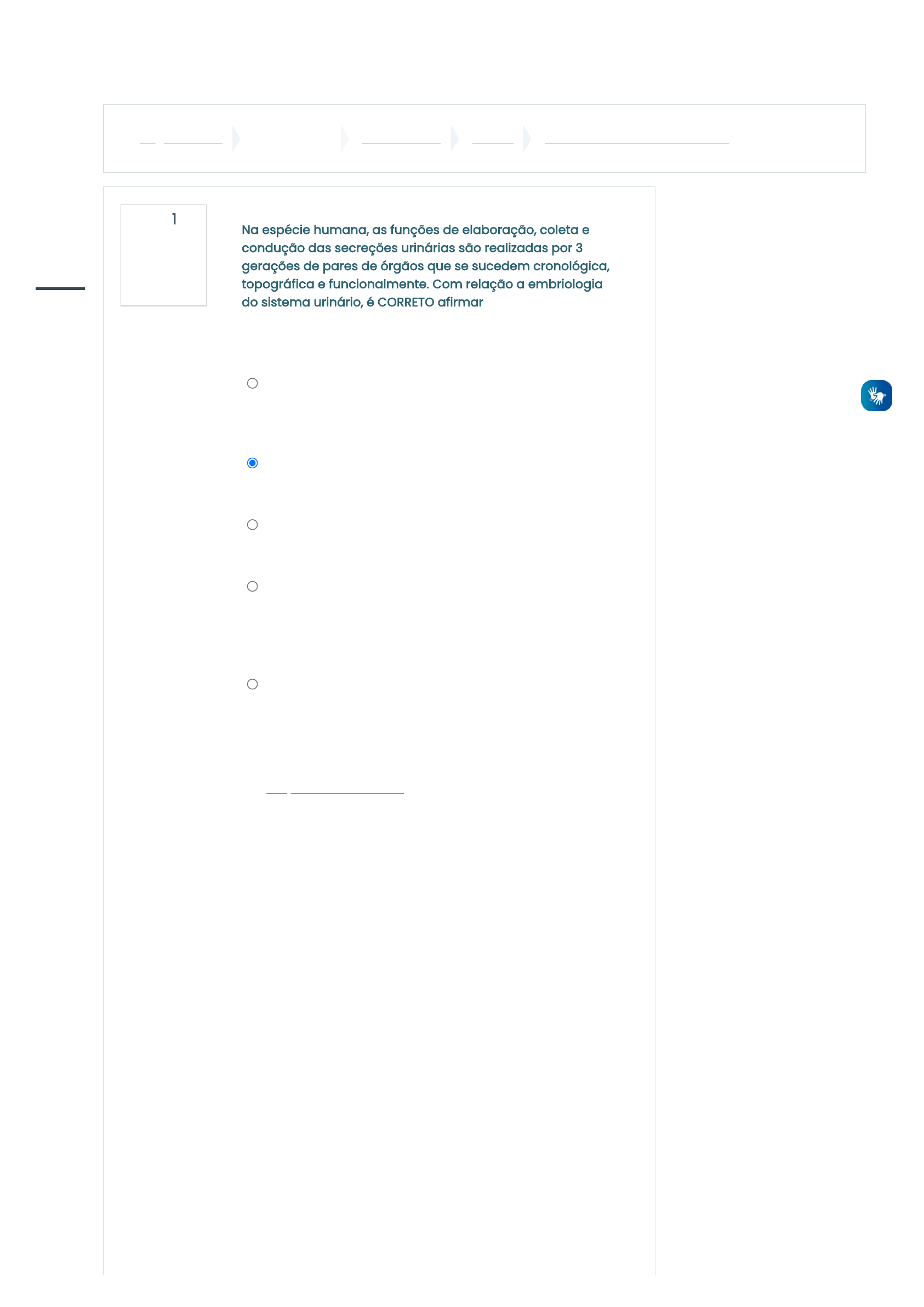 05/10/21, 12:05 AV1 Sistema Urinário B - 2021.2 https://ava.fmo.edu.br/mod/quiz/attempt.php 1/12 Página inicial Meus cursos 2021.2 UC21 B PROVA AV1 Sistema Urinário B - 2021.2 Questão 1 Resposta salva Vale 0,50 ponto(s). Na espécie humana, as funções de elaboração, coleta e condução das secreções urinárias são realizadas por 3 gerações de pares de órgãos que se sucedem cronológica, topográfica e funcionalmente. Com relação a embriologia do sistema urinário, é CORRETO afirmar: Escolha uma: Na ectopia renal simples, com o rim ocupando posição pélvica, a glândula suprarrenal acompanha a ectopia renal, posicionando-se imediatamente acima do rim ectópico. Do desenvolvimento dos dutos metanéfricos, mais conhecidos como brotos ureterais, resultará todo o sistema coletor-condutor do trato urinário definitivo. O mesonefro, também conhecido como rim permanente, começa sua formação durante a 15 e a 16 semanas de gestação. Na hipótese de haver aproximação excessiva dos blastemas na região pélvica, deverão resultar parênquimas definitivos com vícios de fusão. No rim em ferradura ocorre fusão apenas dos segmentos mais superiores dos blastemas. A lei de Weighert-Meyer estabelece que, nas duplicidades ureterais, o ureter que drena a unidade renal superior tem o meato posicionado medial e superiormente em relação ao meato que drena a unidade renal inferior. Limpar minha escolha a a https://ava.fmo.edu.br/ https://ava.fmo.edu.br/course/view.php?id=260 https://ava.fmo.edu.br/course/view.php?id=260§ion=3 https://ava.fmo.edu.br/mod/quiz/view.php?id=7902 https://ava.fmo.edu.br/mod/quiz/attempt.php javascript:void(0); https://ava.fmo.edu.br/user/index.php?id=260 https://ava.fmo.edu.br/grade/report/index.php?id=260 https://ava.fmo.edu.br/course/view.php?id=260&stopjsnav=1 https://ava.fmo.edu.br/course/view.php?id=260&datapref=1 https://ava.fmo.edu.br/ https://ava.fmo.edu.br/my/ https://ava.fmo.edu.br/calendar/view.php?view=month&course=260 javascript:void(0); https://ava.fmo.edu.br/user/files.php 05/10/21, 12:05 AV1 Sistema Urinário B - 2021.2 https://ava.fmo.edu.br/mod/quiz/attempt.php 2/12 Questão 2 Resposta salva Vale 0,50 ponto(s). Questão 3 Resposta salva Vale 0,50 ponto(s). Com relação a fisiopatologia e ao processo físico-químico da formação do cálculo urinário, é CORRETO afirmar: Escolha uma: Uma solução é dita SATURADA quando a concentração de um sal é menor que o seu produto de solubilidade, e nesse ponto não ocorre a cristalização desse sal nem a formação de cálculo. Os cálculos de estruvita, cistina, ácido úrico e fosfato de cálcio não possuem inibidores de formação/crescimento. Os cálculos de fosfato amoníaco magnesiano ou estruvita necessitam de baixos pH (ácido) para cristalizar e correspondem a cerca de 75% dos cálculos coraliformes. Dentre os cálculos renais, o mais comum decorre da hipercalciúria familiar idiopática, ou seja, cálculo de oxalato de cálcio sem identificação de nenhuma causa sistêmica, encontrada entre 30 e 60% dos adultos formadores de cálculos. O processo de AGREGAÇÃO se refere a formação da menor unidade de um cristal, o primeiro passo na formação de um cálculo. Limpar minha escolha Quanto às infecções urinárias complicadas, é CORRETO afirmar: Escolha uma: Os abscessos renais cursam com quadro clínico semelhante a pielonefrites e, mesmo quando oriundos da via hematogênica, costumam ter uroculturas positivas. São fatores que sugerem ITUs complicadas: cistite recorrente, anormalidade funcional ou anatômica do trato urinário, sexo masculino, ITU em crianças, uso recente de antibióticos, uso de cateteres urinários e instrumentação do trato urinário recente Os principais fatores de risco para formação de abscessos renais são estase urinária, litíase urinária, gestação, bexiga neurogênica, hipertensão arterial e diabetes melito. O tratamento da prostatite bacteriana aguda consiste em antibioticoterapia, com duração média de 2-4 semanas. A decisão pela necessidade ou não de drenagem percutânea de um abscesso renal depende apenas das condições clínicas do paciente. Limpar minha escolha https://ava.fmo.edu.br/mod/quiz/attempt.php https://ava.fmo.edu.br/mod/quiz/attempt.php javascript:void(0); https://ava.fmo.edu.br/user/index.php?id=260 https://ava.fmo.edu.br/grade/report/index.php?id=260 https://ava.fmo.edu.br/course/view.php?id=260&stopjsnav=1 https://ava.fmo.edu.br/course/view.php?id=260&datapref=1 https://ava.fmo.edu.br/ https://ava.fmo.edu.br/my/ https://ava.fmo.edu.br/calendar/view.php?view=month&course=260 javascript:void(0); https://ava.fmo.edu.br/user/files.php 05/10/21, 12:05 AV1 Sistema Urinário B - 2021.2 https://ava.fmo.edu.br/mod/quiz/attempt.php 3/12 Questão 4 Resposta salva Vale 0,50 ponto(s). Referente a seleção de pacientes para transplante renal, é CORRETO afirmar: Escolha uma: São critérios de exclusão para transplante renal, entre outros: infecção sistêmica ativa, expectativa de vida menor que 2 anos, bexiga neurogênica com necessidade de cateterismo intermitente, neoplasia maligna em tratamento e úlcera gastroduodenal ativa. Quando necessária, a nefrectomia do rim nativo deve ser sempre realizada previamente ao ato cirúrgico do transplante renal. As principais causas de Doença Renal Crônica (DRC) no Brasil são Hipertensão Arterial Sistêmica e Diabetes Melito. Pacientes com doenças urológicas prévias, como urolitíase, devem realizar estudo urodinâmico previamente a realização do transplante renal. A nefrectomia do rim nativo é indicada quando há doença renal policística com rins muito volumosos, suspeita de neoplasia maligna, rins cronicamente infectados, rins atróficos e hipertensão arterial refratária ao tratamento clínico. Limpar minha escolha https://ava.fmo.edu.br/mod/quiz/attempt.php javascript:void(0); https://ava.fmo.edu.br/user/index.php?id=260 https://ava.fmo.edu.br/grade/report/index.