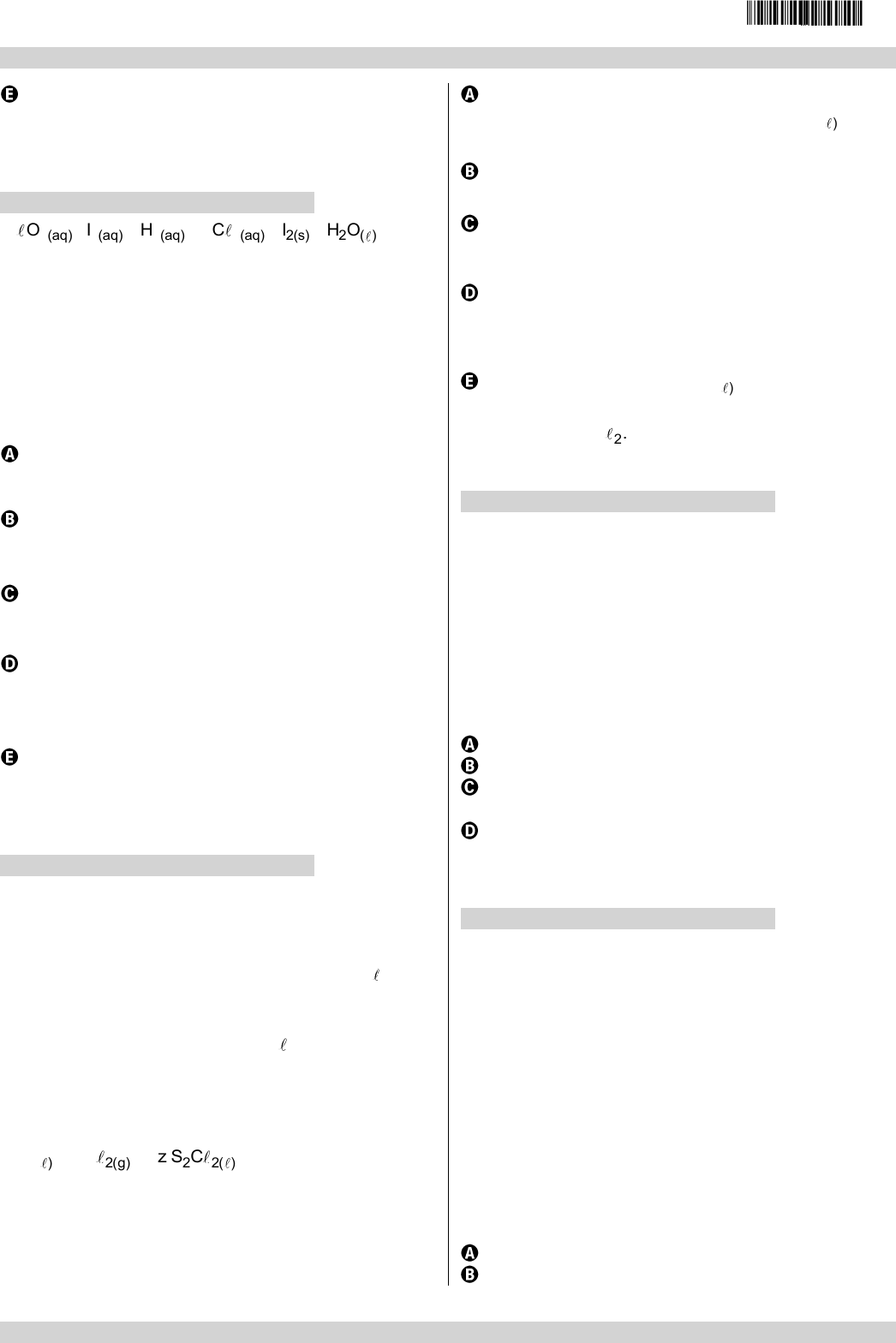 enem2021 /////////////////////////////////////////////////////////////////////////////////////////////////////////////////////////////////////////////////////////////////////////// /////////////////////////////////////////////////////////////////////////////////////////////////////////////////////////////////////////////////////////////////////////// I8020 – Help Educacional | Caderno de questões – Página 2 na reação estão envolvidos quatro elétrons, sendo dois elétrons do estanho e dois elétrons do mercúrio. Questão 4 //////////////////////////////////////////////////////////// (aq) (aq) (aq) (aq) 2(s) 2 ( )C O I H C I H O− − + −+ + → + + Um dos métodos para determinar a concentração de íons hipoclorito na água sanitária envolve a reação de oxirredução representada de maneira simplifica pela equação iônica não balanceada. Após o balanceamento da equação química com os menores coeficientes inteiros, é correto concluir: O total da carga dos íons reagentes é menor do que a carga relacionada aos produtos, na equação química. A reação entre 2,0 mol de íons hipoclorito com iodeto suficiente, em meio ácido, leva à produção de 254,0 g de iodo. O íon iodeto atua como agente oxidante porque o estado de oxidação do iodo diminui no final do processo de oxirredução. A quantidade aproximada de 233,6 10 íons cloreto obtida no processo de oxirredução revela a presença de 0,6 mol de íons hipoclorito em uma amostra analisada. O valor da soma dos coeficientes dos ânions reagentes é maior do que a dos coeficientes dos produtos da equação de oxirredução. Questão 5 //////////////////////////////////////////////////////////// Um processo industrial muito importante usado para melhorar propriedades físicas, mecânicas e térmicas da borracha é o da vulcanização. Uma das variações existentes desse processo é a vulcanização a frio, em que o composto 2 2S C é usado como fonte de átomos de enxofre, que formam “pontes” entre as cadeias poliméricas da borracha inicial. O composto 2 2S C pode ser produzido pela reação entre enxofre fundido com gás cloro, cuja reação é representada pela equação (não balanceada): 8( ) 2(g) 2 2( )x S y C z S C+ → Com relação à equação, assinale a alternativa correta. A massa mínima de gás cloro necessária para reagir completamente com 128 g de 8( )S é de 142 g. Os coeficientes x, y e z são, respectivamente, 1, 2 e 4. 8S é uma das formas isotópicas com que o átomo de enxofre se apresenta na natureza. Essa reação de oxirredução se processa com variação do estado de oxidação dos átomos de enxofre de 0 para 2+ e o cloro de 0 para 2.− Misturando-se 200 g de 8( )S com 284 g de gás cloro obtém-se, no máximo, uma massa de 540 g de 2 2S C . Questão 6 //////////////////////////////////////////////////////////// O conhecimento dos conceitos de oxidação e redução é de fundamental importância no estudo da biologia molecular associado à fotossíntese e à respiração, na redução de minerais para a obtenção de metais, em cálculos estequiométricos, na prevenção da corrosão e no estudo da eletroquímica. Dada a equação não balanceada, 2 3 3 2 3 4 2 4As S HNO H O H AsO H SO NO,+ + → + + marque a única afirmação verdadeira. Representa uma reação de auto oxirredução. Indica uma reação de oxirredução parcial. Dois elementos sofrem oxidação e um elemento sofre redução. Quando balanceada, a soma de seus coeficientes é 76. Questão 7 //////////////////////////////////////////////////////////// A respeito da equação iônica de oxirredução abaixo, não balanceada, são feitas as seguintes afirmações: 2 3 3 2 4 2IO HSO I SO H H O− − − ++ → + + + I. a soma dos menores coeficientes inteiros possível para o balanceamento é 17. II. o agente oxidante é o ânion iodato. III. o composto que ganha elétrons sofre oxidação. IV. o Nox do enxofre varia de +5 para +6. Das afirmações acima, estão corretas somente II e III. I e II. Help Educacional - help.educacional.01@gmail.com - IP: 187.44.58.175