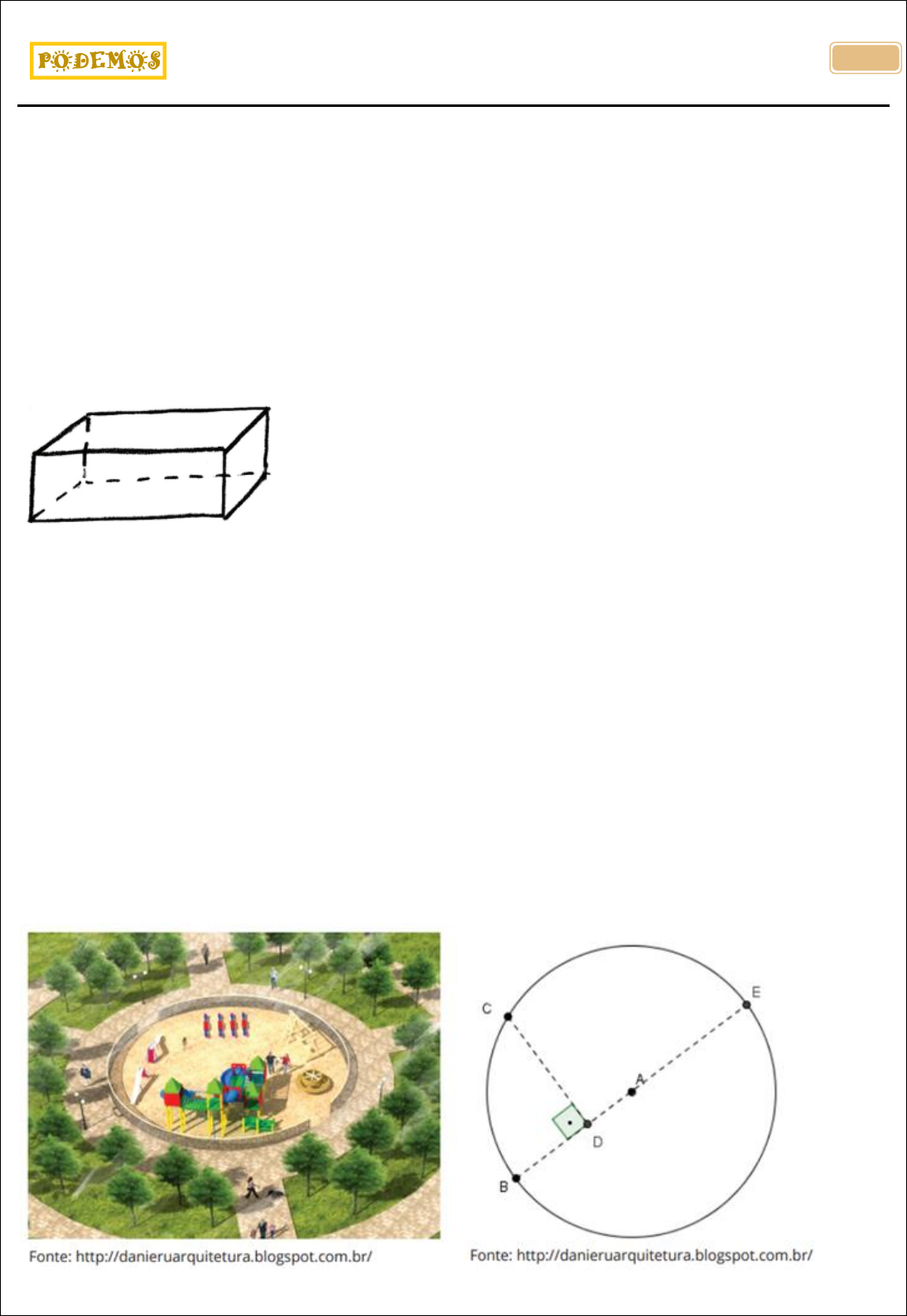 VESTIBULAR – TÉCNICO SUBSEQUENTE – 2015/1 Prof. Otávio Luciano Camargo Sales de Magalhães . 195 6)(Vestibular – IFSULDEMINAS – Técnico Subsequente ao Ensino Médio – 1° Semestre/2015) Alice fará uma viagem de ônibus de 80 km. Supondo que o ônibus viaje a uma velocidade média de 80 km/h e que, a cada 20 km, faça uma parada de 10 minutos, quanto tempo durará a viagem? a) 1 h b) 1,5 h c) 2 h d) 2,5 h 7)(Vestibular – IFSULDEMINAS – Técnico Subsequente ao Ensino Médio – 1° Semestre/2015) Em uma aula sobre prismas, Ari, o professor de Matemática, levou para a sala de aula uma caixa de creme dental na forma de um paralelepípedo retângulo (ver representação matemática feita a mão livre por um de seus alunos abaixo) de dimensões 16,5 cm; 3 cm e 3,5 cm, fazendo a seguinte pergunta: Se esta caixa estivesse totalmente cheia de creme dental, qual seria a quantidade de creme contida na caixa (em mL)? Qual o item que apresenta a resposta correta para a pergunta do professor? a) 117,75 mL b) 173,25 mL c) 230,00 mL d) 346,50 mL 8)(Vestibular – IFSULDEMINAS – Técnico Subsequente ao Ensino Médio – 1° Semestre/2015) Numa dada classe de 700 estudantes, 100 estudam Português e Matemática, 300 estudam apenas uma das disciplinas citadas e 150 estudam Português. Quantos alunos estudam Matemática? a) 200 b) 250 c) 300 d) 350 9)(Vestibular – IFSULDEMINAS – Técnico Subsequente ao Ensino Médio – 1° Semestre/2015) A figura, da esquerda, abaixo representa a vista de uma praça e a da direta representa um esquema matemático ampliado da parte central dessa praça.