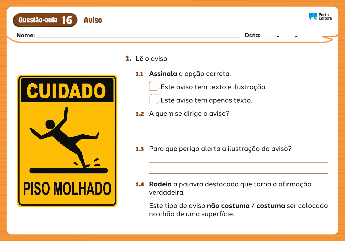OoQuestão-aula Nome: Data: - - Aviso16 1. Lê o aviso. 1.1 Assinala a opção correta. Este aviso tem texto e ilustração. Este aviso tem apenas texto. 1.2 A quem se dirige o aviso? 1.3 Para que perigo alerta a ilustração do aviso? 1.4 Rodeia a palavra destacada que torna a afirmação verdadeira. Este tipo de aviso não costuma / costuma ser colocado no chão de uma superfície. MZUP4PQA_20222745_CARTOES-AULA_Portugues_P001_042_3P_CImg.indd 31MZUP4PQA_20222745_CARTOES-AULA_Portugues_P001_042_3P_CImg.indd 31 15/02/2023 13:4015/02/2023 13:40