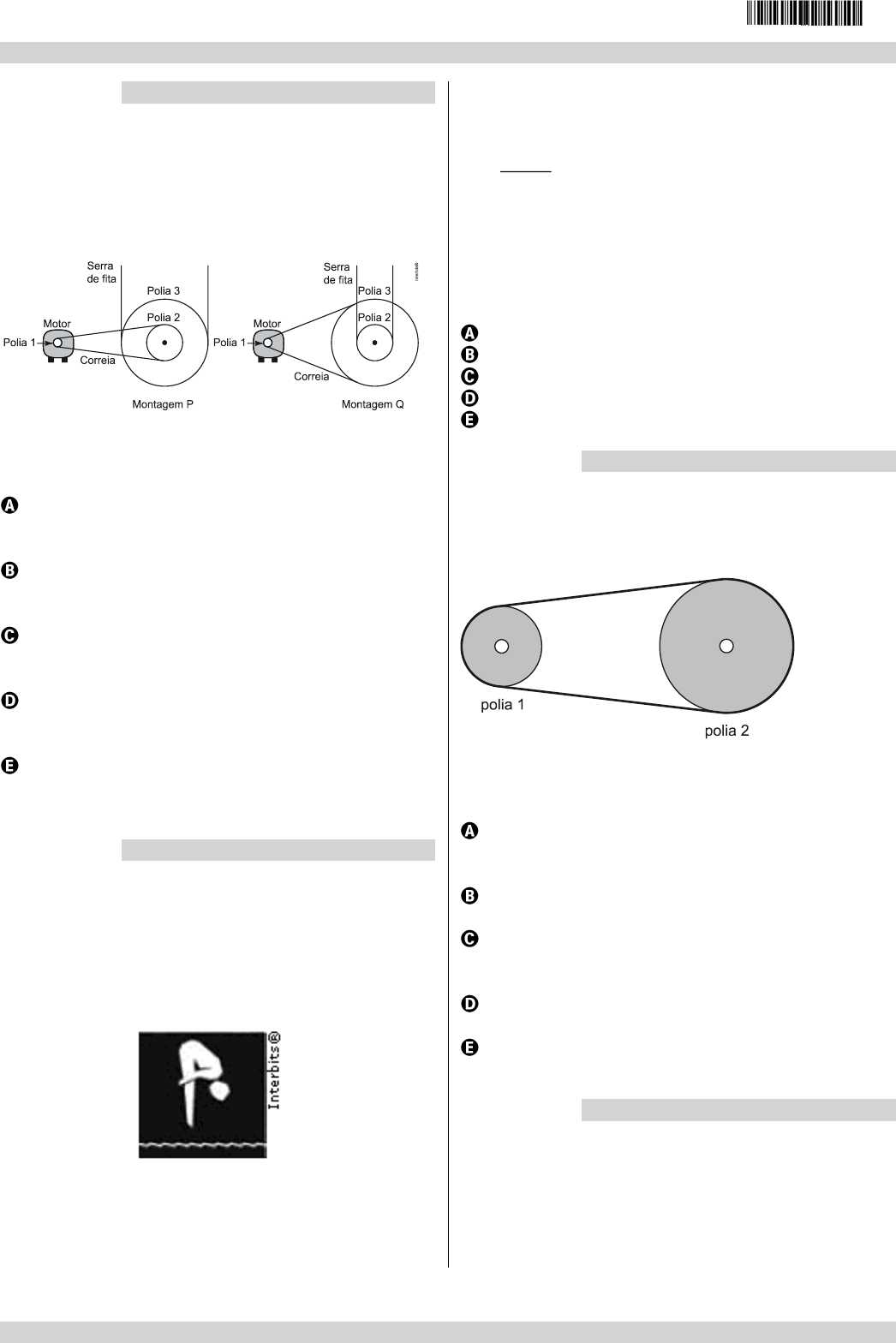 enem2021 /////////////////////////////////////////////////////////////////////////////////////////////////////////////////////////////////////////////////////////////////////////// /////////////////////////////////////////////////////////////////////////////////////////////////////////////////////////////////////////////////////////////////////////// I8020 – Help Educacional | Caderno de questões – Página 3 Questão 6 //////////////////////////////////////////////////////////// Para serrar ossos e carnes congeladas, um açougueiro utiliza uma serra de fita que possui três polias e um motor. O equipamento pode ser montado de duas formas diferentes, P e Q. Por questão de segurança, é necessário que a serra possua menor velocidade linear. Por qual montagem o açougueiro deve optar e qual a justificativa desta opção? Q, pois as polias 1 e 3 giram com velocidades lineares iguais em pontos periféricos e a que tiver maior raio terá menor frequência. Q, pois as polias 1 e 3 giram com frequências iguais e a que tiver maior raio terá menor velocidade linear em um ponto periférico. P, pois as polias 2 e 3 giram com frequências diferentes e a que tiver maior raio terá menor velocidade linear em um ponto periférico. P, pois as polias 1 e 2 giram com diferentes velocidades lineares em pontos periféricos e a que tiver menor raio terá maior frequência. Q, pois as polias 2 e 3 giram com diferentes velocidades lineares em pontos periféricos e a que tiver maior raio terá menor frequência. Questão 7 //////////////////////////////////////////////////////////// Salto de penhasco é um esporte que consiste em saltar de uma plataforma elevada, em direção à água, realizando movimentos estéticos durante a queda. O saltador é avaliado nos seguintes aspectos: criatividade, destreza, rigor na execução do salto previsto, simetria, cadência dos movimentos e entrada na água. Considere que um atleta salte de uma plataforma e realize 4 rotações completas durante a sua apresentação, entrando na água 2 segundos após o salto, quando termina a quarta rotação. Sabendo que a velocidade angular para a realização de n rotações é calculada pela expressão n.360 t em que n é o número de rotações e t é o tempo em segundos, assinale a alternativa que representa a velocidade angular das rotações desse atleta, em graus por segundo. 360 720 900 1080 1440 Questão 8 //////////////////////////////////////////////////////////// Na figura abaixo, temos duas polias de raios 1R e 2R , que giram no sentido horário, acopladas a uma correia que não desliza sobre as polias. Com base no enunciado acima e na ilustração, é correto afirmar que: a velocidade angular da polia 1 é numericamente igual à velocidade angular da polia 2. a frequência da polia 1 é numericamente igual à frequência da polia 2. o módulo da velocidade na borda da polia 1 é numericamente igual ao módulo da velocidade na borda da polia 2. o período da polia 1 é numericamente igual ao período da polia 2. a velocidade da correia é diferente da velocidade da polia 1. Questão 9 //////////////////////////////////////////////////////////// Apesar de toda a tecnologia aplicada no desenvolvimento de combustíveis não poluentes, que não liberam óxidos de carbono, a bicicleta ainda é o meio de transporte que, além de saudável, contribui com a qualidade do ar.