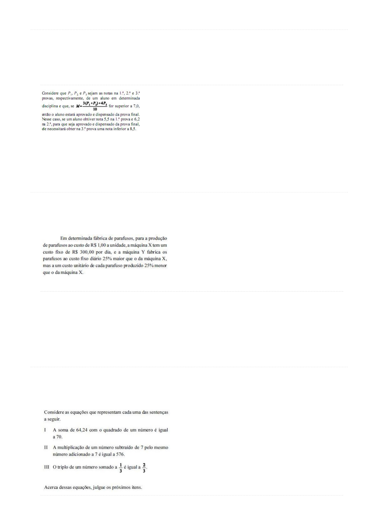 09/12/2017 Questões de Concursos e Perguntas de Concursos Públicos- Aprova Concursos https://www.aprovaconcursos.com.br/questoes-de-concurso/questoes/disciplina/Matem%25C3%25A1tica/banca/CESPE/filtro/2/pagina/88/quantid… 2/8 1309) Q186525 (/questoes-de-concurso/questao/186525) (/questoes-de-concurso/questao/186525#imprimir) Provas: CESPE - 2009 - FUB - Administrador de Edifícios (/questoes-de-concurso/prova/cespe-2009-fub-administrador-de-edificios) Disciplina: Matemática (/questoes-de-concurso/disciplina/matematica) - Assuntos: 6.6. Inequações-quociente-quociente e simultâneas (/questoes-de-concurso/questoes/assunto/6.6.+Inequa%C3%A7%C3%B5es-quociente-quociente+e+simult%C3%A2neas) Ocultar texto associado à questão A respeito de equações de 1.º e de 2.º graus, julgue os seguintes itens. Certo Errado 1310) Q73704 (/questoes-de-concurso/questao/73704) (/questoes-de-concurso/questao/73704#imprimir) Provas: CESPE - 2009 - MMA - Agente Administrativo (/questoes-de-concurso/prova/cespe-2009-mma-agente-administrativo) Disciplina: Matemática (/questoes-de-concurso/disciplina/matematica) - Assuntos: 4.1. Razões (/questoes-de-concurso/questoes/assunto/4.1.+Raz%C3%B5es) 4.4. Porcentagem (/questoes-de-concurso/questoes/assunto/4.4.+Porcentagem) Ocultar texto associado à questão Considerando essa situação, julgue os itens a seguir. Considerando que, em determinado dia, as duas máquinas produzam a mesma quantidade de parafusos e que essa quantidade seja superior a 200 parafusos, o custo total de fabricação desses parafusos na máquina Y será inferior ao da máquina X. Certo Errado 1311) Q73709 (/questoes-de-concurso/questao/73709) (/questoes-de-concurso/questao/73709#imprimir) Provas: CESPE - 2009 - MMA - Agente Administrativo (/questoes-de-concurso/prova/cespe-2009-mma-agente-administrativo) Disciplina: Matemática (/questoes-de-concurso/disciplina/matematica) - Assuntos: 7.2. Situações problemas com equações do 1º grau (/questoes-de-concurso/questoes/assunto/7.2.+Situa%C3%A7%C3%B5es+problemas+com+equa%C3%A7%C3%B5es+do+1%C2%BA Ocultar texto associado à questão As equações que representam as sentenças I e II têm pelo menos uma solução comum. https://www.aprovaconcursos.com.br/questoes-de-concurso/questao/73709 https://www.aprovaconcursos.com.br/questoes-de-concurso/questao/186525 https://www.aprovaconcursos.com.br/questoes-de-concurso/questao/73709#imprimir https://www.aprovaconcursos.com.br/questoes-de-concurso/questao/73704#imprimir https://www.aprovaconcursos.com.br/questoes-de-concurso/questoes/assunto/6.6.+Inequa%C3%A7%C3%B5es-quociente-quociente+e+simult%C3%A2neas https://www.aprovaconcursos.com.br/questoes-de-concurso/questao/73704 https://www.aprovaconcursos.com.br/questoes-de-concurso/disciplina/matematica https://www.aprovaconcursos.com.br/questoes-de-concurso/prova/cespe-2009-mma-agente-administrativo https://www.aprovaconcursos.com.br/questoes-de-concurso/disciplina/matematica https://www.aprovaconcursos.com.br/questoes-de-concurso/questoes/assunto/7.2.+Situa%C3%A7%C3%B5es+problemas+com+equa%C3%A7%C3%B5es+do+1%C2%BA+grau https://www.aprovaconcursos.com.br/questoes-de-concurso/questao/186525#imprimir https://www.aprovaconcursos.com.br/questoes-de-concurso/prova/cespe-2009-mma-agente-administrativo https://www.aprovaconcursos.com.br/questoes-de-concurso/prova/cespe-2009-fub-administrador-de-edificios https://www.aprovaconcursos.com.br/questoes-de-concurso/questoes/assunto/4.4.+Porcentagem https://www.aprovaconcursos.com.br/questoes-de-concurso/questoes/assunto/4.1.+Raz%C3%B5es https://www.aprovaconcursos.com.br/questoes-de-concurso/disciplina/matematica