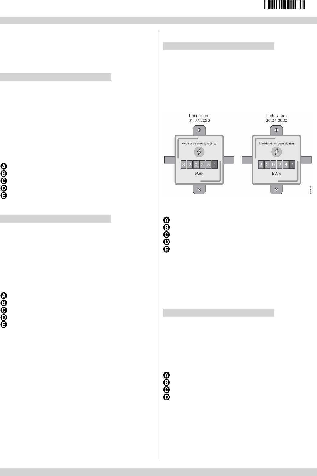 enem2021 /////////////////////////////////////////////////////////////////////////////////////////////////////////////////////////////////////////////////////////////////////////// /////////////////////////////////////////////////////////////////////////////////////////////////////////////////////////////////////////////////////////////////////////// I8020 – Help Educacional | Caderno de questões – Página 1 CIÊNCIAS DA NATUREZA E SUAS TECNOLOGIAS Questões de 1 a 15 Questão 1 (Famerp 2021) //////////////////////////////////////////////////////////// O turbilhão, aparelho utilizado em fisioterapia, consiste em um tanque no qual se coloca água ligeiramente aquecida e se produz um turbilhão, similar ao de uma banheira de hidromassagem. No aparelho de determinado fabricante, o aquecimento da água é feito por meio de um elemento resistivo, de resistência elétrica R, que é submetido a uma diferença de potencial U, de modo semelhante ao que ocorre em um chuveiro elétrico. Para reduzir o tempo de aquecimento, o fabricante deseja dobrar a potência empregada no aquecimento. Para isso, ele pode duplicar o valor de U e reduzir o valor de R à metade. duplicar os valores de U e de R. duplicar o valor de U e manter o valor de R. manter o valor de U e dividir por quatro o valor de R. manter o valor de U e duplicar o valor de R. Questão 2 (Unesp 2021) //////////////////////////////////////////////////////////// Procurando economizar energia, Sr. Artur substituiu seu televisor de LCD de 100 W por um de LED de 60 W, pelo qual pagou R$ 1.200,00. Considere que o Sr. Artur utilizará seu novo televisor, em média, durante cinco horas por dia e que 1kWh de energia elétrica custe R$ 0,50. O valor pago pelo novo televisor corresponderá à energia elétrica economizada devido à troca dos televisores em, aproximadamente, 450 meses. 400 meses. 600 meses. 550 meses. 500 meses. Questão 3 (Unesp 2021) //////////////////////////////////////////////////////////// Uma família saiu de casa no mês de julho de 2020 e esqueceu de desligar da tomada alguns dos aparelhos elétricos de sua residência, deixando-os em stand-by (modo de espera). As figuras mostram as indicações no medidor da energia elétrica na residência nos dias 01.07.2020 e 30.07.2020, período de 30 dias em que essa família esteve ausente. A potência total de todos os aparelhos que permaneceram em modo de espera durante a ausência da família é de 20 W. 50 W. 2,0 W. 0,5 W. 5,0 W. TEXTO PARA AS PRÓXIMAS 2 QUESTÕES: Lâmpadas de luz ultravioleta (UV) são indicadas para higienização e esterilização de objetos e ambientes em razão do seu potencial germicida. Questão 4 (Unicamp 2021) //////////////////////////////////////////////////////////// Em outro processo de esterilização, uma lâmpada UV de potência P 60 W= funciona sob uma diferença de potencial elétrico U 100 V.= A potência elétrica pode ser expressa também em kVA, sendo 1kVA 1000 V 1A 1000 W.= = A corrente elétrica i do circuito que alimenta a lâmpada é igual a 0,36 A. 0,60 A. 1,6 A. 3,6 A.