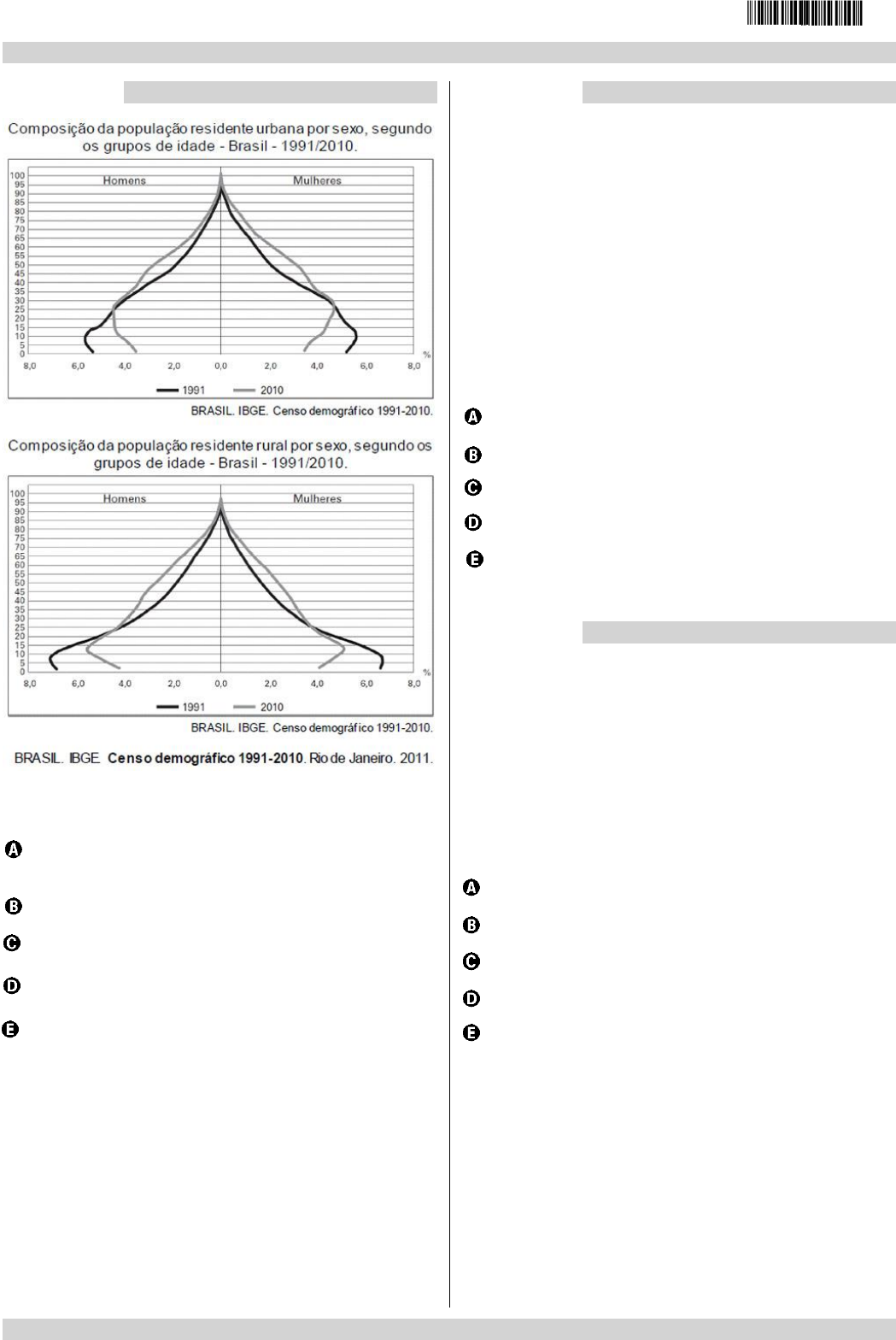 enem2021 /////////////////////////////////////////////////////////////////////////////////////////////////////////////////////////////////////////////////////////////////////////// /////////////////////////////////////////////////////////////////////////////////////////////////////////////////////////////////////////////////////////////////////////// I8020 – Help Educacional | Caderno de questões – Página 2 Questão 4 //////////////////////////////////////////////////////////// A interpretação e a correlação das figuras sobre a dinâmica demográfica brasileira demonstram um (a): Menor proporção de fecundidade na área urbana. Menor proporção de homens na área rural. Aumento da proporção de fecundidade na área rural. Queda da longevidade na área rural. Queda do número de idosos na área urbana. Questão 5 //////////////////////////////////////////////////////////// Uma ação tomada por alguns países que pode funcionar é proporcionar bolsas de estudo e empréstimos para aqueles que querem estudar em centros universitários fora do país, com a contrapartida de que, após a conclusão da faculdade, essas pessoas possam pagar ao governo voltando e trabalhando no país de origem. Desburocratizar o exercício de certas profissões e incentivar centros de excelência também pode ajudar. MALI, T. Disponível em: www.ufjf.br. Acesso em: 10 out. 2015 (adaptado). As medidas governamentais descritas buscam conter a ocorrência do seguinte processo demográfico: Transferência de refugiados. Deslocamento sazonal. Movimento pendular. Fuga de cérebros. Fluxo de retorno. Questão 6 //////////////////////////////////////////////////////////// A fome não é um problema técnico, pois ela não se deve à falta de alimentos, isso porque a fome convive hoje com as condições materiais para resolvê-las. PORTO-GONÇALVES, C. W. Geografia da riqueza, fome e meio ambiente. In: OLIVEIRA, A. U.; MARQUES, M. I. M. (Org.).O campo no século XXI: território de vida, de luta e de construção da justiça social. São Paulo: Casa Amarela; Paz e Terra, 2004 (adaptado). O texto demonstra que o problema alimentar apresentado tem uma dimensão política por estar associado ao(à): escala de produtividade regional. padrão de distribuição de renda. dificuldade de armazenamento de grãos. crescimento da população mundial. custo de escoamento dos produtos.