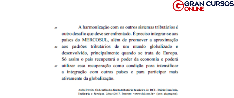 6 www.grancursosonline.com.br Cebraspe (CESPE/UnB) 2019 SELEÇÃO DE QUESTÕES 7. (SECRETARIA DA FAZENDA DO ESTADO DO RIO GRANDE DO SUL – RS/AUDITOR FISCAL DA RECEITA ESTADUAL) No texto 1A1-I, o pronome que inicia o trecho “Isso se tornou um atentado contra o princípio de simplificação” (l. 8 e 9) remete a. à oração “guerra fiscal ocasionada pelo ICMS” (l. 4 e 5). b. à ideia de que o ICMS é “O principal tributo em vigor” (l.5). c. ao argumento de que “O direito tributário brasileiro depara-se com grandes desafios” (l. 1 e 2). d. ao fato de “contribuintes e advogados se debruçarem sobre vinte e sete diferentes legislações no país” (l. 6 a 8) para entender o ICMS. e. à crítica do autor à recorrência das mesmas regras tributárias em “vinte e sete diferen- tes legislações no país” (l. 7 e 8). 8. (SECRETARIA DA FAZENDA DO ESTADO DO RIO GRANDE DO SUL – RS/AUDITOR FISCAL DA RECEITA ESTADUAL) No texto 1A1-I, o emprego de vírgulas para isolar as expressões “adotado no país” (l.22) e “embora se pareça com o IVA” (l. 23 e 24) é a. facultativo em ambas as expressões. b. obrigatório apenas na primeira expressão. c. apenas uma escolha estilística do autor. d. justificado por regras distintas de pontuação. e. necessário devido ao deslocamento dessas expressões dentro do período. 9. (SECRETARIA DA FAZENDA DO ESTADO DO RIO GRANDE DO SUL – RS/AUDITOR FISCAL DA RECEITA ESTADUAL) A correção gramatical e os sentidos originais do texto 1A1-I seriam preservados se, no trecho “A competência estadual do ICMS gera ainda difi- culdades na relação entre as vinte e sete unidades da Federação” (l. 26 a 28), o vocábulo “ainda” fosse substituído pela seguinte expressão, isolada por vírgulas. a. até então b. ao menos c. além disso