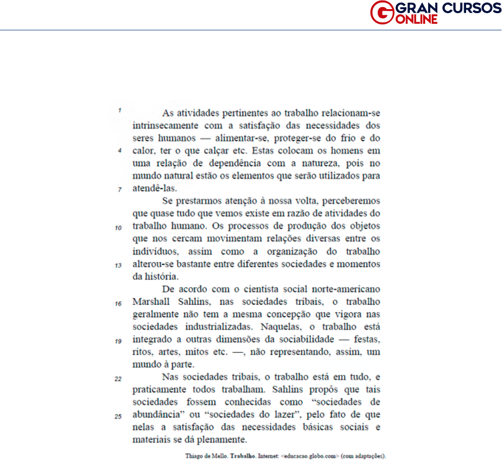 4 www.grancursosonline.com.br Cebraspe (CESPE/UnB) 2019 SELEÇÃO DE QUESTÕES SELEÇÃO DE QUESTÕES CEBRASPE (CESPE/UnB) 2019 LÍNGUA PORTUGUESA Julgue os seguintes itens, a respeito das ideias e das construções linguísticas do texto apresentado. 1. (DEPARTAMENTO DE POLÍCIA RODOVIÁRIA FEDERAL – BR/POLICIAL RODOVIÁRIO FEDERAL) As formas pronominais “Estas” (l. 4) e “las” (l. 7) referem-se a “necessidades dos seres humanos” (l. 2 e 3). 2. (DEPARTAMENTO DE POLÍCIA RODOVIÁRIA FEDERAL – BR/POLICIAL RODOVIÁRIO FEDERAL) Caso o advérbio “praticamente” (l. 23) fosse isolado por vírgulas, a correção gramatical do trecho seria alterada. 3. (DEPARTAMENTO DE POLÍCIA RODOVIÁRIA FEDERAL – BR/POLICIAL RODOVIÁRIO FEDERAL) No trecho “Os processos de produção dos objetos que nos cercam movimen- tam relações diversas entre os indivíduos” (l. 10 a 12), o sujeito da forma verbal “cercam” é “Os processos de produção dos objetos”.