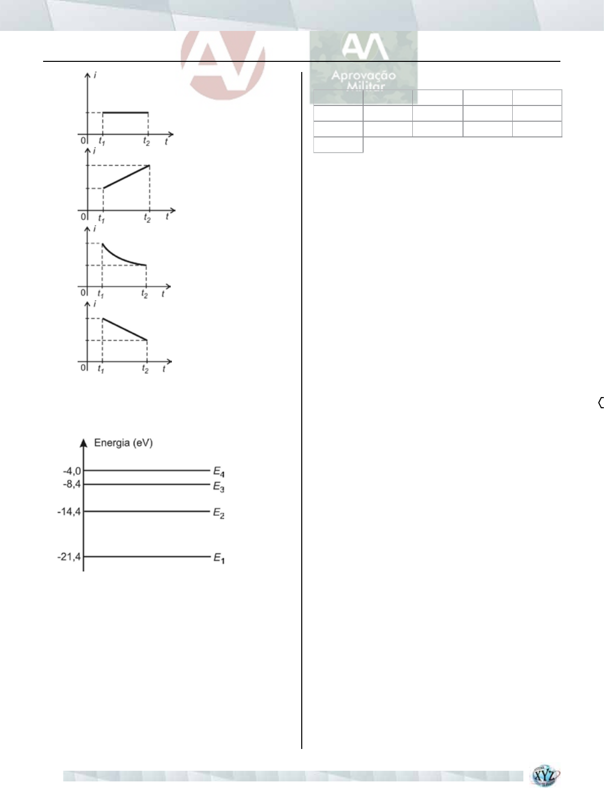 COLETÃNEA DE PROVAS AFA FÍSICA 60 a) b) c) d) QUESTÃO 16 • • • • • • • • • • • • • • • • • • • • • • • • • • • • • • • • • • • • • O diagrama abaixo ilustra os níveis de energia ocupa- dos por elétrons de um elemento químico A. Dentro das possibilidades apresentadas nas alternati- vas abaixo, a energia que poderia restar a um elétron com energia de 12,0 eV, após colidir com um átomo de A, seria de, em eV, a) 0 b) 1,0 c) 5,0 d) 5,4 GAbArIto 1-A 2-A 3-D 4-B 5-A 6-C 7-D 8-C 9-D 10-B 11-C 12-B 13-C 14-B 15-A 16-C