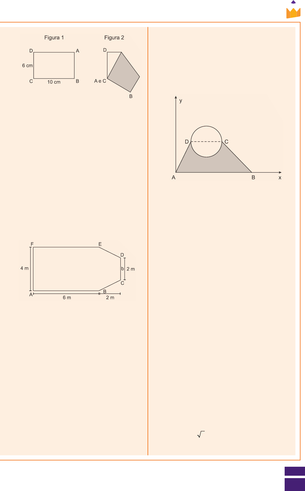 5MATEMÁTICA | GEOMETRIA PLANA MATERIAL DE FÉRIAS PREPARAENEM A área do trapézio cinza indicado na Figura 2, em 2cm , é igual a A 23. B 30. C 25. D 40. E 45. 19| Marcos comprou a quantidade mínima de piso para colocar em toda a sua sala que tem o for- mato abaixo e pagou R$ 48,00 o metro qua- drado. Quanto ele gastou comprando o piso para essa sala? A R$ 288,00 B R$ 672,00 C R$ 1.152,00 D R$ 1.440,00 E R$ 2.304,00 20| José quer calcular a área da região hachurada da figura abaixo, ela representa uma região lo- calizada em seu sítio. O círculo representa um lago que tem 20 metros de diâmetro. Fixan- do-se um sistema de coordenadas conforme a figura, sabe-se que o segmento AD está sobre a reta cuja equação é dada por y 2x= e que o segmento BC está sobre a reta cuja equação é y x 50.= - + Sabe-se ainda que CD é igual ao diâmetro do círculo e que a coordenada x do ponto D é igual a 10. Assim, é CORRETO afirmar que a área da re- gião, em metros quadrados, é igual a A 700. B 700 50 .ð- C 700 100 .ð- D 700 200 .ð- E 700 400 .ð- 21| No triângulo MPQ, seja PH a altura relativa ao vértice P. O ponto H, no lado MQ, divide- -o em dois segmentos cujas medidas são res- pectivamente 3 cm e 2 cm. Se a medida da altura (segmento PH) é 6 cm, então, a medi- da do ângulo interno do vértice P é igual a A 45 .° B 30 .° C 60 .° D 50 .° 22| No triângulo SRT, representado a seguir, os lados RT e RS tem medidas iguais. Sabendo que o segmento RU mede 6 cm e o segmento ST mede 8 2 cm, a área do triângulo SRU é quantos por cento da área do triângulo SRT?