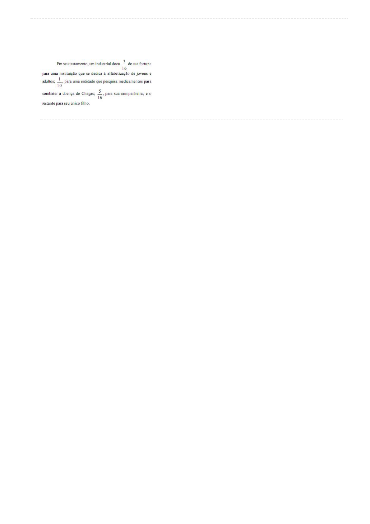 09/12/2017 Questões de Concursos e Perguntas de Concursos Públicos- Aprova Concursos https://www.aprovaconcursos.com.br/questoes-de-concurso/questoes/disciplina/Matem%25C3%25A1tica/banca/CESPE/filtro/2/pagina/28/quantid… 6/6 406) Errado 410) A 414) Certo 418) Certo 407) Errado 411) C 415) Errado 419) Errado 408) Errado 412) D 416) Anulada 420) Certo 409) E 413) Errado 417) Certo GABARITO: Provas: CESPE - 2012 - Banco da Amazônia - Técnico Científico - Conhecimentos Básicos para os Cargos de 1 a 15 (/questoes-de-concurso/prova/cespe-2012-banco-da-amazonia-tecnico-cientifi Disciplina: Matemática (/questoes-de-concurso/disciplina/matematica) - Assuntos: 4.4. Porcentagem (/questoes-de-concurso/questoes/assunto/4.4.+Porcentagem) Ocultar texto associado à questão A partir dessas informações, julgue os itens que se seguem. O �lho do industrial recebeu 40% da fortuna do pai. Certo Errado https://www.aprovaconcursos.com.br/questoes-de-concurso/questoes/assunto/4.4.+Porcentagem https://www.aprovaconcursos.com.br/questoes-de-concurso/prova/cespe-2012-banco-da-amazonia-tecnico-cientifico-conhecimentos-basicos-para-os-cargos-de-1 https://www.aprovaconcursos.com.br/questoes-de-concurso/disciplina/matematica