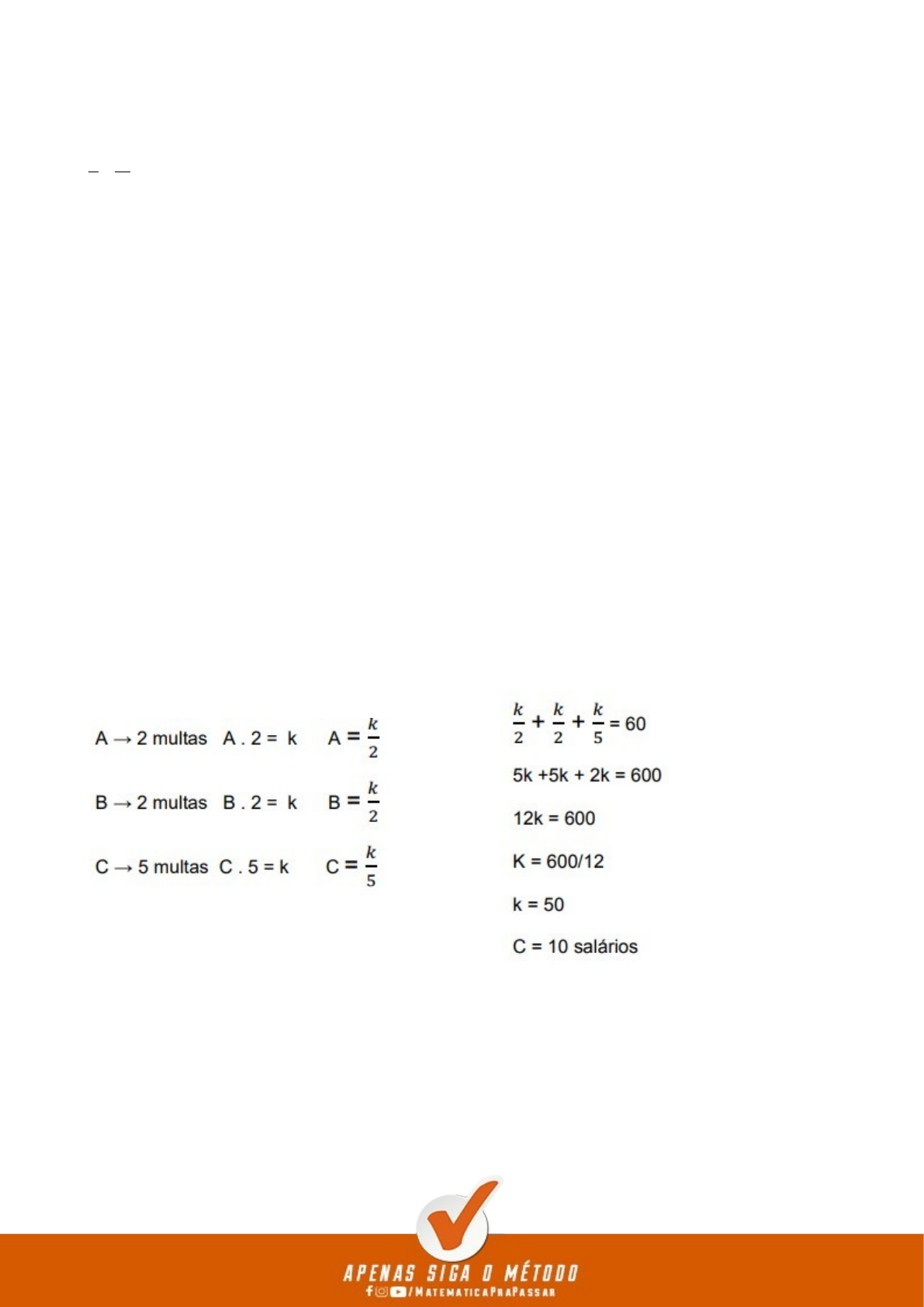 Página 319 Números a e b 𝑎 = 2 b 3 a = 2k 2k + 3k = 35 k = 7 b = 3k a = 14 b = 21 b - a = 21 - 14 = 7 Gabarito B 14 - empresa de transportes coletivos “sempre cabe mais um” vai distribuir um prêmio especial a seus três motoristas. São 60 salários mínimos repartidos entre os três, em partes inversamente proporcionais à quantidade de multas que tiveram durante um mês. Dois deles tiveram 2 multas cada um e o outro, 5 multas. Quanto ganhou omotorista que teve o maior número de multas? a) 10 salários b) 15 salários c) 20 salários d) 25 salários Resolução da questão Gabarito A 15 - As empresas x e y tem o mesmo número de funcionários. A razão entre o número de homens funcionários de x e o número de homens funcionários de y é dada por 4/3, e a razão entre o número de mulheres funcionárias de x e o número de mulheres funcionárias