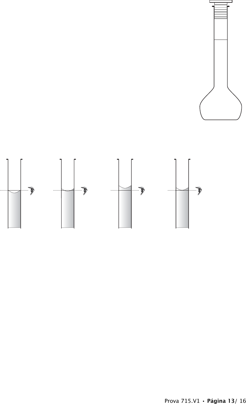 4. A preparação de soluções aquosas de uma dada concentração é uma actividade muito comum, quando se trabalha num laboratório químico. No decurso de um trabalho laboratorial, um grupo de alunos preparou, com rigor, 250,00 cm3 de uma solução aquosa, por pesagem de uma substância sólida. 4.1. Na figura 6 está representado um balão volumétrico calibrado de 250 mL, semelhante ao utilizado pelos alunos na preparação da solução. No balão estão indicadas a sua capacidade, a incerteza associada à sua calibração e a temperatura à qual esta foi efectuada. No colo do balão está marcado um traço de referência em todo o perímetro. 4.1.1. Tendo em conta as indicações registadas no balão volumétrico, indique o intervalo de valores no qual estará contido o volume de líquido a ser medido com este balão, à temperatura de 20 ºC. 4.1.2. Os alunos deverão ter alguns cuidados ao efectuarem a leitura do nível de líquido no colo do balão, de modo a medirem correcta- mente o volume de solução aquosa preparada. Seleccione a alternativa que corresponde à condição correcta de medição. 4.2. O grupo de alunos teve que preparar, com rigor, 250,00 cm3 de solução de tiossulfato de sódio penta- -hidratado, Na2S2O3 • 5 H2O(aq) (M = 248,22 g mol–1), de concentração 3,00 × 10–2 mol dm–3, por pesagem do soluto sólido. Calcule a massa de tiossulfato de sódio penta-hidratado que foi necessário pesar, de modo a preparar a solução pretendida. Apresente todas as etapas de resolução. 1�2 1�2 1�2 1�2 Prova 715.V1 • Página 13/ 16 � ����� �� �� ���� � ��� Fig. 6 Exame Nacional de 2008 - Fase 2Página 52 Utilizador Rectangle