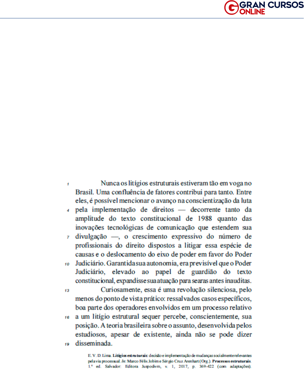 24 www.grancursosonline.com.br Cebraspe (CESPE/UnB) 2019 SELEÇÃO DE QUESTÕES 69. (SERVIÇO DE LIMPEZA URBANA – DF/ANALISTA DE GESTÃO DE RESÍDUOS SÓLI- DOS – ÁREA ADMINISTRAÇÃO) Na linha 16, o autor emprega o termo “suscetibilidade” para questionar a desigualdade de gênero enfrentada pelas mulheres como motivo que justificasse a reação da senhora na ópera. 70. (SERVIÇO DE LIMPEZA URBANA – DF/ANALISTA DE GESTÃO DE RESÍDUOS SÓLI- DOS – ÁREA ADMINISTRAÇÃO) Ao propor, na linha 23, que a indignação “Arrebata a alma” e “enfurece as vísceras”, o autor do texto afirma que esse sentimento provoca as mesmas alterações fisiológicas que certas drogas. 71. (SERVIÇO DE LIMPEZA URBANA – DF/ANALISTA DE GESTÃO DE RESÍDUOS SÓLI- DOS – ÁREA ADMINISTRAÇÃO) De acordo com o texto, quando estamos indignados e sozinhos, elaboramos mentalmente grandes argumentações contra aquilo que definimos como alvo da nossa revolta. Com relação às ideias e aos aspectos linguísticos do texto precedente, julgue os itens a seguir. 72. (PROCURADORIA GERAL DO MUNICÍPIO DE CAMPO GRANDE – MS/PROCURADOR MUNICIPAL) Na linha 18, o deslocamento do termo “se” para imediatamente após a forma verbal “pode” — pode-se — comprometeria a correção gramatical do texto.