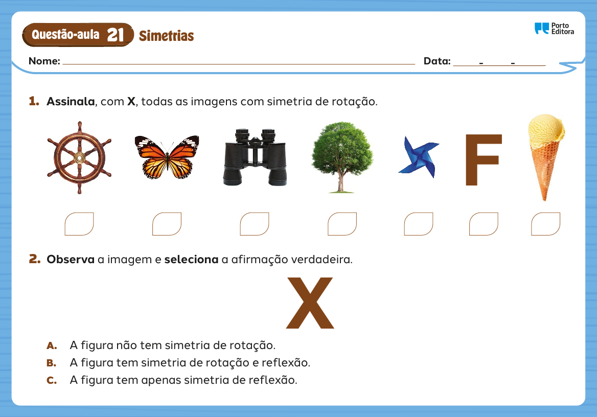 Questão-aula Data: - - Oo Nome: Simetrias 21 1. Assinala, com X, todas as imagens com simetria de rotação. 2. Observa a imagem e seleciona a afirmação verdadeira. A. A figura não tem simetria de rotação. B. A figura tem simetria de rotação e reflexão. C. A figura tem apenas simetria de reflexão. F X MZUP4PQA_20222745_CARTOES-AULA_Matematica_P043_086_3PCImg.indd 83MZUP4PQA_20222745_CARTOES-AULA_Matematica_P043_086_3PCImg.indd 83 27/02/2023 09:4027/02/2023 09:40