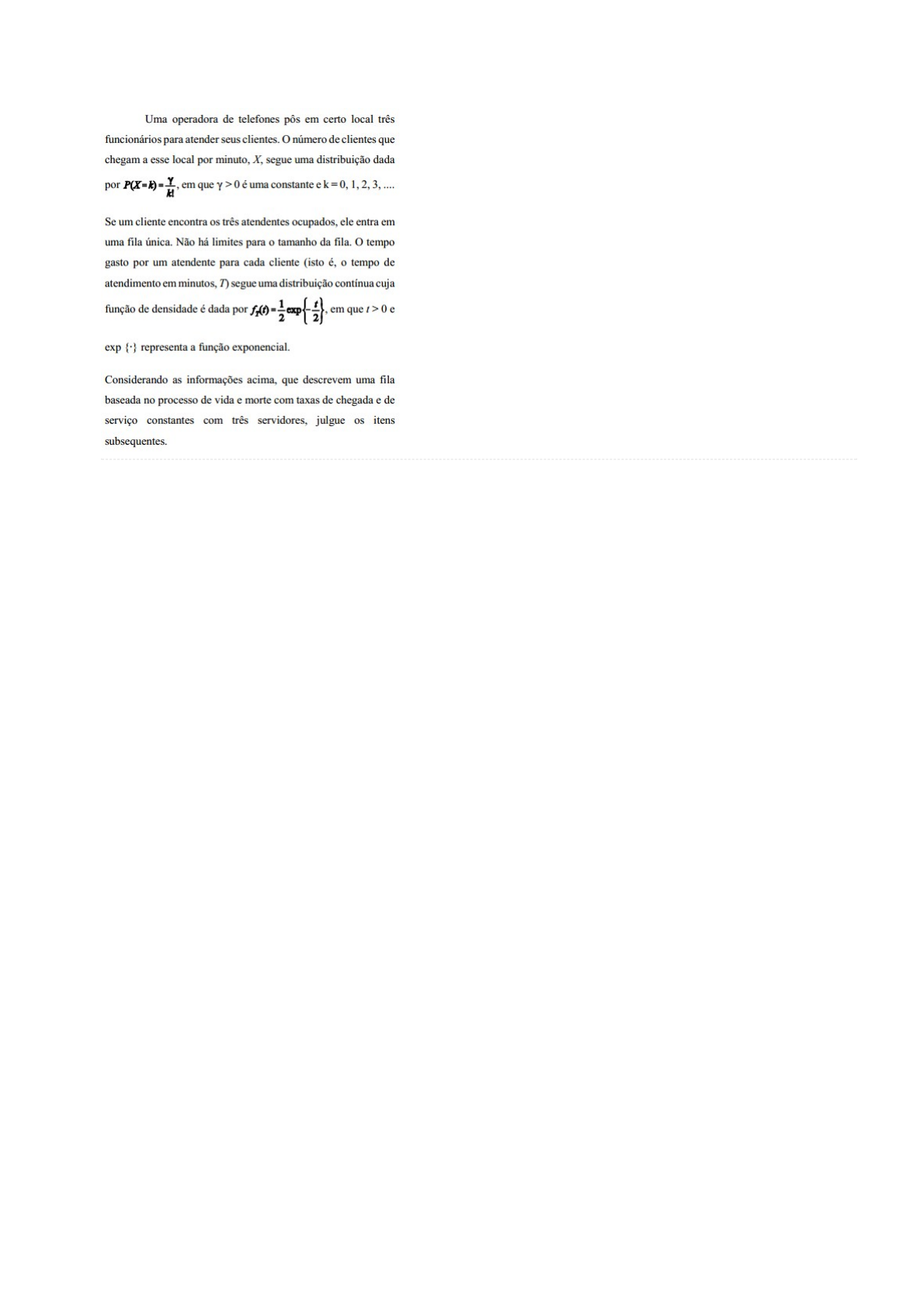 09/12/2017 Questões de Concursos e Perguntas de Concursos Públicos- Aprova Concursos https://www.aprovaconcursos.com.br/questoes-de-concurso/questoes/disciplina/Matem%25C3%25A1tica/banca/CESPE/filtro/2/pagina/95/quantid… 6/6 1411) D 1415) Certo 1419) Certo 1423) Errado 1412) Errado 1416) A 1420) Errado 1424) Certo 1413) Certo 1417) Errado 1421) Errado 1425) Certo 1414) Certo 1418) Certo 1422) Certo GABARITO: 1. Estatística descritiva e inferencial (/questoes-de-concurso/questoes/assunto/1.+Estat%C3%ADstica+descritiva+e+inferencial) Ocultar texto associado à questão A probabilidade de a �la estar vazia em certo instante é superior a 0,65. Certo Errado https://www.aprovaconcursos.com.br/questoes-de-concurso/questoes/assunto/1.+Estat%C3%ADstica+descritiva+e+inferencial
