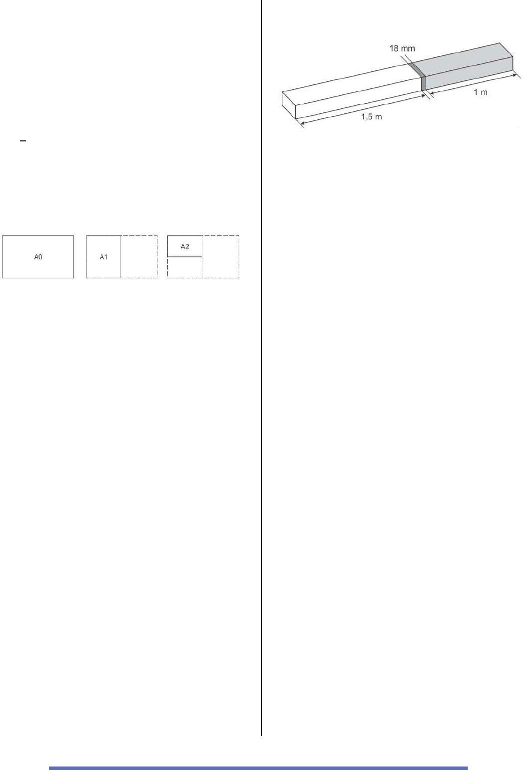 92 a) 279. b) 539. c) 2.619. d) 5.219. e) 7.613. M1768 - (Enem PPL) O padrão internacional ISO 216 define os tamanhos de papel utilizados em quase todos os países. O formato-base é uma folha retangular de papel chamada de A0, cujas dimensões estão na razão 1: √2. A partir de então, dobra-se a folha ao meio, sempre no lado maior, definindo os demais formatos, conforme o número da dobradura. Por exemplo, A1 é a folha A0 dobrada ao meio uma vez, A2 é a folha A0 dobrada ao meio duas vezes, e assim sucessivamente, conforme a figura. Um tamanho de papel bastante comum em escritórios brasileiros é o A4, cujas dimensões são 21,0 cm por 29,7 cm. Quais são as dimensões, em centímetros, da folha A0? a) 21,0 x 118,8 b) 84,0 x 29,7 c) 84,0 x 118,8 d) 168,0 x 237,6 e) 336,0 x 475,2 M1771 - (Enem) Na construção de um conjunto habitacional de casas populares, todas serão feitas num mesmo modelo, ocupando, cada uma delas, terrenos cujas dimensões são iguais a 20 m de comprimento por 8 m de largura. Visando a comercialização dessas casas, antes do início das obras, a empresa resolveu apresentá-las por meio de maquetes construídas numa escala de 1: 200. As medidas do comprimento e da largura dos terrenos, respectivamente, em centímetros, na maquete construída, foram de a) 4 e 10. b) 5 e 2. c) 10 e 4. d) 20 e 8. e) 50 e 20. M1774 - (Enem PPL) Atendendo à encomenda de um mecânico, um soldador terá de juntar duas barras de metais diferentes. A solda utilizada tem espessura de 18 milímetros, conforme ilustrado na figura. Qual o comprimento, em metros, da peça resultante após a soldagem? a) 2,0230 b) 2,2300 c) 2,5018 d) 2,5180 e) 2,6800 M1775 - (Enem PPL) Uma fábrica vende pizzas congeladas de tamanhos médio e grande, cujos diâmetros são respectivamente 30 cm e 40 cm. Fabricam-se apenas pizzas de sabor muçarela. Sabe-se que o custo com os ingredientes para a preparação é diretamente proporcional ao quadrado do diâmetro da pizza, e que na de tamanho médio esse custo é R$ 1,80. Além disso, todas possuem um custo Fixo de R$ 3,00, referente às demais despesas da fábrica. Sabe-se ainda que a fábrica deseja lucrar R$ 2,50 em cada pizza grande. Qual é o preço que a fábrica deve cobrar pela pizza grande, a fim de obter o lucro desejado? a) R$ 5,70 b) R$ 6,20 c) R$ 7,30 d) R$ 7,90 e) R$ 8,70 M1778 - (Enem PPL) Uma confecção possuía 36 funcionários, alcançando uma produtividade de 5.400