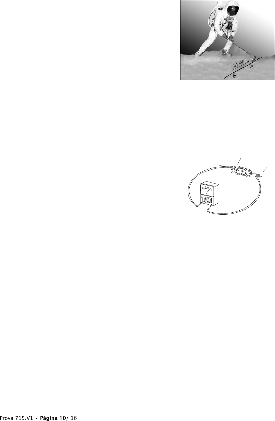 2.3. Para recolher amostras na superfície lunar, os astronautas usaram um utensílio de cabo extensível, tal como representado na figura 2. Imagine que, quando um dos astronautas tentou recolher uma amostra, de massa 200 g, esta deslizou, inadvertidamente, numa zona onde o solo era inclinado, passando na posição A com uma velocidade de módulo igual a 0,50 m s–1 e parando na posição B, tendo percorrido 51 cm entre estas posições. Nesse percurso, a energia potencial gravítica do sistema amostra + Lua diminuiu 8,16 × 10–2 J. Calcule a intensidade da força de atrito que actuou sobre a amostra no percurso considerado, admitindo que aquela se manteve constante. Apresente todas as etapas de resolução. 2.4. Uma vez que na Lua «o silêncio é total», os astronautas comunicavam entre si, mesmo a pequena distância, por meio de ondas electromagnéticas. Qualquer sinal sonoro, antes de poder ser enviado sob a forma de uma onda electromagnética, deve ser transformado num sinal eléctrico, recorrendo, por exemplo, a um microfone de indução. 2.4.1. O funcionamento do microfone de indução baseia-se no fenómeno da indução electromagnética, descoberto por Faraday. Este fenómeno pode ser evidenciado com um circuito constituído apenas por uma bobina ligada a um aparelho de medida adequado. Verifica-se que esse aparelho de medida detecta a passagem de corrente no circuito, quando se move um íman no interior da bobina (figura 3). Tendo em conta a situação descrita, seleccione a alternativa que completa correctamente a frase seguinte. Quanto mais rápido é o movimento do íman no interior da bobina, … (A) ... menor é o módulo da força electromotriz induzida, sendo maior a energia que o circuito pode disponibilizar. (B) … maior é o módulo da força electromotriz induzida, sendo menor a energia que o circuito pode disponibilizar. (C) … maior é o módulo da força electromotriz induzida, sendo maior a energia que o circuito pode disponibilizar. (D) … menor é o módulo da força electromotriz induzida, sendo menor a energia que o circuito pode disponibilizar. 2.4.2. O sinal eléctrico gerado num microfone tem frequências demasiado baixas para ser encaminhado directamente para a antena emissora. Deve, por esse motivo, sofrer um processo de modulação. Além do sinal eléctrico gerado no microfone, o processo de modulação requer outro sinal. Identifique esse sinal e explique sucintamente em que consiste o processo de modulação. Prova 715.V1 • Página 10/ 16 Fig. 2 Fig. 3 ����� � � � Exame Nacional de 2008 - Fase 2Página 49 Utilizador Rectangle