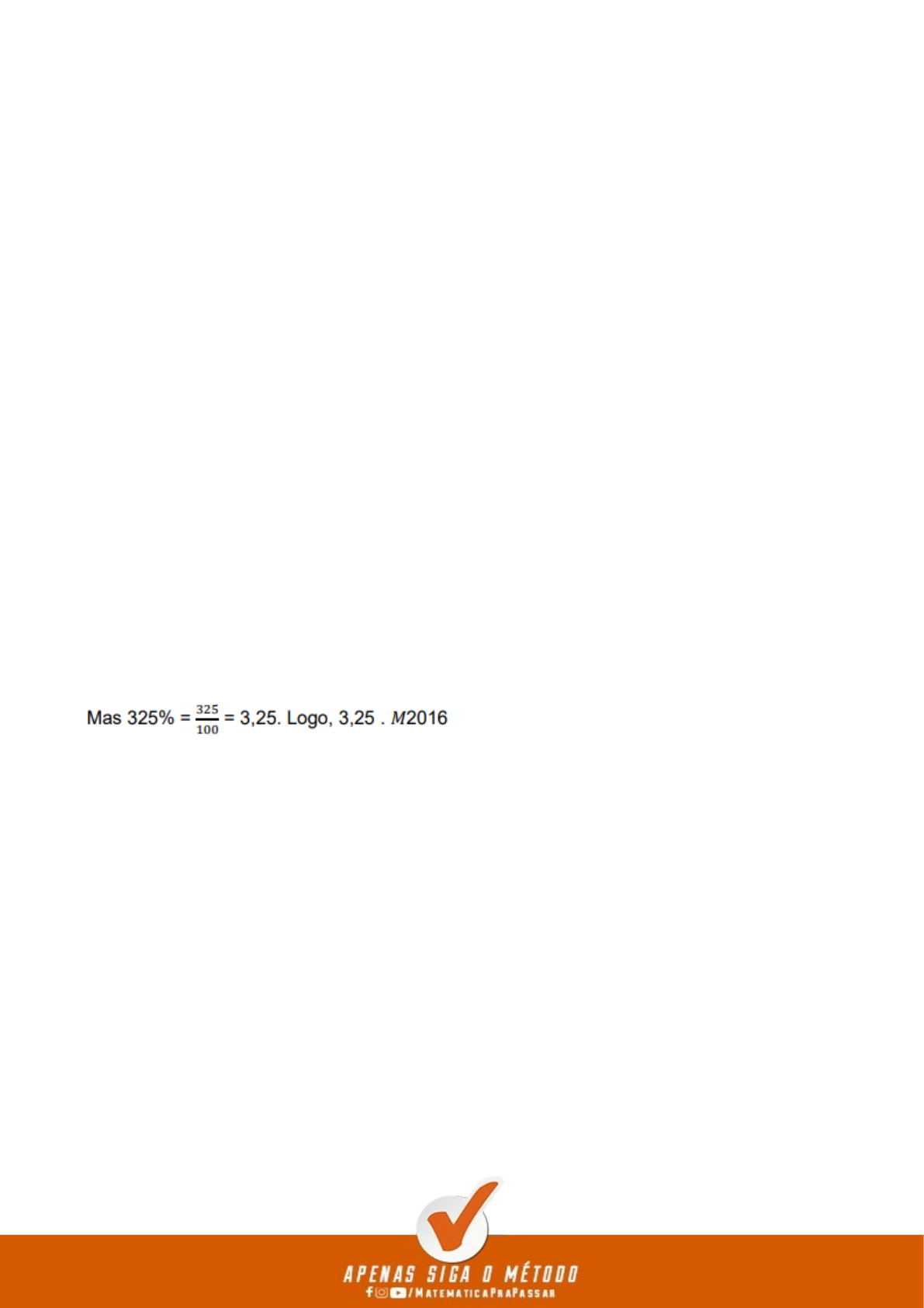 Página 416 ________________________ Desconto de 4% Logo, na loja R o preço do produto P é 3% menor do que na loja de Q Gabarito A 14 - O ano de 2017 foi de crescimento no Porto de São Francisco do Sul. Comprovando as tendências registradas durantetodos os meses do ano, a movimentação final do Porto foi 17% superior do que a registrada em 2016. Ao todo, foram movimentadas 12.188.865 toneladas de mercadorias. Nas movimentações de importação, destaque especial para o trigo,que aumentou 225% em relação às movimentações de 2016.Se considerarmos os dados da notícia e chamarmos de 2016 o número de movimentações da importação de𝑀 trigopara o ano de 2016, então, a expressão que define o número de movimentações da importação de trigo para o ano de2017, conforme indica a notícia será: a) 3,25 . 2016𝑀 b) 2,25 . 2016𝑀 c) 2,25 + 2016 𝑀 d) 225 . 2016𝑀 Resolução da questão Em 2016, havia todo o valor de 2016, isto é, 100% de 2016. Como houve um𝑀 𝑀 acréscimo de 225%, essa porcentagem foi para 325% de 2016 (225% + 100%). 𝑀 Gabarito A 15 - Segundo o jornal O Popular (27 fev. 2011, p. 16), a Petrobrasencerrou o ano de 2010 com um lucro de R$ 35,19bilhões, o que corresponde a um aumento de 17% no lucroda empresa, em relação a 2009. Considerando como xo lucro da empresa em 2009, a equação que permite calcular x é: a) 1,17x = 35,19 b) 0,17x = 35,19 c) 0,83x = 35,19 d) 1,83x = 35,19 Resolução da questão Em 2009, a empresa lucrou x. Se houve um aumento de 17%, logo: x + 17% de x = 117% de x = 1,17x