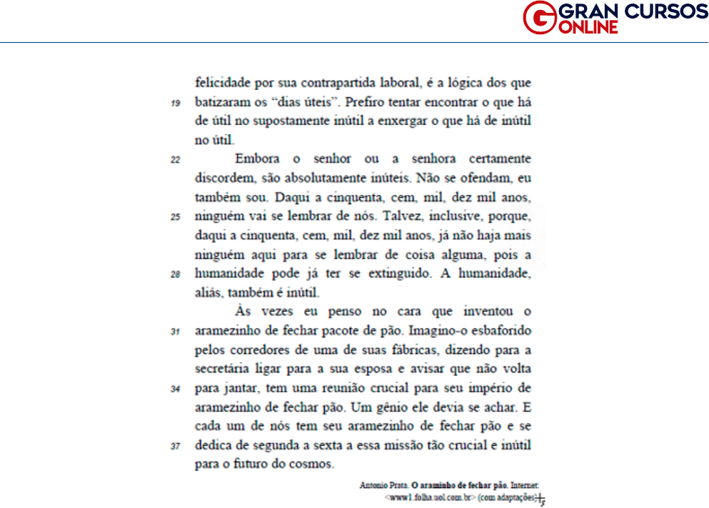 41 www.grancursosonline.com.br Cebraspe (CESPE/UnB) 2019 SELEÇÃO DE QUESTÕES A respeito dos sentidos e dos aspectos linguísticos do texto CB1A1-II, julgue os itens que se seguem. 133. (SERVIÇO DE LIMPEZA URBANA – DF/ANALISTA DE GESTÃO DE RESÍDUOS SÓLI- DOS – ÁREA ADMINISTRAÇÃO) O nível de formalidade do texto seria alterado caso a expressão “faz de você” (l.10) fosse substituída por lhe tornam, mas os sentidos originais e a correção gramatical do texto seriam mantidos. 134. (SERVIÇO DE LIMPEZA URBANA – DF/ANALISTA DE GESTÃO DE RESÍDUOS SÓLI- DOS – ÁREA ADMINISTRAÇÃO) Os sentidos e a correção gramatical do texto seriam preservados caso a expressão “cada um de nós” (l.36) fosse substituída por todos nós. 135. (SERVIÇO DE LIMPEZA URBANA – DF/ANALISTA DE GESTÃO DE RESÍDUOS SÓ- LIDOS – ÁREA ADMINISTRAÇÃO) O autor empregou a expressão “absolutamente inú- teis” (l.23) em referência ao conceito de dias úteis, visando criticá-lo. 136. (SERVIÇO DE LIMPEZA URBANA – DF/ANALISTA DE GESTÃO DE RESÍDUOS SÓ- LIDOS – ÁREA ADMINISTRAÇÃO) Com a afirmação de que “cada um de nós tem seu aramezinho de fechar pão” (l.36), o texto sugere que tanto o autor quanto os leitores têm atividades profissionais que, quando avaliadas objetivamente e com cuidado, mostram- -se totalmente desnecessárias ao mundo.