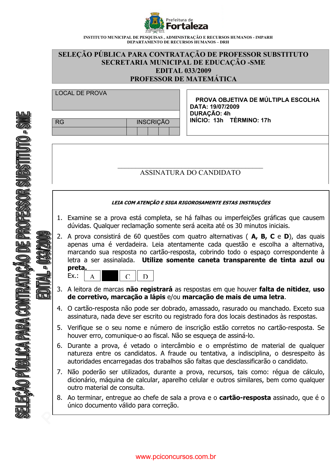 pcimarkpci MDAwMDowMDAwOjAwMDA6MDAwMDowMDAwOmZmZmY6YjEzMzoyMjEw:TW9uLCAyOCBPY3QgMjAyNCAwMDozNDo0NyAtMDMwMA== www.pciconcursos.com.br INSTITUTO MUNICIPAL DE PESQUISAS , ADMINISTRAÇÃO E RECURSOS HUMANOS - IMPARH DEPARTAMENTO DE RECURSOS HUMANOS – DRH SELEÇÃO PÚBLICA PARA CONTRATAÇÃO DE PROFESSOR SUBSTITUTO SECRETARIA MUNICIPAL DE EDUCAÇÃO -SME EDITAL 033/2009 PROFESSOR DE MATEMÁTICA LEIA COM ATENÇÃO E SIGA RIGOROSAMENTE ESTAS INSTRUÇÕES 1. Examine se a prova está completa, se há falhas ou imperfeições gráficas que causem dúvidas. Qualquer reclamação somente será aceita até os 30 minutos iniciais. 2. A prova consistirá de 60 questões com quatro alternativas ( A, B, C e D), das quais apenas uma é verdadeira. Leia atentamente cada questão e escolha a alternativa, marcando sua resposta no cartão-resposta, cobrindo todo o espaço correspondente à letra a ser assinalada. Utilize somente caneta transparente de tinta azul ou preta. Ex.: 3. A leitora de marcas não registrará as respostas em que houver falta de nitidez, uso de corretivo, marcação a lápis e/ou marcação de mais de uma letra. 4. O cartão-resposta não pode ser dobrado, amassado, rasurado ou manchado. Exceto sua assinatura, nada deve ser escrito ou registrado fora dos locais destinados às respostas. 5. Verifique se o seu nome e número de inscrição estão corretos no cartão-resposta. Se houver erro, comunique-o ao fiscal. Não se esqueça de assiná-lo. 6. Durante a prova, é vetado o intercâmbio e o empréstimo de material de qualquer natureza entre os candidatos. A fraude ou tentativa, a indisciplina, o desrespeito às autoridades encarregadas dos trabalhos são faltas que desclassificarão o candidato. 7. Não poderão ser utilizados, durante a prova, recursos, tais como: régua de cálculo, dicionário, máquina de calcular, aparelho celular e outros similares, bem como qualquer outro material de consulta. 8. Ao terminar, entregue ao chefe de sala a prova e o cartão-resposta assinado, que é o único documento válido para correção. A B C D LOCAL DE PROVA RG INSCRIÇÃO PROVA OBJETIVA DE MÚLTIPLA ESCOLHA DATA: 19/07/2009 DURAÇÃO: 4h INÍCIO: 13h TÉRMINO: 17h _________________________________________ ASSINATURA DO CANDIDATO www.pciconcursos.com.br pcimarkpci MDAwMDowMDAwOjAwMDA6MDAwMDowMDAwOmZmZmY6YjEzMzoyMjEw:TW9uLCAyOCBPY3QgMjAyNCAwMDozNDo0NyAtMDMwMA== www.pciconcursos.com.br INSTITUTO MUNICIPAL DE PESQUISA, ADMINISTRAÇÃO E RECURSOS HUMANOS – IMPARH Prova aplicada em 19 de julho de 2009. _____________________________________________________________________________________________________ 2 PROVA OBJETIVA: Este Caderno de Prova contém 60 (sessenta) questões, numeradas de 01 a 60, todas com 04 (quatro) alternativas. Verifique se o caderno está completo ou se há imperfeições. Nesses casos, informe, imediatamente, ao fiscal. Marque seu cartão-resposta pintando completamente o quadrinho correspondente à sua resposta, conforme o modelo: O texto servirá de suporte para as questões de 1 a 7. Dizer e suas consequências 1. Muitas coisas se dizem, que não deveriam ser ditas; muitas outras se calam, que não mereciam calar-se. As palavras são as mesmas, em um e outro caso: só a conveniência delas, na circunstância, é que varia. E na variação, fica o dito por não dito. A menos que o convicto (ou o teimoso) diga: “Digo e repito”. 6. Também cabe referir aquelas coisas manifestadas com a ressalva: “Diga- se de passagem”. Em geral, são as que não passam, as mais relevantes no discurso, e a matéria que parecia principal descolore em função do que parecia acessório. 10. Dizer, bendizer, maldizer, confundem-se na massa de sons. Tudo depende da mesma boca, mas vozes diferentes atropelam-se nesse anunciar-se de juízos, interesses, paixões e estado de espírito que se desmentem uns aos outros. Contradizer-se é ainda uma solução para o conflito que nossos impulsos sucessivos travam por meio e à custa de palavras. 15. É tão incoerente essa trama verbal a desenvolver-se no tempo, que se procura dar-lhe nexo, apelando para fórmulas: “Como eu ia dizendo...” “O que é mesmo que eu estava dizendo?” O dizer de um precisa ser acionado pelo dizer do outro, e do acoplamento (linguagem espacial em curso) dos dizeres surge novo dizer, que é o anterior e é o outro. De modo que ninguém diz propriamente o que diz, mas só o que lhe ocorre (se ocorre) dizer, ou lhe é soprado na ocasião. 22. (...) 23. Entre o dizível e o indizível balança a criação do poeta, flutua o êxtase dos namorados. Dizer o que jamais soube ser dito, aspiração de manipulador de vocábulos, que talvez nem saiba dizer o sabido. Haverá algo a dizer, absolutamente inefável, que nem os anjos conseguissem exprimir nem os homens entender? (ANDRADE, Carlos Drummond de: “Dizer e suas conseqüências”. In Os Dias Lindos – Crônicas.) A B C D www.pciconcursos.com.br pcimarkpci MDAwMDowMDAwOjAwMDA6MDAwMDowMDAwOmZmZmY6YjEzMzoyMjEw:TW9uLCAyOCBPY3QgMjAyNCAwMDozNDo0NyAtMDMwMA== www.pciconcursos.com.br INSTITUTO MUNICIPAL DE PESQUISA, ADMINISTRAÇÃO E RECURSOS HUMANOS – IMPARH Prova aplicada em 19 de julho de 2009. _____________________________________________________________________________________________________ 3 01. Observando o tipo de composição do texto, conclui-se que ele é a) narrativo; b) descritivo; c) dissertativo; d) expositivo. 02. Sobre o texto não é correto afirmar que: a) enfatiza a imprecisão da linguagem; b) fala das condições e contradições do dizer; c) revela que aquilo que se diz independe das circunstâncias em que se diz; d) mostra que a interação entre as pessoas é a fonte que aciona a linguagem. 03. Em “e a matéria que parecia principal descolore em função do que parecia acessório”. Indique a relação de sentido que as palavras sublinhadas estabelecem entre si. a) sinonímia; b) antonímia; c) paronímia; d) hiponímia. 04. As palavras de