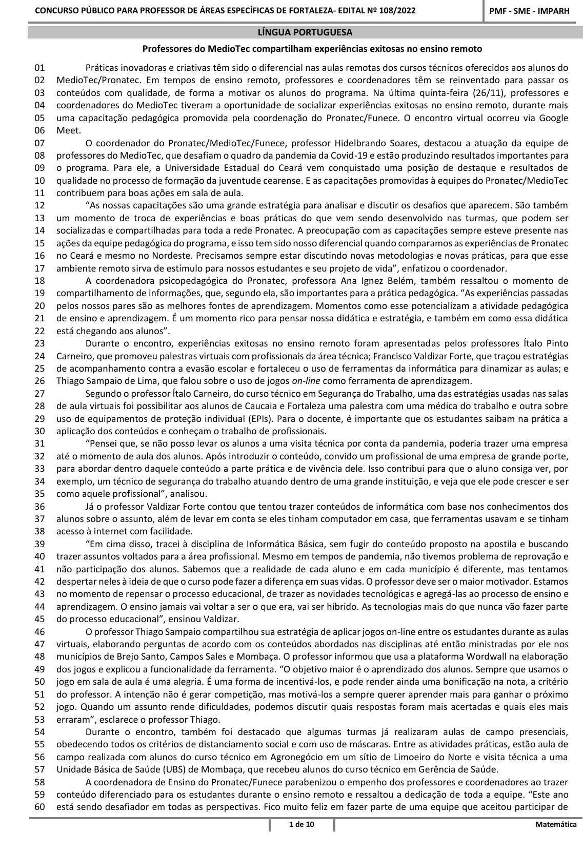 pcimarkpci MDAwMDowMDAwOjAwMDA6MDAwMDowMDAwOmZmZmY6YjEzMzoyMjEw:TW9uLCAyOCBPY3QgMjAyNCAwMDoyNzo0NyAtMDMwMA== www.pciconcursos.com.br CONCURSO PÚBLICO PARA PROFESSOR DE ÁREAS ESPECÍFICAS DE FORTALEZA- EDITAL Nº 108/2022 PMF - SME - IMPARH 1 de 10 Matemática LÍNGUA PORTUGUESA Professores do MedioTec compartilham experiências exitosas no ensino remoto 01 02 03 04 05 06 07 08 09 10 11 12 13 14 15 16 17 18 19 20 21 22 23 24 25 26 27 28 29 30 31 32 33 34 35 36 37 38 39 40 41 42 43 44 45 46 47 48 49 50 51 52 53 54 55 56 57 58 59 60 Práticas inovadoras e criativas têm sido o diferencial nas aulas remotas dos cursos técnicos oferecidos aos alunos do MedioTec/Pronatec. Em tempos de ensino remoto, professores e coordenadores têm se reinventado para passar os conteúdos com qualidade, de forma a motivar os alunos do programa. Na última quinta-feira (26/11), professores e coordenadores do MedioTec tiveram a oportunidade de socializar experiências exitosas no ensino remoto, durante mais uma capacitação pedagógica promovida pela coordenação do Pronatec/Funece. O encontro virtual ocorreu via Google Meet. O coordenador do Pronatec/MedioTec/Funece, professor Hidelbrando Soares, destacou a atuação da equipe de professores do MedioTec, que desafiam o quadro da pandemia da Covid-19 e estão produzindo resultados importantes para o programa. Para ele, a Universidade Estadual do Ceará vem conquistado uma posição de destaque e resultados de qualidade no processo de formação da juventude cearense. E as capacitações promovidas à equipes do Pronatec/MedioTec contribuem para boas ações em sala de aula. “As nossas capacitações são uma grande estratégia para analisar e discutir os desafios que aparecem. São também um momento de troca de experiências e boas práticas do que vem sendo desenvolvido nas turmas, que podem ser socializadas e compartilhadas para toda a rede Pronatec. A preocupação com as capacitações sempre esteve presente nas ações da equipe pedagógica do programa, e isso tem sido nosso diferencial quando comparamos as experiências de Pronatec no Ceará e mesmo no Nordeste. Precisamos sempre estar discutindo novas metodologias e novas práticas, para que esse ambiente remoto sirva de estímulo para nossos estudantes e seu projeto de vida”, enfatizou o coordenador. A coordenadora psicopedagógica do Pronatec, professora Ana Ignez Belém, também ressaltou o momento de compartilhamento de informações, que, segundo ela, são importantes para a prática pedagógica. “As experiências passadas pelos nossos pares são as melhores fontes de aprendizagem. Momentos como esse potencializam a atividade pedagógica de ensino e aprendizagem. É um momento rico para pensar nossa didática e estratégia, e também em como essa didática está chegando aos alunos”. Durante o encontro, experiências exitosas no ensino remoto foram apresentadas pelos professores Ítalo Pinto Carneiro, que promoveu palestras virtuais com profissionais da área técnica; Francisco Valdizar Forte, que traçou estratégias de acompanhamento contra a evasão escolar e fortaleceu o uso de ferramentas da informática para dinamizar as aulas; e Thiago Sampaio de Lima, que falou sobre o uso de jogos on-line como ferramenta de aprendizagem. Segundo o professor Ítalo Carneiro, do curso técnico em Segurança do Trabalho, uma das estratégias usadas nas salas de aula virtuais foi possibilitar aos alunos de Caucaia e Fortaleza uma palestra com uma médica do trabalho e outra sobre uso de equipamentos de proteção individual (EPIs). Para o docente, é importante que os estudantes saibam na prática a aplicação dos conteúdos e conheçam o trabalho de profissionais. “Pensei que, se não posso levar os alunos a uma visita técnica por conta da pandemia, poderia trazer uma empresa até o momento de aula dos alunos. Após introduzir o conteúdo, convido um profissional de uma empresa de grande porte, para abordar dentro daquele conteúdo a parte prática e de vivência dele. Isso contribui para que o aluno consiga ver, por exemplo, um técnico de segurança do trabalho atuando dentro de uma grande instituição, e veja que ele pode crescer e ser como aquele profissional”, analisou. Já o professor Valdizar Forte contou que tentou trazer conteúdos de informática com base nos conhecimentos dos alunos sobre o assunto, além de levar em conta se eles tinham computador em casa, que ferramentas usavam e se tinham acesso à internet com facilidade. “Em cima disso, tracei à disciplina de Informática Básica, sem fugir do conteúdo proposto na apostila e buscando trazer assuntos voltados para a área profissional. Mesmo em tempos de pandemia, não tivemos problema de reprovação e não participação dos alunos. Sabemos que a realidade de cada aluno e em cada município é diferente, mas tentamos despertar neles à ideia de que o curso pode fazer a diferença em suas vidas. O professor deve ser o maior motivador. Estamos no momento de repensar o processo educacional, de trazer as novidades tecnológicas e agregá-las ao processo de ensino e aprendizagem. O ensino jamais vai voltar a ser o que era, vai ser híbrido. As tecnologias mais do que nunca vão fazer parte do processo educacional”, ensinou Valdizar. O professor Thiago Sampaio compartilhou sua estratégia de aplicar jogos on-line entre os estudantes durante as aulas virtuais, elaborando perguntas de acordo com os conteúdos abordados nas disciplinas até então ministradas por ele nos municípios de Brejo Santo, Campos Sales e Mombaça. O professor informou que usa a plataforma Wordwall na elaboração dos jogos e explicou a funcionalidade da ferramenta. “O objetivo maior é o aprendizado dos alunos. Sempre que usamos o jogo em sala de aula é uma alegria. É uma forma de incentivá-los, e pode render ainda uma bonificação na nota, a critério do professor. A intenção não é gerar competição, mas motivá-los a sempre querer aprend