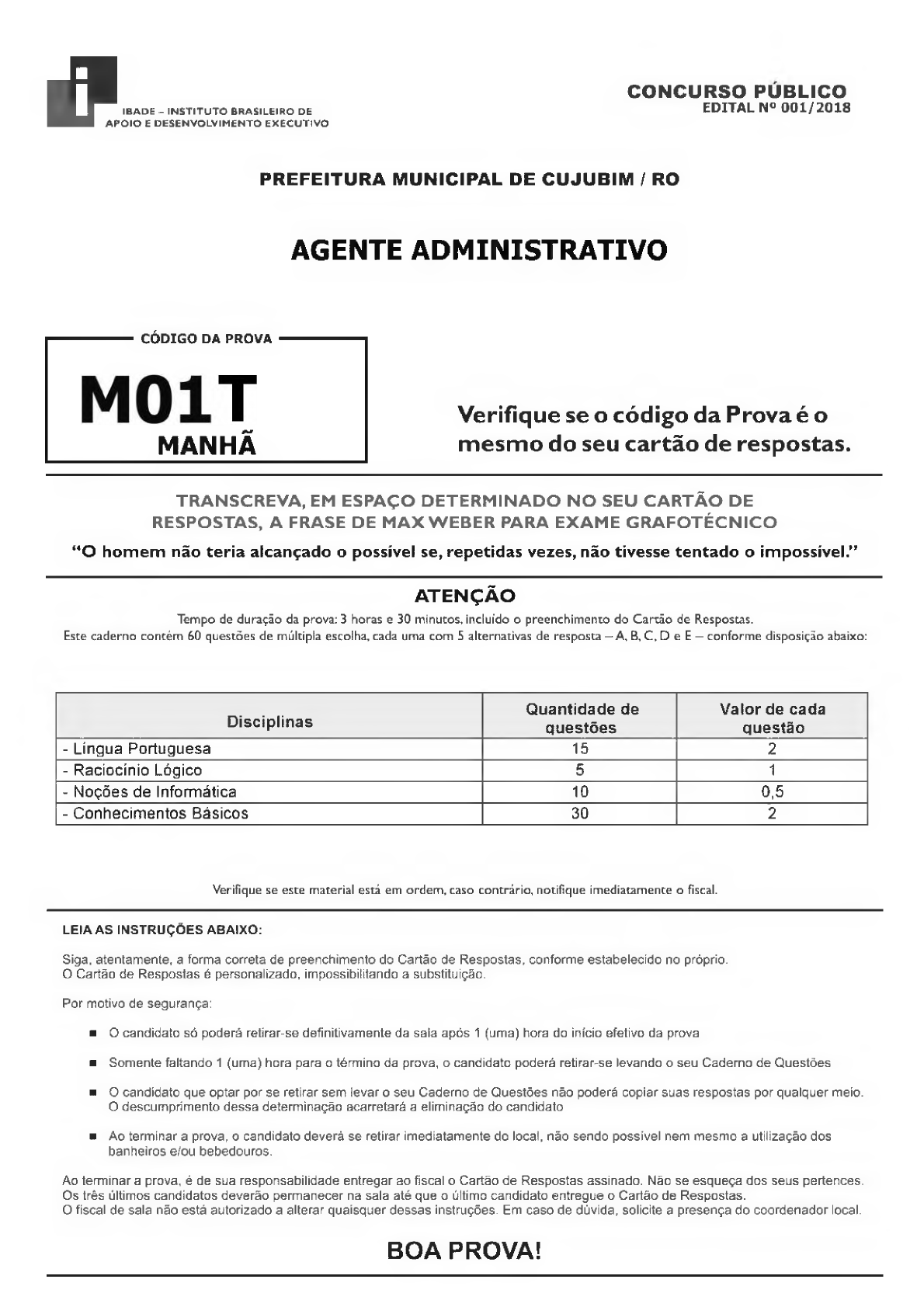 0 IBADE - IN S TITU TO BRASILEIRO DE A PO IO E DESENVOLVIMENTO EXECUTIVO CO NCURSO PUBLICO EDITAL N° 001/2018 PREFEITURA MUNICIPAL DE CUJUBIM / RO AGENTE ADMINISTRATIVO CÓDIGO DA PROVA --------------- Verifique se o código da Prova é o MANHÃ mesmo do seu cartão de respostas. TRANSCREVA, EM ESPAÇO D ETER M IN A D O N O SEU CARTÃO DE RESPOSTAS, A FRASE DE M A X W EBER PARA EXAME G RAFO TÉCN IC O “O homem não teria alcançado o possível se, repetidas vezes, não tivesse tentado o impossível.” ATENÇÃO Tempo de duração da prova: 3 horas e 30 minutos, incluído o preenchimento do Cartão de Respostas. Este caderno contém 60 questões de múltipla escolha, cada uma com 5 alternativas de resposta — A, B, C, D e E — conforme disposição abaixo: Disciplinas Quantidade de questões Valor de cada questão - Língua Portuguesa 15 2 - Raciocínio Lógico 5 1 - Noções de Informática 10 0,5 - Conhecimentos Básicos 30 2 Verifique se este material está em ordem, caso contrário, notifique imediatamente o fiscal. LEIA AS INSTRUÇÕES ABAIXO: Siga, atentamente, a forma correta de preenchimento do Cartão de Respostas, conforme estabelecido no próprio. O Cartão de Respostas é personalizado, impossibilitando a substituição. Por motivo de segurança: ■ O candidato só poderá retirar-se definitivamente da sala após 1 (uma) hora do inicio efetivo da prova ■ Somente faltando 1 (uma) hora para o término da prova, o candidato poderá retirar-se levando o seu Caderno de Questões ■ O candidato que optar por se retirar sem levar o seu Caderno de Questões não poderá copiar suas respostas por qualquer meio. O descumprimento dessa determinação acarretará a eliminação do candidato ■ Ao terminar a prova, o candidato deverá se retirar imediatamente do local, não sendo possível nem mesmo a utilização dos banheiros e/ou bebedouros. Ao terminar a prova, é de sua responsabilidade entregar ao fiscal o Cartão de Respostas assinado. Não se esqueça dos seus pertences. Os três últimos candidatos deverão permanecer na sala até que o último candidato entregue o Cartão de Respostas. O fiscal de sala não está autorizado a alterar quaisquer dessas instruções. Em caso de dúvida, solicite a presença do coordenador local. BOA PROVA! Ç LÍNGUA PORTUGUESA ) Minimalismo Tenho uma amiga que mora na Europa há anos. Vive com a filha num apartamento de frente para um parque, tem um carro, um emprego e um namorado. Em tese, ela não tem do que se queixar, mas conversávamos outro dia sobre o que significa estar “tudo bem”. Para ela, “tudo bem” é experimentar novas formas de existir. A gente assina um contrato de locação de um imóvel, se acostuma com a mercearia da esquina e quando vê está enraizado num estilo de vida que se repete dia após dia, sem testar nosso espanto, nossa coragem, nossa adaptação ao novo. Humm. O que você está inventando? Perguntei a ela. - Vou morar num barco. Ainda bem que eu estava sentada. Pensei: “Essa garota é maluca”. E logo: “Que inveja”. Tenho zero vontade de morar num barco. Minha inveja foi do desapego e da facilidade com que ela escreve capítulos surpreendentes da sua biografia. “Tenho coisas demais, Martha. Livros demais, roupas demais, móveis demais. Está na hora de viver com menos para poder redefinir o significado de espaço, tempo, silêncio”. O gatilho da nossa conversa foi o documentário Minimalism (disponível no Netflix), que escancara a estupidez do consumo compulsivo, como se ele pudesse preencher nosso vazio. Vazio se preenche com arte, amor, amigos e uma cabeça boa. Consumir feito loucos só produz dívidas e ansiedade. Temos perdido tempo, nas redes sociais, criticando o bandido dos outros e defendendo o nosso, sem refletir que o caos político e social tem a mesma fonte: nossa relação doentia com o dinheiro. A ideia de “poder” deveria estar associada à gestão do ócio, às relações afetivas, ao contato com a natureza e à eficiência em manter um cotidiano íntegro, produtivo e confortável (nada contra o conforto), no entanto, “poder” hoje é sinônimo de hierarquia, acúmulo de bens, ostentação e lucratividade non-stop. É por isso que, para tantas pessoas, é natural incorporar benefícios imorais ao salário, ganhar agrados de empreiteiras e fazer alianças com pessoas sem afinidades, mas que um dia poderão vir a ser úteis. A sociedade não se dá conta do grau de frustração que ela mesma produz e continua cedendo a impulsos. Uma vez, eu estava na National Portrait Gallery, em Londres, quando, na saída, passei pela loja do museu e percebi, ao lado do caixa, um aquário cheio de latinhas de metal à venda, pouco maiores que uma moeda. Era manteiga de cacau no sabor “chocolate & mint” . Sem hesitar, comprei uma latinha e trouxe-a comigo para o Brasil: hoje ela reside na bancada do banheiro, intocada, para me lembrar de como se pode ser idiota - eu estava dentro de um dos maiores museus do mundo e mesmo assim fiquei tentada a comprar a primeira besteira que vi. O exemplo é bobo, mas ilustrativo de como certos gritos ecoam dentro de nós 24 horas: Compre! Leve! Aproveite! Você nunca mais será o mesmo depois de usar a triunfante manteiga de cacau da National Gallery! O único excesso que preciso é de consciência para não me deixar abduzir por essa forma equivocada de dar sentido à vida. Martha Medeiros. Disponível em:. Acesso em10 ago. 2018 (Questão 01 )--------------------------------------------------------- Pelo final do texto, conclui-se que, para a narradora: A) o problema do consnmismo esta no exagero. B) se convenceu de que o consumo traz felicidade. C) se opõe a qualquer tipo de consumo. D) n e c e s s á r i o q u e h a ja c a m p a n h a s anticonsumismo. E) consumir faz parte de nossa natureza, por isso somos consumistas. (Questão 02 )--------------------------------------------------------- Comparando os trechos entre aspas, no terceiro par