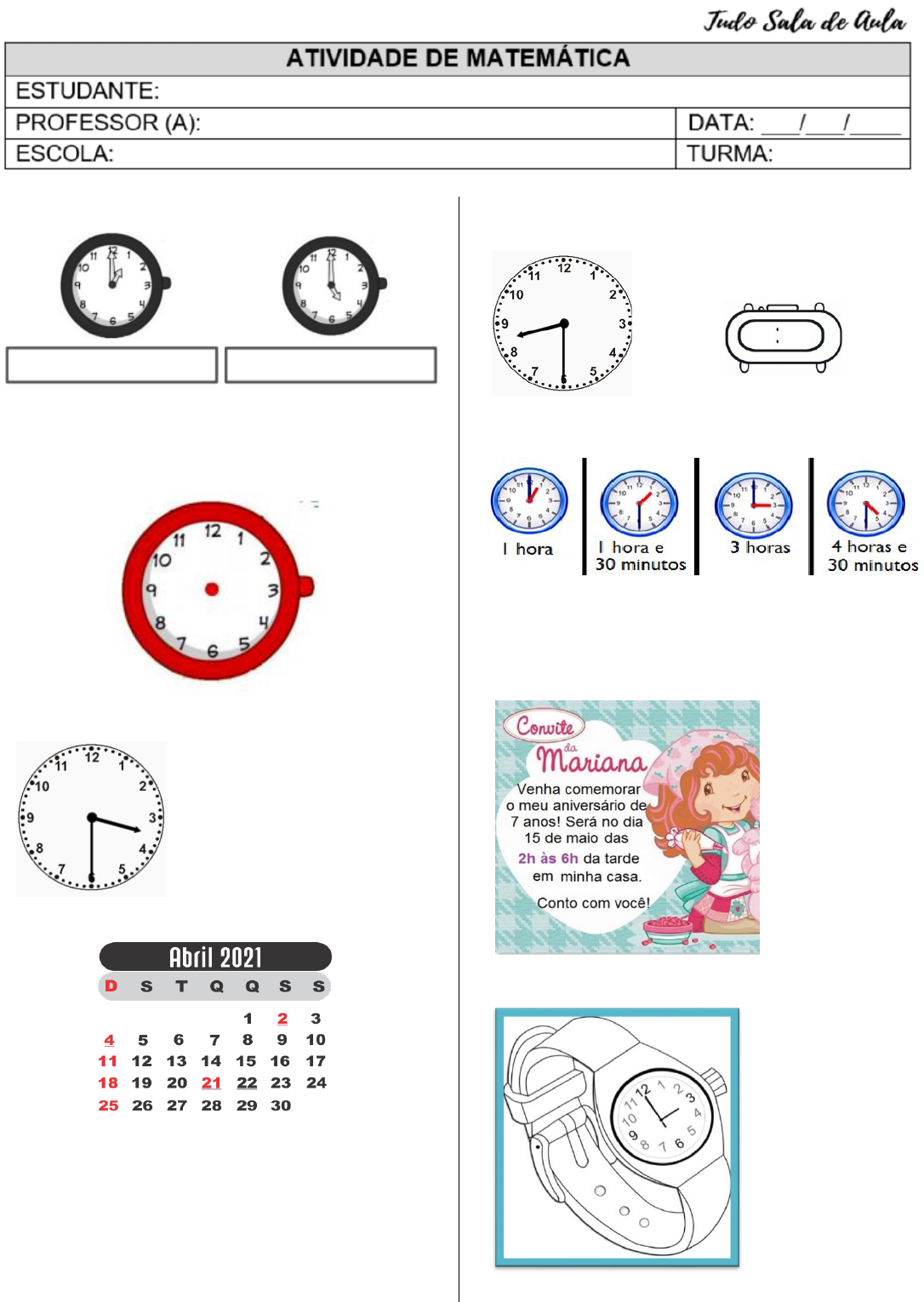1. Escreva o horário que os relógios estão marcando: 2. A família de Isadora almoça sempre às 12 horas. Sua mãe chegou em casa 1 hora antes do almoço. Faça o desenho dos ponteiros no relógio que marca o horário que a Mãe de Isadora chega em casa: 3. Observe o relógio abaixo: O relógio está marcando: a) 6:00 b) 3:00 c) 3:30 d) 4:30 4. Observe o calendário abaixo e responda às perguntas: a) Em que dia da semana começa o mês acima? __________________________________________ b) Em que dia da semana termina o mês acima? __________________________________________ c) Quantos sábados tem o mês de abril de 2021? __________________________________________ 5. Observe o horário que um homem chega do trabalho em casa: O trabalhador chega em casa às 6. Edmar chega à escola 1 hora da tarde. A hora do recreio é duas horas depois. Que horas é o recreio nessa escola? a) 1:00 b) 1:30 c) 3:00 d) 4:30 7. Veja um convite de aniversário: Quanto tempo vai durar o aniversário? a) 2 horas. b) 4 horas. c) 6 horas. d) 8 horas. 8. Observe a imagem abaixo: Que horas está marcando o relógio? a) 1 hora. b) 2 horas. c) 3 horas. d) 12 horas.
