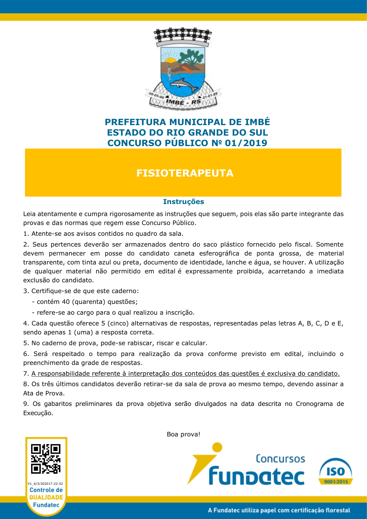 pcimarkpci MjgwNDowN2Y0OmZjODA6NmQzMzpjZGU2OmUxY2E6Y2RmZDoyNGRj:VGh1LCAxNiBNYXIgMjAyMyAyMjoyMzoyMyAtMDMwMA== www.pciconcursos.com.br V1_6/3/202017:22:52 V1_6/3/202017:22:52 PREFEITURA MUNICIPAL DE IMBÉ ESTADO DO RIO GRANDE DO SUL CONCURSO PÚBLICO Nº 01/2019 Instruções Leia atentamente e cumpra rigorosamente as instruções que seguem, pois elas são parte integrante das provas e das normas que regem esse Concurso Público. 1. Atente-se aos avisos contidos no quadro da sala. 2. Seus pertences deverão ser armazenados dentro do saco plástico fornecido pelo fiscal. Somente devem permanecer em posse do candidato caneta esferográfica de ponta grossa, de material transparente, com tinta azul ou preta, documento de identidade, lanche e água, se houver. A utilização de qualquer material não permitido em edital é expressamente proibida, acarretando a imediata exclusão do candidato. 3. Certifique-se de que este caderno: - contém 40 (quarenta) questões; - refere-se ao cargo para o qual realizou a inscrição. 4. Cada questão oferece 5 (cinco) alternativas de respostas, representadas pelas letras A, B, C, D e E, sendo apenas 1 (uma) a resposta correta. 5. No caderno de prova, pode-se rabiscar, riscar e calcular. 6. Será respeitado o tempo para realização da prova conforme previsto em edital, incluindo o preenchimento da grade de respostas. 7. A responsabilidade referente à interpretação dos conteúdos das questões é exclusiva do candidato. 8. Os três últimos candidatos deverão retirar-se da sala de prova ao mesmo tempo, devendo assinar a Ata de Prova. 9. Os gabaritos preliminares da prova objetiva serão divulgados na data descrita no Cronograma de Execução. Boa prova! FISIOTERAPEUTA pcimarkpci MjgwNDowN2Y0OmZjODA6NmQzMzpjZGU2OmUxY2E6Y2RmZDoyNGRj:VGh1LCAxNiBNYXIgMjAyMyAyMjoyMzoyMyAtMDMwMA== www.pciconcursos.com.br 558_LP_NS_21T_19/3/202008:38:11 Execução: Fundatec NÍVEL SUPERIOR LÍNGUA PORTUGUESA Instrução: As questões de números 01 a 10 referem-se ao texto abaixo. Os destaques ao longo do texto estão citados nas questões. Global, social e barato, álcool mata mais que o crack no Brasil e no mundo 01 02 03 04 05 06 07 08 09 10 11 12 13 14 15 16 17 18 19 20 21 22 23 24 25 26 27 28 O rosto marcado pelo tempo esconde a real idade de quem descobriu o álcool ainda muito cedo. “Comecei a misturar bebida no suco aos 8 anos; aos 10, já usava a bebida alcoólica pura”, diz Paulo, de 24 anos. A perna inquieta, que não para de mexer, denuncia o nervosismo em reviver feridas ainda abertas. “Eu me tornei morador de rua depois de vender tudo o que tinha a preço irrisório para poder beber. Cheguei ao ponto de implorar às pessoas R$ 1 para comprar bebida”, afirma Joaquim, de 53. Faltando pouco para receber alta da comunidade terapêutica em que está internado, Geraldo, de 68, não sabe para onde irá. “Não fosse a bebida, teria ainda minha família, que ficou desgostosa a ponto de não me querer mais em casa”, relata. Às vezes, o fundo do poço confronta a própria vida. “Até veneno tomei. Tive quatro convulsões e tentei o suicídio quatro vezes”, conta Carlos, de 39. Os nomes são todos fictícios, mas as histórias, bem reais; são trechos da vida de gente que é o retrato do uso nocivo de uma droga legalizada, socialmente aceita, cercada de publicidade e com ares de charme e poder. Em cada esquina, no bar, no boteco, padarias e supermercados, o álcool está lá, com destaque em gôndolas e prateleiras: latas de cerveja, litros de cachaça, garrafas de uísque. No Brasil e no mundo, ele mata mais que o crack, conforme atesta levantamento da Fundação Osvaldo Cruz (Fiocruz). Em Belo Horizonte, seu número de dependentes é quase o dobro da soma dos dependentes de todos os entorpecentes ilícitos, de acordo com estudo da Universidade Federal de Minas Gerais (UFMG). Mais que um vício, o alcoolismo é uma doença, responsável ainda pela vitimização de um número sem fim de pessoas próximas, os chamados codependentes. O (jornal) Estado de Minas está apresentando uma série de reportagens que mostram os dramas do alcoolismo e como a droga de mais fácil acesso desagrega famílias, arrasa a relação entre pais e filhos, destrói relacionamentos e faz definhar aqueles que a consomem abusivamente. Dados da Organização Mundial de Saúde (OMS) mostram que, no mundo, são registrados todos os anos 3 milhões de mortes resultantes do uso nocivo de álcool, o que representa 5,3% do total de óbitos. O consumo nocivo da bebida é ainda fator causal de mais de 200 doenças e lesões. As consequências aparecem cedo: entre pessoas de 20 a 39 anos, cerca de 13,5% do total de mortes em todo o mundo são atribuíveis ao álcool. (Disponível em: https://www.em.com.br/app/noticia/gerais/2019/11/10/interna_gerais,1099906/global – texto adaptado especialmente para esta prova.) QUESTÃO 01 – Considere o que se afirma sobre o texto: I. O alcoolismo precoce de Paulo deixou-o com aparência de um homem mais velho, embora ele tenha 24 anos. II. Joaquim, por causa do alcoolismo, tem no corpo feridas abertas, que não cicatrizaram. III. Geraldo não é aceito pela família por ser um alcóolatra. IV. Carlos provavelmente acabará se suicidando, visto que já tentou fazer isso antes. Quais encontram respaldo no texto? A) Apenas I e II. B) Apenas I e III. C) Apenas III e IV. D) Apenas II, III e IV. E) I, II, III e IV. QUESTÃO 02 – No texto, álcool e bebida alcoólica são referidos de muitas maneiras. Assinale a alternativa cujo termo NÃO se refere a essas palavras. A) ele (l. 15). B) seu (l. 16). C) droga de mais fácil acesso (l. 21). D) a (l. 23). E) fator causal (l. 26). pcimarkpci MjgwNDowN2Y0OmZjODA6NmQzMzpjZGU2OmUxY2E6Y2RmZDoyNGRj:VGh1LCAxNiBNYXIgMjAyMyAyMjoyMzoyMyAtMDMwMA== www.pciconcursos.com.br 558_LP_NS_21T_19/3/202008:38:11 Execução: Fundatec NÍVEL SUPERIOR QUESTÃO 03 – Assinale a alternativa que faz uma consideração INCORRETA sobre o segu