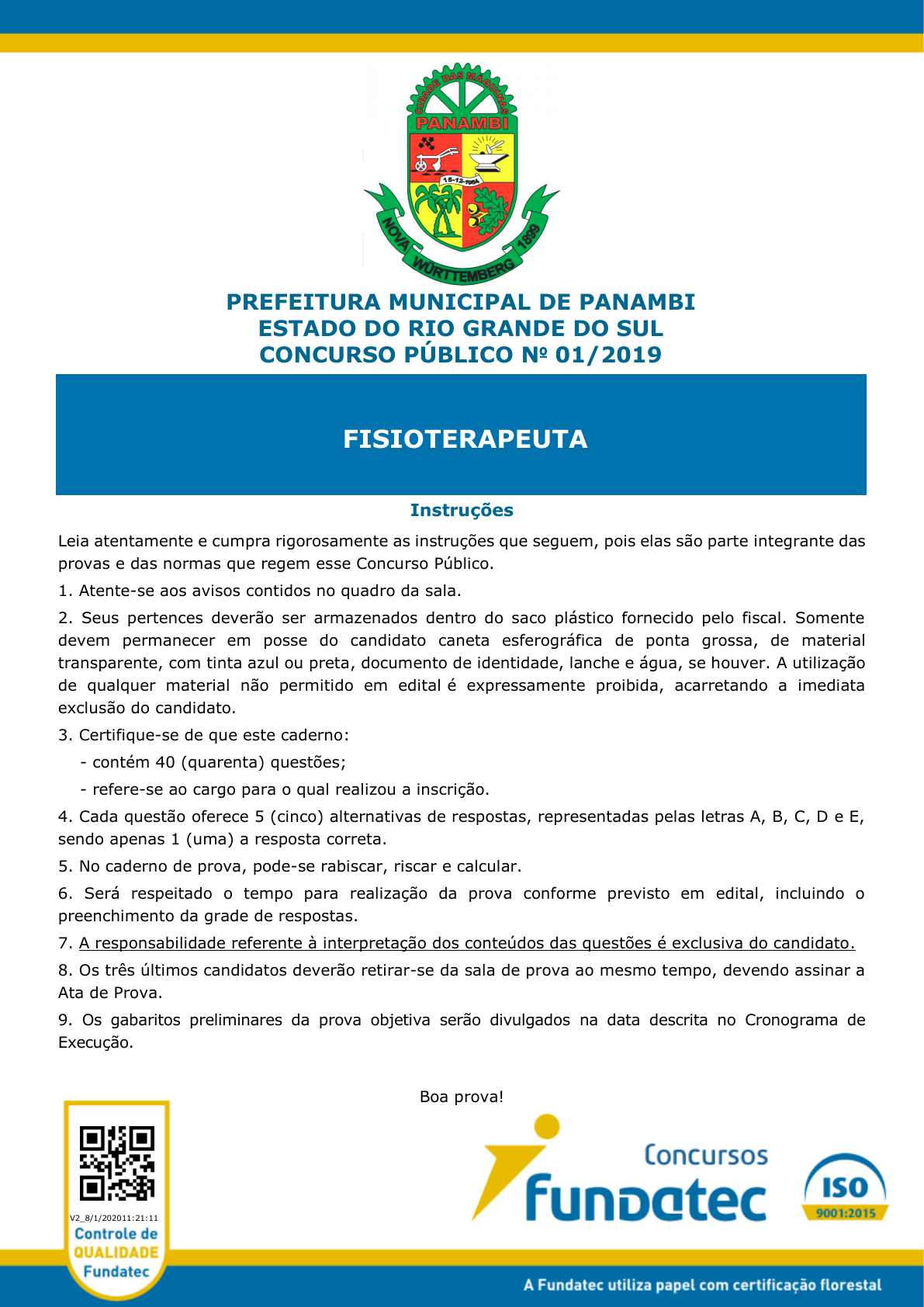 pcimarkpci MjgwNDowN2Y0OmZjODA6NmQzMzpjZGU2OmUxY2E6Y2RmZDoyNGRj:VGh1LCAxNiBNYXIgMjAyMyAyMjoyNDo0OCAtMDMwMA== www.pciconcursos.com.br V1_8/1/202011:21:11 V2_8/1/202011:21:11 PREFEITURA MUNICIPAL DE PANAMBI ESTADO DO RIO GRANDE DO SUL CONCURSO PÚBLICO Nº 01/2019 Instruções Leia atentamente e cumpra rigorosamente as instruções que seguem, pois elas são parte integrante das provas e das normas que regem esse Concurso Público. 1. Atente-se aos avisos contidos no quadro da sala. 2. Seus pertences deverão ser armazenados dentro do saco plástico fornecido pelo fiscal. Somente devem permanecer em posse do candidato caneta esferográfica de ponta grossa, de material transparente, com tinta azul ou preta, documento de identidade, lanche e água, se houver. A utilização de qualquer material não permitido em edital é expressamente proibida, acarretando a imediata exclusão do candidato. 3. Certifique-se de que este caderno: - contém 40 (quarenta) questões; - refere-se ao cargo para o qual realizou a inscrição. 4. Cada questão oferece 5 (cinco) alternativas de respostas, representadas pelas letras A, B, C, D e E, sendo apenas 1 (uma) a resposta correta. 5. No caderno de prova, pode-se rabiscar, riscar e calcular. 6. Será respeitado o tempo para realização da prova conforme previsto em edital, incluindo o preenchimento da grade de respostas. 7. A responsabilidade referente à interpretação dos conteúdos das questões é exclusiva do candidato. 8. Os três últimos candidatos deverão retirar-se da sala de prova ao mesmo tempo, devendo assinar a Ata de Prova. 9. Os gabaritos preliminares da prova objetiva serão divulgados na data descrita no Cronograma de Execução. Boa prova! FISIOTERAPEUTA pcimarkpci MjgwNDowN2Y0OmZjODA6NmQzMzpjZGU2OmUxY2E6Y2RmZDoyNGRj:VGh1LCAxNiBNYXIgMjAyMyAyMjoyNDo0OCAtMDMwMA== www.pciconcursos.com.br Não é à toa, no entanto, que a homeopatia se popularizou: entre sangrar até ____ morte 544_LP_NS_15/1/202009:39:52 Execução: Fundatec NÍVEL SUPERIOR LÍNGUA PORTUGUESA Instrução: As questões de números 01 a 10 referem-se ao texto abaixo. Os destaques ao longo do texto estão citados nas questões. O futuro da homeopatia 01 02 03 04 05 06 07 08 09 10 11 12 13 14 15 16 17 18 19 20 21 22 23 24 25 26 27 28 29 30 31 32 33 34 35 36 37 38 39 40 41 42 43 O médico alemão Samuel Hanehmann criou a homeopatia no início do século 19 como uma alternativa razoável ____ medicina convencional da época, cuja terapia mais comum era a sangria: abrir cortes nos doentes na esperança ____ a hemorragia reestabelecesse o equilíbrio aos fluidos corporais. Tal insanidade era tida como cura para qualquer coisa, de gripe a convulsões, e – portanto – foi praxe na Europa por 2 mil anos. Hanehmann baseou sua tese em dois princípios. O primeiro é o de que semelhantes curam semelhantes: a crença de que o remédio ideal para um sintoma é alguma substância que cause esse sintoma. Por exemplo: se você tem rinite alérgica, a ingestão de uma pequena quantidade de cebola supostamente faria seus olhos pararem de lacrimejar. O antraz, toxina produzida pela bactéria Bacillus anthracis, que causa feridas na pele, seria capaz de curar espinhas, furúnculos etc. Há até um caso documentado de médico que receitou pedaços do muro de Berlim para uma mulher depressiva – afinal, é inegável que a construção deprimiu os berlinenses. O segundo princípio é o da potenciação, isto é, a substância é diluída em água, álcool ou açúcar muitas e muitas vezes. A diluição mais comum é a chamada C30, o que significa que a substância ativa foi diluída 30 vezes na proporção de 100 para 1. “Para conter uma única molécula de substância ativa, a pílula homeopática nessa diluição teria que ter o diâmetro equivalente ____ distância entre o Sol e a Terra [149,6 milhões de quilômetros]”, diz Edzard Ernst, professor emérito da Universidade de Exeter, na Inglaterra. E completa: “os remédios homeopáticos mais comuns não contêm uma única molécula de princípio ativo”. Ao longo de todo o processo, os médicos e farmacêuticos tomam três precauções para evitar conclusões enviesadas. Primeiro, a amostra de voluntários é dividida em dois (grupos de comparação). Metade toma o remédio em fase experimental; a outra metade toma um remédio já existente no mercado ou um placebo, ou seja, um comprimido ou injeção falsos, que não contêm o princípio ativo. Os voluntários devem ser sorteados entre os dois grupos (aleatorização). Por fim, o ideal é que o experimento seja duplo-cego, ou seja: que, durante sua realização, nem os cientistas nem os voluntários saibam qual é o grupo que tomou placebo e qual é o grupo que tomou o remédio real. Assim, a chance de uma falcatrua passar batida é baixa. Ou o remédio funciona, ou não. Dado que a homeopatia permanece popular de sua criação até hoje, é imprescindível que sua eficácia seja analisada com o mesmo critério e cuidado dos remédios convencionais. Da mesma forma que a sangria caiu em desuso quando foi estabelecido que ela faz mais mal do que bem, é essencial que a população tenha acesso a estudos confiáveis sobre a eficácia da técnica de Hanehmann para decidir se deve usá-la ou não. (Disponível em: https://super.abril.com.br/especiais/o-novo-obscurantismo/ – texto adaptado especialmente para esta prova.) QUESTÃO 01 – Assinale a alternativa que preenche as lacunas das linhas 02, 03, 17 e 20, correta e respectivamente. A) da – que – a – à B) à – de que – à – a C) a – da qual – da – a D) à – da qual – a – à E) para a – que – da – a e ingerir algumas gotas de água ou álcool, a segunda alternativa é melhor. Cebola, antraz ou muro de Berlim não farão nenhum efeito – principalmente na diluição C30 –, mas uma consulta com um médico atencioso, que prescreve repouso e deixa seu sistema imunológico funcionar, é mais recomendável do