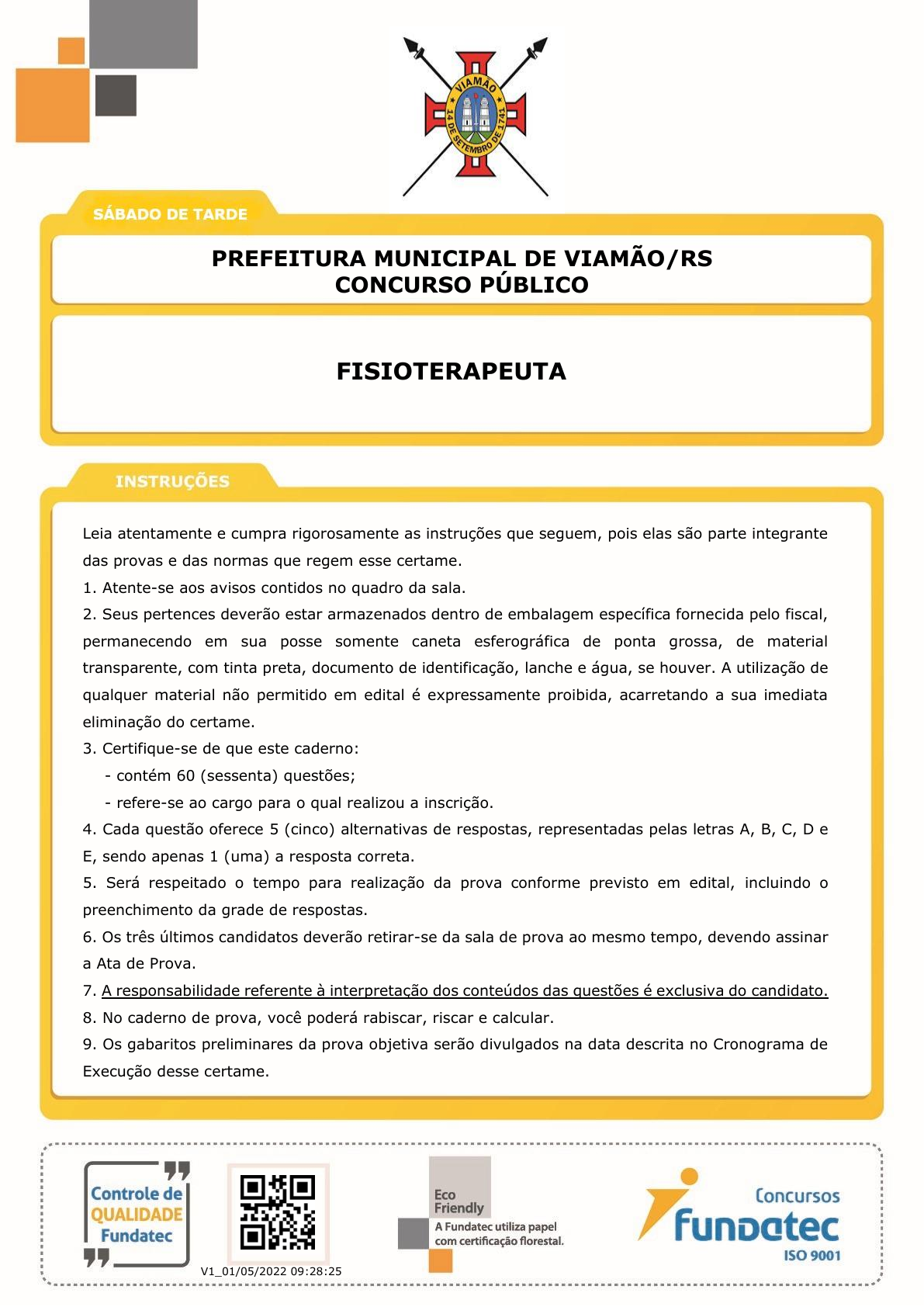 pcimarkpci MjgwNDowN2Y0OmZjODA6NmQzMzpjZGU2OmUxY2E6Y2RmZDoyNGRj:VGh1LCAxNiBNYXIgMjAyMyAyMjowMTowMSAtMDMwMA== www.pciconcursos.com.br PREFEITURA MUNICIPAL DE VIAMÃO/RS CONCURSO PÚBLICO QR code V1_01/05/2022 09:28:25 Leia atentamente e cumpra rigorosamente as instruções que seguem, pois elas são parte integrante das provas e das normas que regem esse certame. 1. Atente-se aos avisos contidos no quadro da sala. 2. Seus pertences deverão estar armazenados dentro de embalagem específica fornecida pelo fiscal, permanecendo em sua posse somente caneta esferográfica de ponta grossa, de material transparente, com tinta preta, documento de identificação, lanche e água, se houver. A utilização de qualquer material não permitido em edital é expressamente proibida, acarretando a sua imediata eliminação do certame. 3. Certifique-se de que este caderno: - contém 60 (sessenta) questões; - refere-se ao cargo para o qual realizou a inscrição. 4. Cada questão oferece 5 (cinco) alternativas de respostas, representadas pelas letras A, B, C, D e E, sendo apenas 1 (uma) a resposta correta. 5. Será respeitado o tempo para realização da prova conforme previsto em edital, incluindo o preenchimento da grade de respostas. 6. Os três últimos candidatos deverão retirar-se da sala de prova ao mesmo tempo, devendo assinar a Ata de Prova. 7. A responsabilidade referente à interpretação dos conteúdos das questões é exclusiva do candidato. 8. No caderno de prova, você poderá rabiscar, riscar e calcular. 9. Os gabaritos preliminares da prova objetiva serão divulgados na data descrita no Cronograma de Execução desse certame. FISIOTERAPEUTA pcimarkpci MjgwNDowN2Y0OmZjODA6NmQzMzpjZGU2OmUxY2E6Y2RmZDoyNGRj:VGh1LCAxNiBNYXIgMjAyMyAyMjowMTowMSAtMDMwMA== www.pciconcursos.com.br 649_BASE_LP_MAT_TODOS_NS_ST_2/5/202215:55:33 Execução: Fundatec NÍVEL SUPERIOR LÍNGUA PORTUGUESA Instrução: As questões de números 01 a 10 referem-se ao texto abaixo. Os destaques ao longo do texto estão citados nas questões. 01 02 03 04 05 06 07 08 09 10 11 12 13 14 15 16 17 18 19 20 21 22 23 24 25 26 27 28 29 30 31 32 33 34 35 36 37 38 39 40 41 42 43 44 45 46 47 O que é capacitismo e por que é importante combatê-lo O .......................... "-ismo" cria palavras que designam conceitos de ordem geral, como alcoolismo, ou serve para formar substantivos e adjetivos que exprimem ideias de doutrinas religiosas, sistemas políticos, fenômenos linguísticos, movimentos literários ou terminologias científicas, como, respectivamente, protestantismo, liberalismo, rotacismo, modernismo e evolucionismo. Além de compor esses conceitos, tal elemento também forma a palavra "capacitismo". Porém, ao contrário dos previamente mencionados, esse termo é relativamente novo na sociedade, assim como na própria esfera dos movimentos sociais. O conceito vem, ainda que vagarosamente, ganhando destaque nas mídias sociais e em rodas de conversas e debates, mas o caminho para a sua ampla divulgação ainda parece longo. Conforme a psicóloga Luciana Maia, o capacitismo é um preconceito dirigido a qualquer pessoa que apresenta uma deficiência, seja ela física, intelectual ou sensorial. Como outras formas de preconceito, ele contribui para privar os direitos e a dignidade humana das pessoas com deficiência, determinando e perpetuando desigualdades e injustiças sociais, e contribuindo diretamente para a exclusão social de membros desse grupo. Ainda segundo Maia, o capacitismo é expresso por meio de atitudes negativas e depreciativas, e de comportamentos hostis e discriminatórios dirigidos a qualquer pessoa que apresenta algum tipo de deficiência. Ele também pode ser manifestado sob formas que, a princípio, podem parecer positivas, como a superproteção, a piedade e elogios exagerados dirigidos a essas pessoas. Sobre as expressões, exemplos de provérbios e expressões populares que reproduzem e _______ vivas as representações capacitistas são: "dar uma de João sem braço", "que mancada!" e "não tem quem diga que você tem uma deficiência, pois é tão inteligente". Vale notar que se referir a uma PcD com o termo "portadora de deficiência" também é considerado capacitista e inadequado. De acordo com um levantamento realizado pelo IBGE, como parte da Pesquisa Nacional de Saúde de 2019, 8,4% da população brasileira acima de dois anos possui algum tipo de deficiência, o que equivale a aproximadamente 17 milhões de pessoas. Mesmo com esse número expressivo e ações públicas governamentais como a Lei de Cotas e o Estatuto da Pessoa com Deficiência, o capacitismo ainda não é tão conhecido em território nacional. "Atribuo esse desconhecimento ao fato de a própria luta pelos direitos das pessoas com deficiência ser mais recente, se comparado ____ de outras minorias sociais. De fato, são recentes as principais conquistas legais e políticas das pessoas com deficiência", afirma a psicóloga. Luciana explica que a perspectiva de autonomia, liberdade e participação social das pessoas com deficiência começou a ganhar mais espaço a partir da Convenção Internacional sobre os Direitos das Pessoas com Deficiência, assinada em 2007. O combate ao capacitismo deve envolver, sobretudo, a difusão de informações que contribuam para mudar as representações negativas da deficiência; a promoção de encontros que possibilitem a interação entre pessoas com e sem deficiência; o estabelecimento de normas, leis e procedimentos que expressem o apoio institucional da sociedade, de uma forma geral, e de escolas e empresas, de forma específica, para assegurar a inclusão de pessoas com deficiência. É fundamental a ampla discussão do conceito nos mais diversos ambientes e contextos, para que mais iniciativas sejam criadas visando ao seu combate e prevenção. Mas esse assunto não deve partir apenas de pessoas que sofrem com o capacitismo. Luciana afirma que, embora as pessoas com deficiência devam 