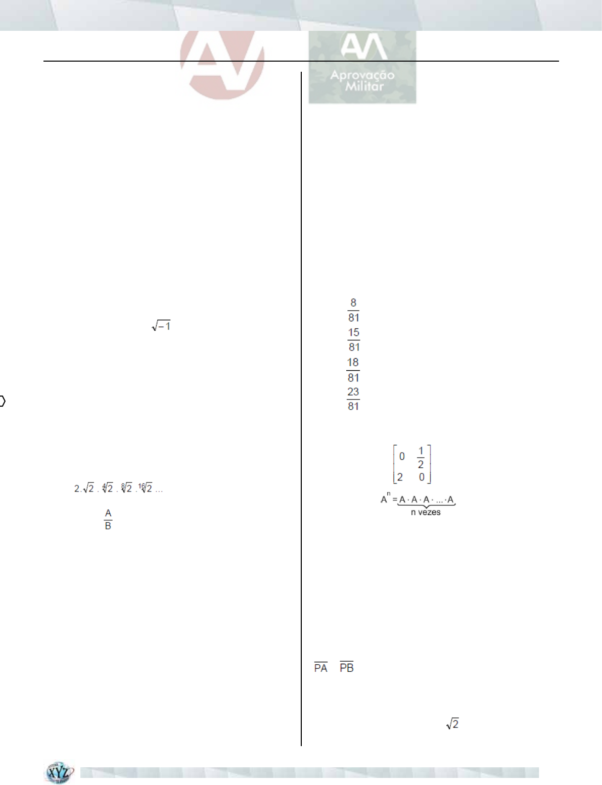 MATEMÁTICACOLETÃNEA DE PROVAS AFA 23 PROVAS AFA 2015-2016 QUESTÃO 1 • • • • • • • • • • • • • • • • • • • • • • • • • • • • • • • • • • • • • Uma fábrica produz casacos de determinado modelo. O preço de venda de um desses casacos é de R$ 200,00, quan- do são vendidos 200 casacos. O gerente da fábrica, a partir de uma pesquisa, verificou que, para cada desconto de R$ 2,00 no preço de cada casa- co, o número de casacos vendidos aumenta de 5. A maior arrecadação possível com a venda dos casacos acontecerá se a fábrica vender cada casaco por um valor, em reais, pertencente ao intervalo: a) [105, 125 [ b) [125, 145 [ c) [145, 165 [ d) [165, 185 [ QUESTÃO 2 • • • • • • • • • • • • • • • • • • • • • • • • • • • • • • • • • • • • • Considere no Plano de Argand-Gauss os números com- plexos z = x + yi , onde i = e cujos afixos são os pontos P( x,y ) ∈ lR² Dada a equação ( z −1+ i )4 = 1, sobre os elementos que compõem seu conjunto solução, é INCORRETO afirmar que: a) apenas um deles é imaginário puro. b) todos podem ser escritos na forma trigonométrica. c) o conjugado do que possui maior argumento é 1+ 2i d) nem todos são números imaginários. QUESTÃO 3 • • • • • • • • • • • • • • • • • • • • • • • • • • • • • • • • • • • • • Considere as expressões A = 26² − 24² + 23² − 21² + 20² −18² + ... + 5² − 3² e B = O valor de é um número compreendido entre: a) 117 e 120 b) 114 e 117 c) 111 e 114 d) 108 e 111 QUESTÃO 4 • • • • • • • • • • • • • • • • • • • • • • • • • • • • • • • • • • • • • Considere os polinômios Q(x) = x² − 2x + 1 e P(x) = x³ − 3x² − ax + b , sendo a e b números reais tais que a² − b² = −8 Se os gráficos de Q(x) e P(x) têm um ponto comum que pertence ao eixo das abscissas, então é INCORRETO afirmar sobre as raízes de P(x) que: a) podem formar uma progressão aritmética. b) são todas números naturais. c) duas são os números a e b d) duas são números simétricos. QUESTÃO 5 • • • • • • • • • • • • • • • • • • • • • • • • • • • • • • • • • • • • • Uma caixa contém 10 bolas das quais 3 são amarelas e numeradas de 1 a 3; 3 verdes numeradas de 1 a 3 e mais 4 bolas de outras cores todas distintas e sem numeração. A quantidade de formas distintas de se enfileirar essas 10 bolas de modo que as bolas de mesmo número fiquem juntas é: a) 8.7 ! b) 7 ! c) 5.4 ! d) 10 ! QUESTÃO 6 • • • • • • • • • • • • • • • • • • • • • • • • • • • • • • • • • • • • • Em uma mesa há dois vasos com rosas. O vaso A con- tém 9 rosas das quais 5 tem espinhos e o vaso B contém 8 rosas sendo que exatamente 6 não tem espinhos. Retira-se, aleatoriamente, uma rosa do vaso A e coloca-se em B. Em seguida, retira-se uma rosa de B. A probabilidade de essa rosa retirada de B ter espinhos é: a) b) c) d) QUESTÃO 7 • • • • • • • • • • • • • • • • • • • • • • • • • • • • • • • • • • • • • Seja A a matriz Sabe-se que Então, o determinante da matriz S = A + A2 + A3 + ... + A11 é igual a: a) 1 b) −31 c) −875 d) −11 QUESTÃO 8 • • • • • • • • • • • • • • • • • • • • • • • • • • • • • • • • • • • • • Considere os pontos A ( 4, − 2 ) , B( 2, 0 ) e todos os pontos P( x, y ) , sendo x e y números reais, tais que os segmentos e são catetos de um mesmo triângulo retângulo. É correto afirmar que, no plano cartesiano, os pontos P( x, y ) são tais que: a) são equidistantes de C( 2, −1) b) o maior valor de x é 3 + c) o menor valor de y é −3 d) x pode ser nulo.