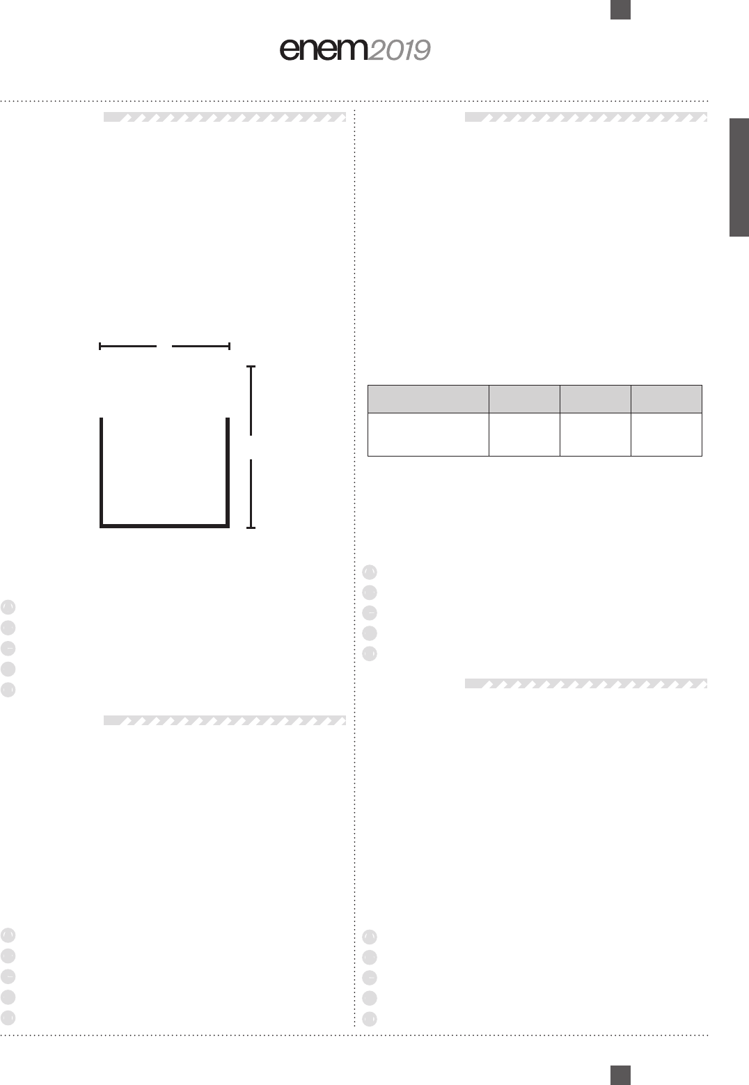 MT - 2º dia | Caderno 7 - AZUL - Página 21 Questão 147 Uma administração municipal encomendou a pintura de dez placas de sinalização para colocar em seu pátio de estacionamento. O profissional contratado para o serviço inicial pintará o fundo de dez placas e cobrará um valor de acordo com a área total dessas placas. O formato de cada placa é um círculo de diâmetro d = 40 cm, que tangencia lados de um retângulo, sendo que o comprimento total da placa é h = 60 cm, conforme ilustrado na figura. Use 3,14 como aproximação para π. Qual é a soma das medidas das áreas, em centímetros quadrados, das dez placas? A 16 628 B 22 280 C 28 560 D 41 120 E 66 240 Questão 148 O rótulo da embalagem de um cosmético informa que a dissolução de seu conteúdo, de acordo com suas especificações, rende 2,7 litros desse produto pronto para o uso. Uma pessoa será submetida a um tratamento estético em que deverá tomar um banho de imersão com esse produto numa banheira com capacidade de 0,3 m3. Para evitar o transbordamento, essa banheira será preenchida em 80% de sua capacidade. Para esse banho, o número mínimo de embalagens desse cosmético é A 9. B 12. C 89. D 112. E 134. Questão 149 O slogan “Se beber não dirija”, muito utilizado em campanhas publicitárias no Brasil, chama a atenção para o grave problema da ingestão de bebida alcoólica por motoristas e suas consequências para o trânsito. A gravidade desse problema pode ser percebida observando como o assunto é tratado pelo Código de Trânsito Brasileiro. Em 2013, a quantidade máxima de álcool permitida no sangue do condutor de um veículo, que já era pequena, foi reduzida, e o valor da multa para motoristas alcoolizados foi aumentado. Em consequência dessas mudanças, observou-se queda no número de acidentes registrados em uma suposta rodovia nos anos que se seguiram às mudanças implantadas em 2013, conforme dados no quadro. Ano 2013 2014 2015 Número total de acidentes 1 050 900 850 Suponha que a tendência de redução no número de acidentes nessa rodovia para os anos subsequentes seja igual à redução absoluta observada de 2014 para 2015. Com base na situação apresentada, o número de acidentes esperados nessa rodovia em 2018 foi de A 150. B 450. C 550. D 700. E 800. Questão 150 Uma pessoa se interessou em adquirir um produto anunciado em uma loja. Negociou com o gerente e conseguiu comprá-lo a uma taxa de juros compostos de 1% ao mês. O primeiro pagamento será um mês após a aquisição do produto, e no valor de R$ 202,00. O segundo pagamento será efetuado um mês após o primeiro, e terá o valor de R$ 204,02. Para concretizar a compra, o gerente emitirá uma nota fiscal com o valor do produto à vista negociado com o cliente, correspondendo ao financiamento aprovado. O valor à vista, em real, que deverá constar na nota fiscal é de A 398,02. B 400,00. C 401,94. D 404,00. E 406,02. d hE PROIBIDO ESTACIONAR *DO0725AZ21*