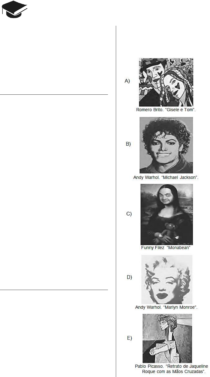 CADERNO LITERATURA ENEM 2009 a 2018 26 novocadernoenem@gmail.com C) revela seu apego à cultura rural, mediante imagens impressionistas de tipos regionais re- manescentes em algumas áreas do Brasil. D) apresenta uma maneira própria de ver a arte, à medida que usa traços, luzes, formas, textu- ras, com impressões de seu estado de espírito no momento da criação. E) apresenta figuras humanas em estilo tradici- onalmente acadêmico, com técnica de óleo sobre tela, uma influência europeia em sua arte. Questão 63 (2009.3) A poesia que floresceu nos anos 70 do século XX é inquieta, anárquica, contestadora. A “poe- sia marginal”, como ficou conhecida, não se filia a nenhuma estética literária em particular, em- bora seja possível ver nela traços de algumas vanguardas que a precederam, como no poema a seguir. S.O.S Chacal (...) nós que não somos médicos psiquiatras nem ao menos bons cristãos nos dedicamos a salvar pessoas que como nós sofrem de um mal misterioso: o sufoco (CAMPEDELLI, Samira Y. Poesia Marginal dos Anos 70. São Paulo: Scipione, 1995) Da leitura do poema e do texto crítico acima, infere-se que a poesia dos anos 70: A) atribuiu ao espaço poético um lugar de fuga e escapismo. B) valorizou a linguagem poética das formas consagradas. C) recuperou traços da produção de vanguarda modernista. D) utilizou com frequência versos metrificados e temas românticos. E) eliminou o diálogo com as artes visuais e as artes plásticas. Questão 64 (2010.1) Na busca constante pela sua evolução, o ser humano vem alternando a sua maneira de pen- sar, de sentir e de criar. Nas últimas décadas do século XVIII e no início do século XIX, os artis- tas criaram obras em que predominam o equilí- brio e a simetria de formas e cores, imprimindo um estilo caracterizado pela imagem da respei- tabilidade, da sobriedade, do concreto e do ci- vismo. Esses artistas misturaram o passado ao presente, retratando os personagens da nobre- za e da burguesia, além de cenas míticas e histórias cheias de vigor. (RAZOUK, J. J. (Org.). Histórias reais e belas nas telas. Posigraf: 2003) Atualmente, os artistas apropriam-se de dese- nhos, charges e até ilustrações de livros para compor obras em que se misturam personagens de diferentes épocas, como na seguinte ima- gem: