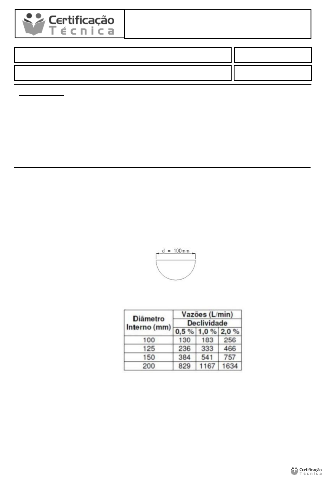INSTRUÇÕES: Esta Avaliação contém 10 (dez) questões, totalizando 10 (dez) pontos; Baixe o arquivo disponível com a Atividade de Pesquisa; Você deve preencher dos dados no Cabeçalho para sua identificação: o Nome / Data de entrega. As respostas devem ser digitadas abaixo de cada pergunta; Ao terminar grave o arquivo com o nome Atividade Prática; Envio o arquivo pelo sistema no local indicado; Em caso de dúvidas consulte o seu Tutor. Aluno (a): Gerson Nathan Dias Data: 28/10/2024 Instalações Hidráulicas – Esgoto e Drenagem - EDI Instalações Hidráulicas – Esgoto e Drenagem - EDI NOTA: Atividade Prática e de Pesquisa Leia o texto abaixo sobre dimensionamento das instalações de água fria e responda aos exercícios propostos. Apresente os cálculos. 1. Dimensionar a vazão da calha abaixo. O material a ser utilizado é o plástico e a inclinação é de 0,5%. O dimensionamento da vazão é de 130L/M 2. Verificar a vazão de calhas retangulares de concreto alisado com lâmina de água a meia altura. Instalações Hidráulicas – Esgoto e Drenagem - EDI 3. Dimensionar o condutor vertical de uma instalação de águas pluviais com base nos se- guintes dados: Q = 650 l/min; H = 50mm, L = 6m, utilizando os ábacos abaixo: DN = 110 mm DN = 90 mm Instalações Hidráulicas – Esgoto e Drenagem - EDI 4. Dimensionar a calha e os condutores horizontais e verticais da edificação abaixo: a) b) Instalações Hidráulicas – Esgoto e Drenagem - EDI c) 5. Determinar os diâmetros do ramal de ventilação, da coluna de ventilação, dos ramais de descarga, dos ramais de esgoto, a declividade dos ramais de descarga e de esgoto do BWC residencial abaixo: Instalações Hidráulicas – Esgoto e Drenagem - EDI 6. Projetar o esgoto do BWC residencial abaixo: Instalações Hidráulicas – Esgoto e Drenagem - EDI 7. Dimensionar os tubos de queda, o tubo de gordura, as colunas de ventilação do esquema vertical abaixo representado: Instalações Hidráulicas – Esgoto e Drenagem - EDI 8. As colunas do exercício anterior são do prédio cuja planta de locação está abaixo repre- sentada: Posicionar as caixas de inspeção, de gordura e dimensionar os subcoletores e o coletor que ligará o esgoto doméstico ao coletor público. Instalações Hidráulicas – Esgoto e Drenagem - EDI Dimensionar um tanque séptico de câmara única para um restaurante em Florianópolis, que serve 100 refeições por dia, prevendo uma limpeza do tanque a cada 3 anos. R: Instalações Hidráulicas – Esgoto e Drenagem - EDI V=4750L 9. Dimensionar um sumidouro para o restaurante do exercício anterior, sabendo que no tes- te de percolação realizado em campo, o intervalo de tempo durante o qual o nível da água baixou 10 m foi de 4 min. R: