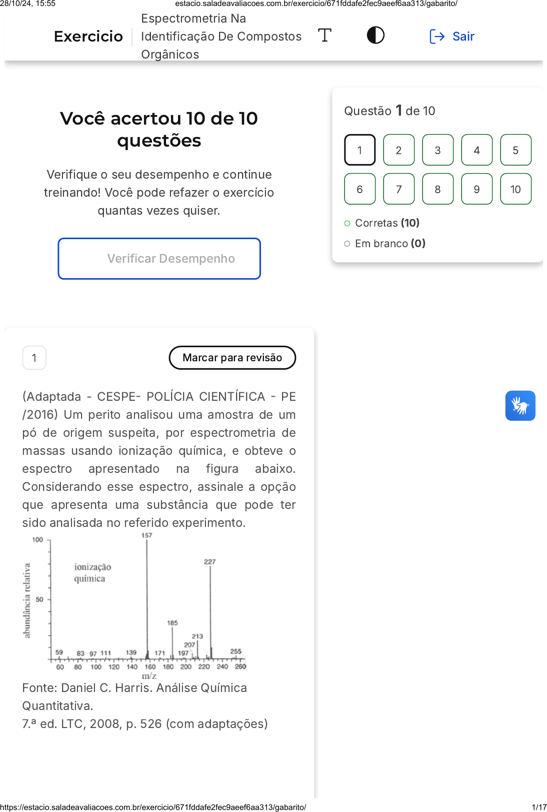 Você acertou 10 de 10 questões Verifique o seu desempenho e continue treinando! Você pode refazer o exercício quantas vezes quiser. Verificar Desempenho 1 Marcar para revisão �Adaptada - CESPE� POLÍCIA CIENTÍFICA � PE /2016� Um perito analisou uma amostra de um pó de origem suspeita, por espectrometria de massas usando ionização química, e obteve o espectro apresentado na figura abaixo. Considerando esse espectro, assinale a opção que apresenta uma substância que pode ter sido analisada no referido experimento. Fonte: Daniel C. Harris. Análise Química Quantitativa. 7.ª ed. LTC, 2008, p. 526 (com adaptações) Questão 1 de 10 Corretas �10� Em branco �0� 1 2 3 4 5 6 7 8 9 10 Exercicio Espectrometria Na Identificação De Compostos Orgânicos Sair 28/10/24, 15:55 estacio.saladeavaliacoes.com.br/exercicio/671fddafe2fec9aeef6aa313/gabarito/ https://estacio.saladeavaliacoes.com.br/exercicio/671fddafe2fec9aeef6aa313/gabarito/ 1/17 A B C D E Resposta correta Parabéns, você selecionou a alternativa correta. Confira o gabarito comentado! Gabarito Comentado Se o composto analisado tivesse um anel aromático, o espectro apresentaria um pico de m/z 77 ou a perda de um radical com esta massa, logo o composto não é aromático. Assim, a substância analisada é 28/10/24, 15:55 estacio.saladeavaliacoes.com.br/exercicio/671fddafe2fec9aeef6aa313/gabarito/ https://estacio.saladeavaliacoes.com.br/exercicio/671fddafe2fec9aeef6aa313/gabarito/ 2/17 A B o pentobarbital cujo íon molecular tem m/z 227. Ocorre um pico de massa maior (m/z 255) devido a detecção do gás reagente, de massa 28, utilizado na técnica de ionização química. 2 Marcar para revisão �FADESP�COSANPA /2017� Após tratamento de desinfecção por compostos clorados, a contaminação por trihalometanos de água para consumo humano foi analisada por cromatografia gasosa acoplada a espectrometria de massas. O espectro de massas obtido, parcialmente representado na figura abaixo, mostrou a presença de três diferentes trihalometanos. Dados: Massas atômicas (g mol ): H � 1; C � 12; F � 19; Cl = 35,5; Br = 80. A análise do espectro mostra que o grupo de sinais m/z iguais a 128, 130 e 132 deve-se ao �1 CHCl .3 CH Cl .2 2 28/10/24, 15:55 estacio.saladeavaliacoes.com.br/exercicio/671fddafe2fec9aeef6aa313/gabarito/ https://estacio.saladeavaliacoes.com.br/exercicio/671fddafe2fec9aeef6aa313/gabarito/ 3/17 C D E CH ClF.2 CH F .2 2 CH BrCl.2 Resposta correta Parabéns, você selecionou a alternativa correta. Confira o gabarito comentado! Gabarito Comentado O composto que apresenta carga/massa 128 e que pode apresentar fragmentos próximo de 128, 130 e 132 é o CH BrCl.2 3 Marcar para revisão �UFPA�/2017� Técnicas como a espectrometria de massas auxiliam na determinação da estrutura química de diversas substâncias. O espectro de massa abaixo é de um composto puro, cuja fórmula química é: Dados: Massas atômicas (u) 28/10/24, 15:55 estacio.saladeavaliacoes.com.br/exercicio/671fddafe2fec9aeef6aa313/gabarito/ https://estacio.saladeavaliacoes.com.br/exercicio/671fddafe2fec9aeef6aa313/gabarito/ 4/17 A B C D E H � 1; C � 12; O � 16; F � 19; Br = 80 C H6 6. CH Br.3 CH F .2 2 C H CHO.6 5 C H CH CH .6 5 2 3 Resposta correta Parabéns, você selecionou a alternativa correta. Confira o gabarito comentado! Gabarito Comentado O fragmento de m/z 106 é formado devido a perda de um hidrogênio �106�105 � 1�, uma fragmentação comum de aldeídos. Observa-se também a perda de um fragmento de massa m/z 28 �105 � 77 � 28�, que correspondente ao grupo CO. Além disso o fragmento em m/z 77 é típico de aromáticos, C H . Assim, o espectro pertence ao composto C H CHO. 6 5 � 6 5 4 Marcar para revisão Na espectrometria de massas, a escolha da técnica de ionização adequada é importante, 28/10/24, 15:55 estacio.saladeavaliacoes.com.br/exercicio/671fddafe2fec9aeef6aa313/gabarito/ https://estacio.saladeavaliacoes.com.br/exercicio/671fddafe2fec9aeef6aa313/gabarito/ 5/17 A B C D E pois leva-se em consideração as propriedades do analito. Sobre esse tema, assinale a alternativa que indica as técnicas mais comuns de ionização da molécula. Ionização termogravimétrica, ionização a vapor. Impacto por eletrons, cromagrafia gasosa. Impacto por elétrons, ionização química, MALDI, ionização por elétron spray, térmica. Ressonância magnética nuclear, ionização química Ionização térmica, cromatografia líquida. Resposta correta Parabéns, você selecionou a alternativa correta. Confira o gabarito comentado! Gabarito Comentado Na espectrometria de massas, o modo de ionização da amostra influencia o perfil do espectro de massas final. Impacto por elétrons e ionização química são exemplos de ionização à vácuo, já ionização por dessorção a laser assistido por matriz �MALDI) é um tipo de ionização por dessorção, e Ionização por Eletrospray �ESI) e a Ionização Térmica �TS) são exemplos de ionização por evaporação. As 28/10/24, 15:55 estacio.saladeavaliacoes.com.br/exercicio/671fddafe2fec9aeef6aa313/gabarito/ https://estacio.saladeavaliacoes.com.br/exercicio/671fddafe2fec9aeef6aa313/gabarito/ 6/17 outras técnicas não são técnicas de ionização do analito. 5 Marcar para revisão �Adaptada- FUNDATEC� IGP�RS /2017� Um perito resolveu usar o cloreto de etila �I) como modelo de estrutura química para testar um software de previsão de espectros de Ressonância Magnética Nuclear de H. A partir dessa molécula, foram feitas substituições que originaram outros compostos similares �II, III, IV, V e VI�, que também foram testados. Os testes do software não incluíam sobreposição de espectros de solventes, nem de agentes como o TMS. Considerando as moléculas e as observações teóricas feitas pelo perito, assinale a alternativa CORRETA. 1 28/10/24, 15:55 estacio.saladeavaliacoes.com.br/exercicio/671fddafe2fec9aeef6aa31