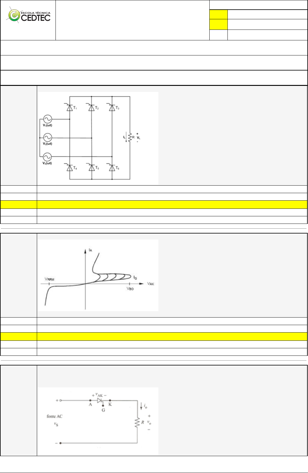 Pincel Atômico - 28/10/2024 17:43:19 1/2 DANIEL DE ALMEIDA LOPES Exercício Caminho do Conhecimento - Etapa 6 (27273) Atividade finalizada em 02/10/2024 06:38:43 (2503510 / 1) LEGENDA Resposta correta na questão # Resposta correta - Questão Anulada X Resposta selecionada pelo Aluno Disciplina: ELETRÔNICA DE POTÊNCIA [1146510] - Avaliação com 4 questões, com o peso total de 6,50 pontos [capítulos - 113] Turma: Curso Técnico: Eletrotécnica - Grupo: EAD - 07/24 - EAD ELE [128010] Aluno(a): 91636745 - DANIEL DE ALMEIDA LOPES - Respondeu 3 questões corretas, obtendo um total de 4,88 pontos como nota [350058_188714] Questão 001 O circuito apresentado na figura abaixo se refere ao: Retificador trifásico de meia onda, a diodo. Retificador monofásico, de onda completa, a diodo. X Retificador trifásico de onda completa, a Tiristor. Retificador monofásico, de onda completa, a Tiristor. Retificador trifásico de onda completa, a diodo. [350059_188717] Questão 002 Considere a curva característica representada abaixo. Esta curva refere-se ao dispositivo: PTC DIAC X SCR PUT SBS [350058_188715] Questão 003 O circuito da figura abaixo é de um retificador monofásico controlado de meia onda sendo alimentado por uma fonte de tensão (Vs) AC, a qual possui semiciclo positivo no intervalo de 0 a π e de 2π a 3π e semiciclo negativo no intervalo de π a 2π. Sabendo que α é o ângulo de disparo do SCR e θ é o ângulo de condução, assinale a alternativa que mostra a forma de onda referente ao comportamento da corrente i. Pincel Atômico - 28/10/2024 17:43:19 2/2 X [350057_188721] Questão 004 Considerando o circuito da Figura e que a fonte de alimentação seja de 16 V (eficazes). Os Tiristores são ideais com ângulo de condução de 45o e a carga tem resistência de 5 Ω, determine: • A potência média na carga. Po = 76,51W Po = 49,51W Po = 56,51W Po = 40,51W X Po = 46,51W