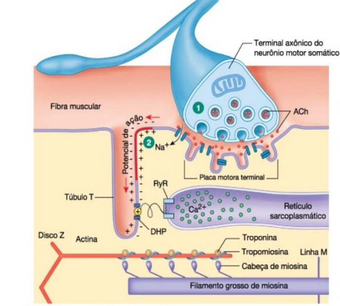 FISIOLOGIA DO TECIDO MUSCULAR ESQUELÉTICO Estado de repouso Os canais DHP e Ryr estão fechados DHP(Dihidropiridina): É um receptor sensível à voltagem localizado na membrana dos túbulos T RyR (Receptor de Rianodina):É um canal de cálcio localizado no retículo sarcoplasmático Inicio do impulso nervoso 1.Liberação de Acetilcolina (ACh): Quando um potencial de ação (impulso nervoso) chega ao terminal do nervo motor, ele provoca a liberação de acetilcolina na junção neuromuscular. 2.Abertura dos Canais Nicotínicos: A acetilcolina se liga aos receptores nicotínicos na membrana da fibra muscular, que são canais iônicos. A ligação de ACh abre esses canais, permitindo que íons de sódio (Na ) entrem na célula muscular.⁺ 3.Influxo de Sódio e Despolarização: A entrada de sódio provoca uma despolarização da membrana da fibra muscular. Se essa despolarização for suficientemente forte e atingir o limiar, um novo potencial de ação é gerado na célula muscular. 4.Propagação ao Longo da Membrana: Esse potencial de ação se propaga rapidamente ao longo do sarcolema (membrana da célula muscular) e penetra nos túbulos T, que são invaginações da membrana que se estendem profundamente na fibra muscular. 5.Ativação do Receptor DHP: Quando o potencial de ação atinge o final dos túbulos T, ele ativa os receptores DHP, que são sensíveis à mudança de voltagem causada pela despolarização. 6.Abertura dos Canais RyR: A ativação do DHP, por sua vez, desencadeia a abertura dos canais RyR no retículo sarcoplasmático, que está localizado próximo aos túbulos T. Liberação de Cálcio no Citoplasma**: Quando os canais RyR se abrem, o cálcio armazenado no retículo sarcoplasmático é liberado no citoplasma da célula muscular. 7.Ligação do Cálcio à Troponina: O cálcio liberado se liga à troponina, uma proteína associada à actina nas fibras musculares. 8.Interação Actina-Miosina e Contração: A ligação do cálcio à troponina causa uma mudança conformacional que permite que as cabeças de miosina se liguem à actina. Esse evento leva ao deslizamento dos filamentos de actina e miosina um sobre o outro, resultando na contração muscular. Relaxamento muscular 1.Após a contração, o cálcio precisa ser removido do citoplasma para que o músculo possa relaxar. Isso é feito pela bomba de cálcio SERCA 2A, que utiliza ATP para transportar Ca² de ⁺ volta para o retículo sarcoplasmático, contra o gradiente de concentração. 2.A reabsorção do cálcio pelo retículo sarcoplasmático reduz a concentração de cálcio no citoplasma, permitindo o relaxamento das fibras musculares. 3.O ciclo de contração e relaxamento muscular é dependente de ATP. A SERCA 2A usa a energia proveniente da hidrólise do ATP (convertendo ATP em ADP + Pi) para reabsorver o cálcio. Tecido muscular Músculo estriado esquelético: Está ligado ao esqueleto/ Movimento voluntário/ Contração forte, rápida e descontínua/ Multinucleada/ Retículo muito desenvolvido/ célula cilíndrica longa/ Resposta graduada Músculo Estriado Cardíaco: Involuntário/ Contração forte, rápida e contínua/ células ramificadas/ Uninucleada/ retículo bem desenvolvido/ Tudo ou nada Músculo Liso: Contração fraca/ Lenta, involuntária/ Presente em todas as visceras , exceto coração/ células fusiformes/ Uninucleada/ Retículo pouco desenvolvido/Resposta graduada TECIDO ESTRIADO TEM ESTRIAS( SARCÔMEROS) Duração da contração muscular nos três tipos de músculos Músculo esquelético Agonista: Motor primário do movimento Antagonista: Músculo da mesma articulação , mas com função oposta ao agonista Tipos de contração muscular Contração isotônica Uma contração isotônica ocorre quando um músculo se contrai e muda de comprimento enquanto gera uma força constante. Durante uma contração isotônica, o músculo pode encurtar ou alongar. • Contração Concêntrica: O músculo encurta enquanto se contrai. Um exemplo é levantar um peso, como quando você faz um bíceps curl com halteres. O músculo bíceps encurta à medida que o peso é levantado. • Contração Excêntrica: O músculo alonga enquanto ainda está contraído. Um exemplo é abaixar o peso durante um bíceps curl. O músculo bíceps alonga enquanto o peso é lentamente abaixado. Contração isométrica Uma contração isométrica ocorre quando o músculo se contrai, mas não muda de comprimento, e não há movimento na articulação. Apesar de não haver mudança no comprimento muscular, o músculo ainda gera força. Exemplo: • Empurrar uma parede ou segurar uma barra em uma posição fixa. Os músculos estão contraídos e gerando força, mas não há movimento. • Manter uma posição de prancha (plank) durante um exercício. Os músculos abdominais e do core estão contraídos para manter a posição, mas não há movimento. A principal diferença entre os dois tipos de contração é que nas contrações isotônicas, há movimento das articulações devido à mudança no comprimento do músculo, enquanto nas contrações isométricas, o músculo gera força sem causar movimento. Sarcômeros Sarcômero: filamento grosso( miosina) + filamento fino( actina) Miosina: • Várias miosinas formam o filamento grosso • A cabeça da miosina é flexível/ móvel • É uma proteína dímera( duas cadeias polipeptídicas , uma é a cauda e a outra a cabeça Actina • Várias actinas formam um filamento fino • É uma proteína globular Contração: a miosina e a actina se juntam / puxam a linha Z e as aproxima/ Diminui o sarcômero Relaxado: Linha Z afasta FIBRA MUSCULAR = CÉLULA MUSCULAR = MIÓCITO 1. Quando o impulso nervoso atinge a fibra muscular , ele provoca a despolarização da membrana celular( sarcolema) 2. Essa despolarização atinge o limiar e o potencial de ação gerado faz com que ocorra no retículo sarcoplasmático, a abertura de canais de cálcio , o que permite que Ca+ seja libera