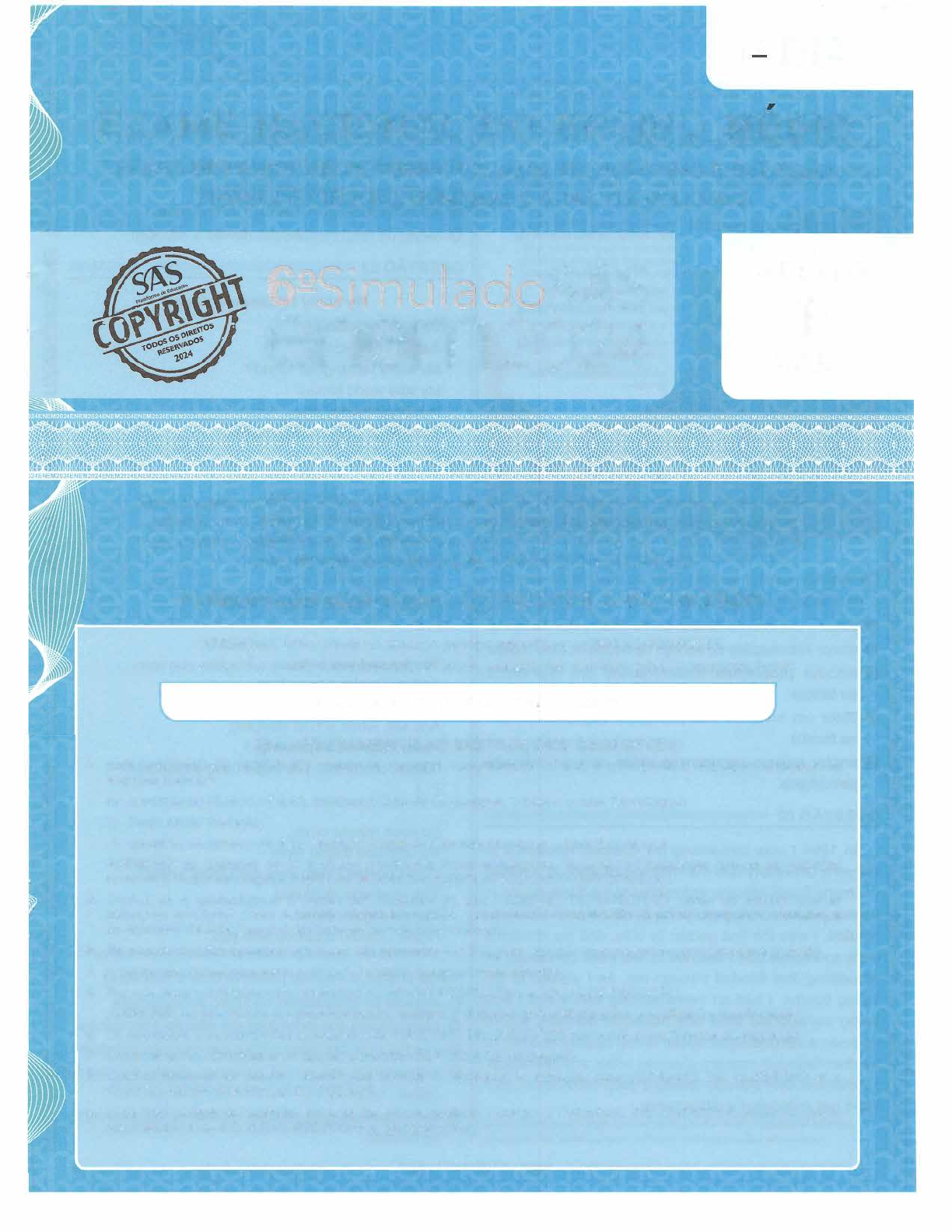 1 ° DIA EXAME NACIONAL DO ENSINO MEDIO PROVA DE LINGUAGENS, CÓDIGOS E SUAS TECNOLOGIAS E REDAÇÃO PROVA DE CIÊNCIAS HUMANAS E SUAS TECNOLOGIAS 0 SÃS enem2024 CADERNO 1 AZUL Este simulado é protegido por direitos autorais do SAS Plataforma de Educação e seu uso é exclusivo às instituições de ensino parceiras e aos alunos da plataforma, não podendo ser reproduzido, copiado ou compartilhado sem autorização expressa, por escrito, sob pena de caracterização de ato ilícito pela violação de direitos autorais. Período de aplicação: 03/10/2024 a 08/10/2024 ATENÇÃO: transcreva no espaço apropriado do seu CARTÃO-RESPOSTA, com sua caligrafia usual, considerando as letras maiúsculas e minúsculas, a seguinte frase: O que a gente gosta, a gente guarda LEIA ATENTAMENTE AS INSTRUÇÕES SEGUINTES: 1. Este CADERNO DE QUESTÕES contém 90 questões numeradas de 01 a 90 e a Proposta de Redação, dispostas da seguinte maneira: a) questões de número 01 a 45, relativas à área de Linguagens, Códigos e suas Tecnologias; b) Proposta de Redação; c) questões de número 46 a 90, relativas à área de Ciências Humanas e suas Tecnologias. ATENÇÃO: as questões de 01 a 05 são relativas à língua estrangeira. Você deverá responder apenas às questões relativas à língua estrangeira (inglês ou espanhol) escolhida no seu CARTÃO-RESPOSTA. 2. Confira se a quantidade e a ordem das questões do seu CADERNO DE QUESTÕES estão de acordo com as instruções anteriores. Caso o caderno esteja incompleto, tenha defeito ou apresente qualquer divergência, comunique ao aplicador da sala para que ele tome as providências cabíveis. 3. Para cada uma das questões objetivas, são apresentadas 5 opções. Apenas uma responde corretamente à questão. 4. O tempo disponível para estas provas é de cinco horas e trinta minutos. 5. Reserve tempo suficiente para preencher o CARTÃO-RESPOSTA e a FOLHA DE REDAÇÃO. ATENÇÃO: ao preencher o cartão-resposta, marque o caderno que utilizou para a realização do simulado. 6. Os rascunhos e as marcações assinaladas no CADERNO DE QUESTÕES não serão considerados na avaliação. 7. Somente serão corrigidas as redações transcritas na FOLHA DE REDAÇÃO. 8. Quando terminar as provas, acene para chamar o aplicador e entregue este CADERNO DE QUESTÕES e o CARTÃO-RESPOSTA/FOLHA DE REDAÇÃO. 9. Você não poderá se ausentar da sala de provas levando consigo o CADERNO DE QUESTÕES antes do prazo estabelecido e/ou o CARTÃO-RESPOSTA a qualquer tempo. � LINGUAGENS, CÓDIGOS E SUAS TECNOLOGIAS ffi Questões de 01 a 45 ..1 Questões de 01 a 05 (opção inglês) � QUESTÃO 01 1 Talking to your mental :!5 health provi 1 1 /JfL thelr.ap'f appt! ,S fllp • t:Mt.t/Jl.e, w ... 1am::-� � depllRMÍím 'l!Ledíi:.atúm º"" • :::, - U"''" � � Lwa.n1; to- wook cm rTUf .ót.lrRM. == w z w ..1 :::, Preparing a quick list before your first session can take sorne of the pressure off your rnernory and ensure you don't rniss anything. Here are sorne ideas to include: • topics you'd like to cover • any rnedications you're taking • any relevam farnily history • what you would like to get out of the appointrnent • additional questions for the provider � '-----------.... � Disponível em: https://www.empoweridaho.org. Acesso em: 26 abr. 2024. � Os recursos usados nesse pôster de divulgação orientam � o leitor sobre a relevância de Z 8 evitar o uso indiscriminado de medicamentos na rotina. � 0 enviar informações ao serviço de saúde de uma região. :::, @ discutir problemas solucionáveis em momentos � de terapia. � @ obter um histórico das principais doenças mentais � na família. :!5 4} anotar tópicos importantes antes de uma consulta ! psicológica. W QUESTÃO 02 ..1---------------------- ij ln 1994 1 was completing my doctoral fellowship at CI: Harvard University. On the morning of April 27 1 joined � the many South Africans assembled at the State House in � Boston, where a voting center for South Africans had been :i: created. 1 was the first person to vote, and my emotions 1 were so intense that I seemed to feel them concretely as W something that flooded through me. As I walked to the 5 voting booths, 1 had an overwhelming sense that I was N being transported from one historical moment, where CI: l'd been a second-class citizen in my country of birth, to � another historical moment of power, pride, and affirmation. � 1 remember later that day feeling a deep satisfaction, as if :i: 1 had just completed a difficult race. 1 GOBODO-MADIKIZELA, Pumla. A Human Being Died that Night: A South African Woman W Confronts the Legacy oi Apartheid. Nova York: Houghton Mifflin. 2003. (adaptado) enem2024 Exame Nacional do Ensíno Médio m No texto, as palavras "flooded' e "overwhelming" ressaltam z por parte da autora o(a) ffl i: 8 contenção de suas emoções . 0 complexidade das dúvidas sentidas. @ excesso de percepções conflituosas. @ intensidade dos sentimentos vivenciados. 4) senso de responsabilidade devido à situação. QUESTÃO 03 My shiny rectangular friend Oh what did I do, Before I had you, My shiny rectangular friend? My little world locked ln a bright beepy box, The things you can do never end. [ ... ] And, at one single stroke, You connect me with folk - lncluding the ones I detest, 1 "like" their new cars, And "wow" at their scars, Not sure who l'm trying to impress. [ . . . ] You bip and you buzz, And you make a huge fuss, The second you want my attention, And still, when you're sleeping, 1 hear your voice speaking, "Quick, check me, you might have a mention!" [ ... ] So each minute or six, My addicted thumb flicks - Who's posted? Who likes me? What's new? This madness must end, My rectangular friend - 1 think I should break up with you. PARMENTER, Nina. Disponível em: https://ninaparmenter.com. Acesso em: 26 abr. 2024. Nesse poema, o eu lírico promove uma crítica ao(à) 8 impacto do imediatismo n