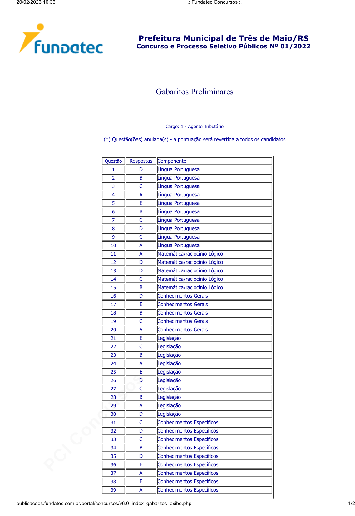 pcimarkpci MDAwMDowMDAwOjAwMDA6MDAwMDowMDAwOmZmZmY6YjM2YjpmZWYz:TW9uLCAyOCBPY3QgMjAyNCAyMToxNToyOCAtMDMwMA== www.pciconcursos.com.br 20/02/2023 10:36 .: Fundatec Concursos :. publicacoes.fundatec.com.br/portal/concursos/v6.0_index_gabaritos_exibe.php 1/2 Prefeitura Municipal de Três de Maio/RS Concurso e Processo Seletivo Públicos Nº 01/2022 Gabaritos Preliminares Cargo: 1 - Agente Tributário (*) Questão(ões) anulada(s) - a pontuação será revertida a todos os candidatos Questão Respostas Componente 1 D Língua Portuguesa 2 B Língua Portuguesa 3 C Língua Portuguesa 4 A Língua Portuguesa 5 E Língua Portuguesa 6 B Língua Portuguesa 7 C Língua Portuguesa 8 D Língua Portuguesa 9 C Língua Portuguesa 10 A Língua Portuguesa 11 A Matemática/raciocínio Lógico 12 D Matemática/raciocínio Lógico 13 D Matemática/raciocínio Lógico 14 C Matemática/raciocínio Lógico 15 B Matemática/raciocínio Lógico 16 D Conhecimentos Gerais 17 E Conhecimentos Gerais 18 B Conhecimentos Gerais 19 C Conhecimentos Gerais 20 A Conhecimentos Gerais 21 E Legislação 22 C Legislação 23 B Legislação 24 A Legislação 25 E Legislação 26 D Legislação 27 C Legislação 28 B Legislação 29 A Legislação 30 D Legislação 31 C Conhecimentos Específicos 32 D Conhecimentos Específicos 33 C Conhecimentos Específicos 34 B Conhecimentos Específicos 35 D Conhecimentos Específicos 36 E Conhecimentos Específicos 37 A Conhecimentos Específicos 38 E Conhecimentos Específicos 39 A Conhecimentos Específicos pcimarkpci MDAwMDowMDAwOjAwMDA6MDAwMDowMDAwOmZmZmY6YjM2YjpmZWYz:TW9uLCAyOCBPY3QgMjAyNCAyMToxNToyOCAtMDMwMA== www.pciconcursos.com.br 20/02/2023 10:36 .: Fundatec Concursos :. publicacoes.fundatec.com.br/portal/concursos/v6.0_index_gabaritos_exibe.php 2/2 40 B Conhecimentos Específicos Imprimir Assinatura Eletrônica: 23985 pcimarkpci MDAwMDowMDAwOjAwMDA6MDAwMDowMDAwOmZmZmY6YjM2YjpmZWYz:TW9uLCAyOCBPY3QgMjAyNCAyMToxNToyOCAtMDMwMA== www.pciconcursos.com.br 20/02/2023 10:36 .: Fundatec Concursos :. publicacoes.fundatec.com.br/portal/concursos/v6.0_index_gabaritos_exibe.php 1/2 Prefeitura Municipal de Três de Maio/RS Concurso e Processo Seletivo Públicos Nº 01/2022 Gabaritos Preliminares Cargo: 2 - Analista de Suporte de Informática (*) Questão(ões) anulada(s) - a pontuação será revertida a todos os candidatos Questão Respostas Componente 1 D Língua Portuguesa 2 B Língua Portuguesa 3 C Língua Portuguesa 4 A Língua Portuguesa 5 E Língua Portuguesa 6 B Língua Portuguesa 7 C Língua Portuguesa 8 D Língua Portuguesa 9 C Língua Portuguesa 10 A Língua Portuguesa 11 A Matemática/raciocínio Lógico 12 D Matemática/raciocínio Lógico 13 D Matemática/raciocínio Lógico 14 C Matemática/raciocínio Lógico 15 B Matemática/raciocínio Lógico 16 D Conhecimentos Gerais 17 E Conhecimentos Gerais 18 B Conhecimentos Gerais 19 C Conhecimentos Gerais 20 A Conhecimentos Gerais 21 E Legislação 22 C Legislação 23 B Legislação 24 A Legislação 25 E Legislação 26 D Legislação 27 C Legislação 28 B Legislação 29 A Legislação 30 D Legislação 31 A Conhecimentos Específicos 32 C Conhecimentos Específicos 33 B Conhecimentos Específicos 34 C Conhecimentos Específicos 35 A Conhecimentos Específicos 36 E Conhecimentos Específicos 37 E Conhecimentos Específicos 38 D Conhecimentos Específicos 39 B Conhecimentos Específicos pcimarkpci MDAwMDowMDAwOjAwMDA6MDAwMDowMDAwOmZmZmY6YjM2YjpmZWYz:TW9uLCAyOCBPY3QgMjAyNCAyMToxNToyOCAtMDMwMA== www.pciconcursos.com.br 20/02/2023 10:36 .: Fundatec Concursos :. publicacoes.fundatec.com.br/portal/concursos/v6.0_index_gabaritos_exibe.php 2/2 40 D Conhecimentos Específicos Imprimir Assinatura Eletrônica: 24372.5 pcimarkpci MDAwMDowMDAwOjAwMDA6MDAwMDowMDAwOmZmZmY6YjM2YjpmZWYz:TW9uLCAyOCBPY3QgMjAyNCAyMToxNToyOCAtMDMwMA== www.pciconcursos.com.br 20/02/2023 10:36 .: Fundatec Concursos :. publicacoes.fundatec.com.br/portal/concursos/v6.0_index_gabaritos_exibe.php 1/2 Prefeitura Municipal de Três de Maio/RS Concurso e Processo Seletivo Públicos Nº 01/2022 Gabaritos Preliminares Cargo: 3 - Assistente Social – 30 horas (*) Questão(ões) anulada(s) - a pontuação será revertida a todos os candidatos Questão Respostas Componente 1 D Língua Portuguesa 2 B Língua Portuguesa 3 C Língua Portuguesa 4 A Língua Portuguesa 5 E Língua Portuguesa 6 B Língua Portuguesa 7 C Língua Portuguesa 8 D Língua Portuguesa 9 C Língua Portuguesa 10 A Língua Portuguesa 11 A Matemática/raciocínio Lógico 12 D Matemática/raciocínio Lógico 13 D Matemática/raciocínio Lógico 14 C Matemática/raciocínio Lógico 15 B Matemática/raciocínio Lógico 16 D Conhecimentos Gerais 17 E Conhecimentos Gerais 18 B Conhecimentos Gerais 19 C Conhecimentos Gerais 20 A Conhecimentos Gerais 21 E Legislação 22 C Legislação 23 B Legislação 24 A Legislação 25 E Legislação 26 D Legislação 27 C Legislação 28 B Legislação 29 A Legislação 30 D Legislação 31 C Conhecimentos Específicos 32 E Conhecimentos Específicos 33 C Conhecimentos Específicos 34 B Conhecimentos Específicos 35 A Conhecimentos Específicos 36 B Conhecimentos Específicos 37 D Conhecimentos Específicos 38 D Conhecimentos Específicos 39 E Conhecimentos Específicos pcimarkpci MDAwMDowMDAwOjAwMDA6MDAwMDowMDAwOmZmZmY6YjM2YjpmZWYz:TW9uLCAyOCBPY3QgMjAyNCAyMToxNToyOCAtMDMwMA== www.pciconcursos.com.br 20/02/2023 10:36 .: Fundatec Concursos :. publicacoes.fundatec.com.br/portal/concursos/v6.0_index_gabaritos_exibe.php 2/2 40 A Conhecimentos Específicos Imprimir Assinatura Eletrônica: 24085 pcimarkpci MDAwMDowMDAwOjAwMDA6MDAwMDowMDAwOmZmZmY6YjM2YjpmZWYz:TW9uLCAyOCBPY3QgMjAyNCAyMToxNToyOCAtMDMwMA== www.pciconcursos.com.br 20/02/2023 10:36 .: Fundatec Concursos :. publicacoes.fundatec.com.br/portal/concursos/v6.0_index_gabaritos_exibe.php 1/2 Prefeitura Municipal de Três de Maio/RS Concurso e Processo Seletivo Públicos Nº 01/2022 Gabaritos Preliminares Cargo: 4 - Enfermeiro (*) Questão(õ
