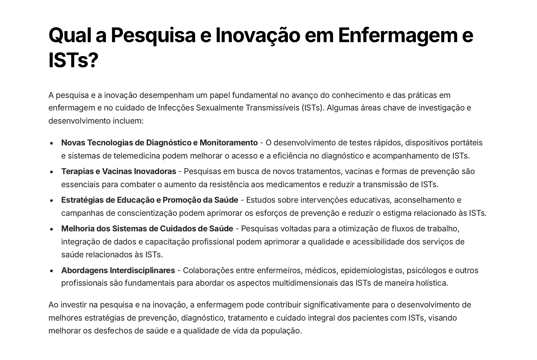 Qual a Pesquisa e Inovação em Enfermagem e ISTs? A pesquisa e a inovação desempenham um papel fundamental no avanço do conhecimento e das práticas em enfermagem e no cuidado de Infecções Sexualmente Transmissíveis (ISTs). Algumas áreas chave de investigação e desenvolvimento incluem: Novas Tecnologias de Diagnóstico e Monitoramento - O desenvolvimento de testes rápidos, dispositivos portáteis e sistemas de telemedicina podem melhorar o acesso e a eficiência no diagnóstico e acompanhamento de ISTs. Terapias e Vacinas Inovadoras - Pesquisas em busca de novos tratamentos, vacinas e formas de prevenção são essenciais para combater o aumento da resistência aos medicamentos e reduzir a transmissão de ISTs. Estratégias de Educação e Promoção da Saúde - Estudos sobre intervenções educativas, aconselhamento e campanhas de conscientização podem aprimorar os esforços de prevenção e reduzir o estigma relacionado às ISTs. Melhoria dos Sistemas de Cuidados de Saúde - Pesquisas voltadas para a otimização de fluxos de trabalho, integração de dados e capacitação profissional podem aprimorar a qualidade e acessibilidade dos serviços de saúde relacionados às ISTs. Abordagens Interdisciplinares - Colaborações entre enfermeiros, médicos, epidemiologistas, psicólogos e outros profissionais são fundamentais para abordar os aspectos multidimensionais das ISTs de maneira holística. Ao investir na pesquisa e na inovação, a enfermagem pode contribuir significativamente para o desenvolvimento de melhores estratégias de prevenção, diagnóstico, tratamento e cuidado integral dos pacientes com ISTs, visando melhorar os desfechos de saúde e a qualidade de vida da população. Quais Desafios Atuais e Tendências Futuras em ISTs? O campo das Infecções Sexualmente Transmissíveis (ISTs) enfrenta diversos desafios que exigem respostas inovadoras e adaptáveis. Uma das principais preocupações atuais é o aumento da resistência antimicrobiana, tornando cada vez mais difícil o tratamento de certas ISTs, como a gonorreia. Além disso, a disseminação de informações incorretas pelas redes sociais e a estigmatização das pessoas com ISTs dificultam a adoção de práticas preventivas e o acesso aos serviços de saúde. Em relação às tendências futuras, espera-se um maior foco na prevenção primária, com ênfase na educação sexual abrangente e no desenvolvimento de vacinas eficazes contra ISTs comuns, como o HPV. A telemedicina também deve desempenhar um papel cada vez mais importante, permitindo o acesso a serviços de saúde sexual e reprodutiva de forma remota e confidencial. Além disso, prevê-se um avanço na tecnologia de diagnóstico, com testes rápidos e de fácil utilização, possibilitando a detecção precoce e o acompanhamento de ISTs. Espera-se também uma maior integração dos cuidados, com uma abordagem multidisciplinar envolvendo profissionais de saúde, assistentes sociais e educadores, a fim de oferecer um atendimento holístico e centrado no paciente. Diante desses desafios e tendências, é crucial que haja investimento em pesquisa, capacitação de profissionais e políticas públicas eficazes para enfrentar as ISTs de maneira eficiente e promover a saúde sexual e reprodutiva da população. Qual A Importância do Trabalho em Equipe Multidisciplinar? O atendimento à saúde, especialmente no que diz respeito às infecções sexualmente transmissíveis (IST), requer uma abordagem holística e colaborativa. Nesse contexto, o trabalho em equipe multidisciplinar é fundamental para proporcionar um cuidado integral e eficaz aos pacientes. Compartilhamento de Conhecimento: Profissionais de diferentes áreas, como médicos, enfermeiros, psicólogos, assistentes sociais e educadores, unem seus conhecimentos e habilidades específicas, enriquecendo a compreensão dos casos e a tomada de decisões. 1. Abordagem Interdisciplinar: Ao integrar diversas perspectivas, a equipe multidisciplinar é capaz de identificar e abordar as múltiplas dimensões envolvidas no cuidado com as IST, como aspectos clínicos, emocionais, sociais e educacionais. 2. Melhoria da Qualidade do Atendimento: O trabalho em equipe permite uma avaliação mais completa do paciente, a elaboração de planos de cuidado personalizados e a coordenação eficiente das intervenções, resultando em melhores desfechos clínicos e maior satisfação dos pacientes. 3. Apoio e Desenvolvimento Profissional: A troca de experiências e a colaboração entre os membros da equipe multidisciplinar promovem o aprendizado contínuo, o desenvolvimento de competências e a melhoria das práticas de cuidado em IST. 4. Abordagem Centrada no Paciente: O trabalho em equipe multidisciplinar coloca o paciente no centro do processo de cuidado, garantindo que suas necessidades, preferências e expectativas sejam atendidas de forma integral e personalizada. 5. Portanto, a adoção de uma abordagem multidisciplinar no atendimento às IST é essencial para proporcionar um cuidado de alta qualidade, promover a saúde e o bem-estar dos pacientes, além de fomentar o desenvolvimento profissional e a melhoria contínua dos serviços de saúde.