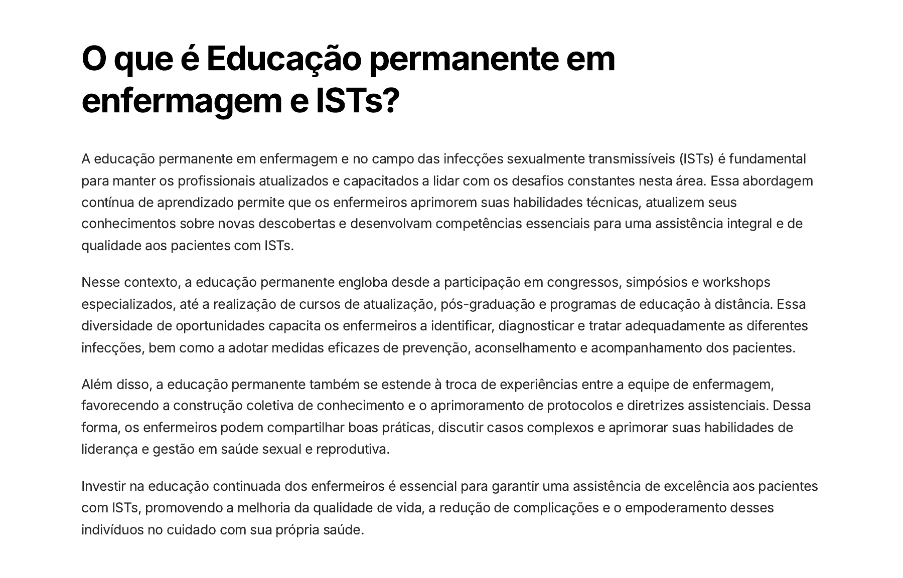 O que é Educação permanente em enfermagem e ISTs? A educação permanente em enfermagem e no campo das infecções sexualmente transmissíveis (ISTs) é fundamental para manter os profissionais atualizados e capacitados a lidar com os desafios constantes nesta área. Essa abordagem contínua de aprendizado permite que os enfermeiros aprimorem suas habilidades técnicas, atualizem seus conhecimentos sobre novas descobertas e desenvolvam competências essenciais para uma assistência integral e de qualidade aos pacientes com ISTs. Nesse contexto, a educação permanente engloba desde a participação em congressos, simpósios e workshops especializados, até a realização de cursos de atualização, pós-graduação e programas de educação à distância. Essa diversidade de oportunidades capacita os enfermeiros a identificar, diagnosticar e tratar adequadamente as diferentes infecções, bem como a adotar medidas eficazes de prevenção, aconselhamento e acompanhamento dos pacientes. Além disso, a educação permanente também se estende à troca de experiências entre a equipe de enfermagem, favorecendo a construção coletiva de conhecimento e o aprimoramento de protocolos e diretrizes assistenciais. Dessa forma, os enfermeiros podem compartilhar boas práticas, discutir casos complexos e aprimorar suas habilidades de liderança e gestão em saúde sexual e reprodutiva. Investir na educação continuada dos enfermeiros é essencial para garantir uma assistência de excelência aos pacientes com ISTs, promovendo a melhoria da qualidade de vida, a redução de complicações e o empoderamento desses indivíduos no cuidado com sua própria saúde. Qual o papel da Liderança e gerenciamento em enfermagem em ISTs? A liderança e o gerenciamento desempenham um papel fundamental na prestação de cuidados de qualidade em saúde sexual e reprodutiva, especialmente em doenças sexualmente transmissíveis (ISTs). Os enfermeiros líderes nessa área precisam desenvolver habilidades específicas para: Coordenar equipes multidisciplinares: Integrar profissionais de saúde, assistentes sociais, educadores e psicólogos para uma abordagem holística no manejo das ISTs. 1. Fomentar a educação continuada: Garantir que a equipe de enfermagem esteja atualizada sobre os últimos avanços no diagnóstico, tratamento e prevenção de ISTs, promovendo a melhoria contínua dos cuidados. 2. Implementar protocolos e diretrizes: Estabelecer diretrizes baseadas em evidências científicas para padronizar a conduta clínica, garantir a segurança do paciente e a eficácia dos tratamentos. 3. Promover a autonomia dos pacientes: Capacitar os pacientes com ISTs a serem agentes ativos no cuidado de sua saúde, por meio de educação em saúde e apoio ao autocuidado. 4. Fomentar a pesquisa e a inovação: Incentivar a realização de estudos na área de enfermagem e ISTs, visando melhorar continuamente os protocolos e as práticas assistenciais. 5. Ao desenvolver essas habilidades, os enfermeiros líderes em ISTs desempenham um papel crucial na promoção de uma assistência integral, humanizada e centrada no paciente, contribuindo para a melhoria da saúde sexual e reprodutiva da população. Segurança do Paciente no Cuidado de ISTs- qual a importancia? A segurança do paciente é fundamental no cuidado de infecções sexualmente transmissíveis (ISTs). Alguns aspectos importantes a serem considerados incluem: Confidencialidade e privacidade - Garantir o sigilo das informações sobre o estado de saúde do paciente e seu histórico de ISTs é crucial para estabelecer um ambiente de confiança e encorajar a busca por atendimento. Prevenção de erros de diagnóstico - Realizar exames laboratoriais com precisão, seguir protocolos de triagem e avaliação clínica minuciosa são essenciais para evitar diagnósticos errados e tratamentos inadequados. Adesão ao tratamento - Orientar os pacientes sobre a importância do tratamento completo, os efeitos colaterais e a necessidade de notificar parceiros sexuais ajuda a garantir a eficácia do cuidado. Continuidade do cuidado - Garantir o acompanhamento e o seguimento dos pacientes, com agendamento de retornos e articulação com outros serviços de saúde, é fundamental para monitorar a evolução e prevenir complicações. Educação em saúde - Investir em ações de promoção da saúde sexual e prevenção de ISTs, envolvendo os pacientes e a comunidade, contribui para a segurança e o bem-estar a longo prazo. Ao adotar essas práticas, os profissionais de enfermagem podem garantir um cuidado seguro, de qualidade e centrado nas necessidades dos pacientes com ISTs.