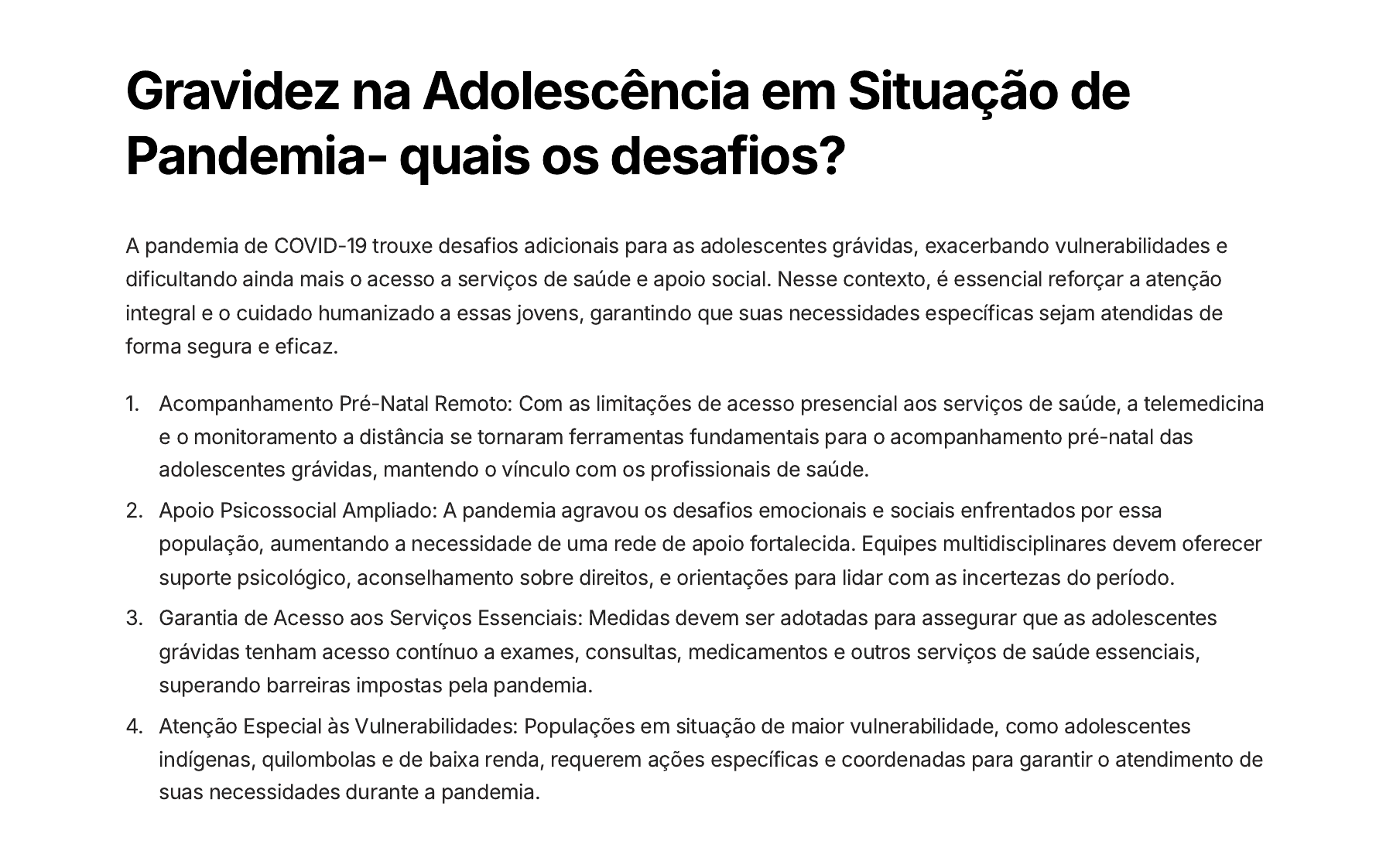 Gravidez na Adolescência em Situação de Pandemia- quais os desafios? A pandemia de COVID-19 trouxe desafios adicionais para as adolescentes grávidas, exacerbando vulnerabilidades e dificultando ainda mais o acesso a serviços de saúde e apoio social. Nesse contexto, é essencial reforçar a atenção integral e o cuidado humanizado a essas jovens, garantindo que suas necessidades específicas sejam atendidas de forma segura e eficaz. Acompanhamento Pré-Natal Remoto: Com as limitações de acesso presencial aos serviços de saúde, a telemedicina e o monitoramento a distância se tornaram ferramentas fundamentais para o acompanhamento pré-natal das adolescentes grávidas, mantendo o vínculo com os profissionais de saúde. 1. Apoio Psicossocial Ampliado: A pandemia agravou os desafios emocionais e sociais enfrentados por essa população, aumentando a necessidade de uma rede de apoio fortalecida. Equipes multidisciplinares devem oferecer suporte psicológico, aconselhamento sobre direitos, e orientações para lidar com as incertezas do período. 2. Garantia de Acesso aos Serviços Essenciais: Medidas devem ser adotadas para assegurar que as adolescentes grávidas tenham acesso contínuo a exames, consultas, medicamentos e outros serviços de saúde essenciais, superando barreiras impostas pela pandemia. 3. Atenção Especial às Vulnerabilidades: Populações em situação de maior vulnerabilidade, como adolescentes indígenas, quilombolas e de baixa renda, requerem ações específicas e coordenadas para garantir o atendimento de suas necessidades durante a pandemia. 4. Qual A Importância da Escuta Ativa e do Acolhimento? O acolhimento e a escuta ativa são pilares fundamentais na assistência de enfermagem à adolescente grávida. Esses aspectos humanísticos vão muito além da mera prestação de cuidados clínicos, pois estabelecem um vínculo de confiança e empatia entre a profissional de saúde e a jovem paciente. Ao adotar uma postura de escuta atenta e acolhedora, a enfermeira cria um espaço seguro para que a adolescente se sinta confortável em compartilhar suas dúvidas, medos e anseios, facilitando o planejamento de um cuidado integral e personalizado. Além disso, a escuta ativa permite que a enfermeira identifique as reais necessidades da adolescente, indo além das queixas clínicas e contemplando os aspectos emocionais, sociais e familiares que interferem diretamente no processo gestacional. Esse olhar holístico é imprescindível para que a jovem se sinta respeitada, compreendida e apoiada durante toda a sua jornada, fortalecendo seu protagonismo e sua capacidade de enfrentar os desafios da maternidade precoce. O acolhimento, por sua vez, transmite a mensagem de que a adolescente grávida é vista, valorizada e terá todo o suporte necessário da equipe de saúde. Essa abordagem humanizada contribui para a redução do estigma e do preconceito, proporcionando à jovem um atendimento com dignidade e respeito a seus direitos. Dessa forma, a enfermeira exerce um papel fundamental no empoderamento e na construção de um projeto de vida saudável para a adolescente. Como é a Abordagem diferenciada para cada fase da adolescência? 1 Puberdade Mudanças físicas e emocionais intensas. 2 Início da adolescência Descoberta da identidade e independência. 3 Adolescência média Consolidação da personalidade e relações sociais. 4 Adolescência tardia Planejamento do futuro e transição para a vida adulta. Cada fase da adolescência apresenta desafios e necessidades específicas que exigem uma abordagem diferenciada dos profissionais de saúde. Na puberdade, o foco deve ser no acolhimento e na educação sobre as transformações corporais. No início da adolescência, é crucial o apoio na construção da identidade e na conquista de maior autonomia. Na adolescência média, a prioridade é consolidar a personalidade e fortalecer as relações sociais. Já na fase final, o principal objetivo é auxiliar no planejamento do futuro e na transição para a vida adulta. Essa compreensão das particularidades de cada etapa permite uma assistência mais efetiva e humanizada à saúde da adolescente grávida.