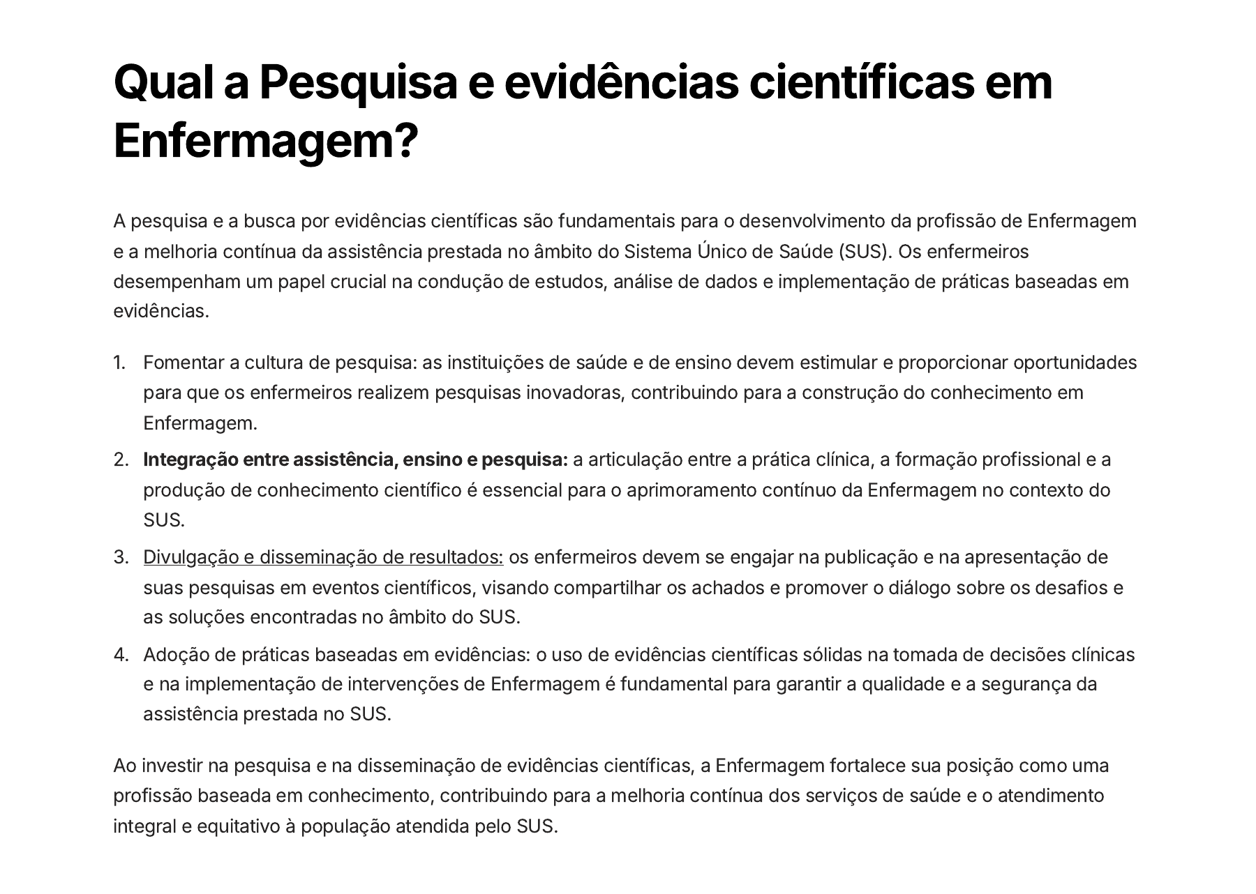 Qual a Pesquisa e evidências científicas em Enfermagem? A pesquisa e a busca por evidências científicas são fundamentais para o desenvolvimento da profissão de Enfermagem e a melhoria contínua da assistência prestada no âmbito do Sistema Único de Saúde (SUS). Os enfermeiros desempenham um papel crucial na condução de estudos, análise de dados e implementação de práticas baseadas em evidências. Fomentar a cultura de pesquisa: as instituições de saúde e de ensino devem estimular e proporcionar oportunidades para que os enfermeiros realizem pesquisas inovadoras, contribuindo para a construção do conhecimento em Enfermagem. 1. Integração entre assistência, ensino e pesquisa: a articulação entre a prática clínica, a formação profissional e a produção de conhecimento científico é essencial para o aprimoramento contínuo da Enfermagem no contexto do SUS. 2. Divulgação e disseminação de resultados: os enfermeiros devem se engajar na publicação e na apresentação de suas pesquisas em eventos científicos, visando compartilhar os achados e promover o diálogo sobre os desafios e as soluções encontradas no âmbito do SUS. 3. Adoção de práticas baseadas em evidências: o uso de evidências científicas sólidas na tomada de decisões clínicas e na implementação de intervenções de Enfermagem é fundamental para garantir a qualidade e a segurança da assistência prestada no SUS. 4. Ao investir na pesquisa e na disseminação de evidências científicas, a Enfermagem fortalece sua posição como uma profissão baseada em conhecimento, contribuindo para a melhoria contínua dos serviços de saúde e o atendimento integral e equitativo à população atendida pelo SUS. Enfermagem e promoção da saúde no SUS- qual a importancia? A promoção da saúde é um pilar fundamental do Sistema Único de Saúde (SUS) e a Enfermagem desempenha um papel crucial nesse processo. Os enfermeiros, juntamente com a equipe de Enfermagem, atuam na identificação de fatores determinantes e condicionantes da saúde da população, desenvolvendo estratégias para promover estilos de vida saudáveis e prevenir doenças e agravos. Essa abordagem holística e preventiva é essencial para a consolidação dos princípios de universalidade, equidade e integralidade do SUS. Ações de Promoção da Saúde: Os profissionais de Enfermagem realizam diversas atividades de promoção da saúde, tais como: educação em saúde, aconselhamento sobre hábitos saudáveis, campanhas de vacinação, rastreamento de doenças crônicas, incentivo à atividade física e alimentação adequada, entre outras. Essas ações buscam empoderar a população e capacitá-la a assumir um papel ativo no cuidado com a própria saúde. Enfermagem e a Atenção Primária à Saúde: A Atenção Primária à Saúde (APS) é a principal porta de entrada do SUS e o local onde a Enfermagem desempenha um papel fundamental na promoção da saúde. Através da Estratégia Saúde da Família (ESF) e de outros programas, os enfermeiros atuam diretamente na comunidade, identificando vulnerabilidades, planejando ações preventivas e promovendo a saúde de forma integral e longitudinal. Desafios e Perspectivas: Apesar dos avanços, ainda existem desafios a serem superados, como a necessidade de maior valorização da Enfermagem na promoção da saúde, a ampliação de recursos e a articulação intersetorial para ações efetivas de prevenção e promoção. No entanto, com o fortalecimento do SUS e o reconhecimento do papel estratégico da Enfermagem, espera-se que a promoção da saúde se consolide cada vez mais como uma prática essencial no cuidado integral à população. Enfermagem e prevenção de doenças e agravos- qual o papel no SUS? A enfermagem desempenha um papel fundamental na prevenção de doenças e agravos de saúde no âmbito do Sistema Único de Saúde (SUS). Os enfermeiros atuam em diversas frentes, como a promoção de hábitos saudáveis, a educação em saúde, a detecção precoce de doenças e a implementação de medidas profiláticas. Com sua visão holística e abordagem centrada no paciente, a enfermagem contribui de maneira substancial para a redução da incidência e a mitigação de complicações de doenças crônicas, infecciosas e traumáticas. Na Atenção Primária à Saúde (APS), os enfermeiros lideram ações de vacinação, controle de doenças transmissíveis, rastreamento de cânceres e acompanhamento de grupos vulneráveis, como idosos, gestantes e crianças. Essa atuação proativa permite a identificação precoce de problemas de saúde e a adoção de medidas preventivas, evitando o agravamento dos quadros clínicos e o consumo excessivo de recursos do sistema de saúde. Além disso, os enfermeiros exercem um papel fundamental na educação em saúde, orientando a população sobre hábitos de vida saudáveis, prevenção de acidentes, uso racional de medicamentos e acesso aos serviços de saúde. Essa abordagem empoderada e centrada no autocuidado se mostra extremamente eficaz na redução da carga de doenças e agravos, contribuindo para a melhoria da qualidade de vida da população atendida pelo SUS.