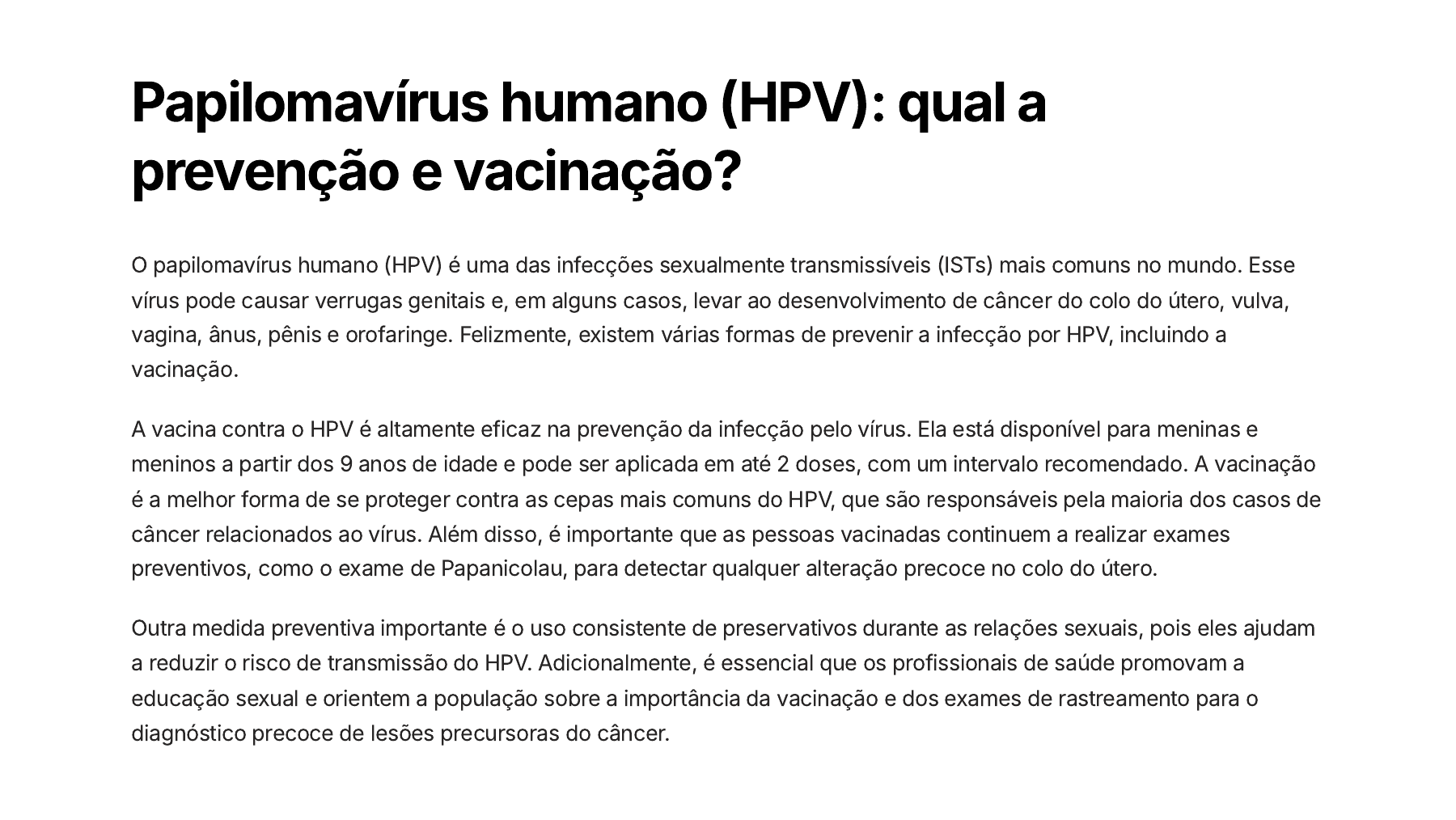 Papilomavírus humano (HPV): qual a prevenção e vacinação? O papilomavírus humano (HPV) é uma das infecções sexualmente transmissíveis (ISTs) mais comuns no mundo. Esse vírus pode causar verrugas genitais e, em alguns casos, levar ao desenvolvimento de câncer do colo do útero, vulva, vagina, ânus, pênis e orofaringe. Felizmente, existem várias formas de prevenir a infecção por HPV, incluindo a vacinação. A vacina contra o HPV é altamente eficaz na prevenção da infecção pelo vírus. Ela está disponível para meninas e meninos a partir dos 9 anos de idade e pode ser aplicada em até 2 doses, com um intervalo recomendado. A vacinação é a melhor forma de se proteger contra as cepas mais comuns do HPV, que são responsáveis pela maioria dos casos de câncer relacionados ao vírus. Além disso, é importante que as pessoas vacinadas continuem a realizar exames preventivos, como o exame de Papanicolau, para detectar qualquer alteração precoce no colo do útero. Outra medida preventiva importante é o uso consistente de preservativos durante as relações sexuais, pois eles ajudam a reduzir o risco de transmissão do HPV. Adicionalmente, é essencial que os profissionais de saúde promovam a educação sexual e orientem a população sobre a importância da vacinação e dos exames de rastreamento para o diagnóstico precoce de lesões precursoras do câncer. Herpes genital: quais sintomas, diagnóstico e tratamento? O herpes genital é uma infecção sexualmente transmissível causada pelo vírus herpes simplex. Essa condição caracteriza-se por erupções cutâneas dolorosas na região genital, que podem aparecer e desaparecer periodicamente. Os sintomas geralmente incluem pequenas bolhas ou úlceras na região genital, nádegas, coxas ou região retal, além de ardência, coceira e dor local. O diagnóstico é feito por meio de exames laboratoriais, como teste sorológico ou cultura de lesões. O tratamento do herpes genital visa aliviar os sintomas e reduzir a frequência e a gravidade dos surtos. Medicamentos antivirais, como aciclovir, valaciclovir e famciclovir, são comumente prescritos. Esses medicamentos podem ser tomados diariamente para prevenir novos surtos ou apenas durante os episódios agudos. Além disso, medidas de higiene, como manter a área afetada limpa e seca, podem ajudar no alívio dos sintomas. Em casos recorrentes ou graves, o acompanhamento com um profissional de saúde é essencial para um tratamento adequado. Tricomoníase: quais sintomas, diagnóstico e tratamento? A tricomoníase é uma infecção sexualmente transmissível (IST) causada pelo parasita Trichomonas vaginalis. Essa infecção pode afetar tanto homens quanto mulheres, e seus sintomas variam dependendo do sexo do paciente. Principais sintomas da tricomoníase Mulheres: corrimento vaginal amarelado, espumoso e de odor desagradável, coceira e irritação na vagina e vulva, dor durante a relação sexual e ao urinar. Homens: geralmente assintomáticos, mas podem apresentar irritação na uretra, ardência ao urinar e leve secreção uretral. Diagnóstico e tratamento O diagnóstico é feito por meio de exames laboratoriais, como a visualização do parasita em microscópio ou testes moleculares. O tratamento é feito com antibióticos, geralmente com medicamentos como metronidazol ou tinidazol, por via oral. É importante que o(a) parceiro(a) sexual também seja tratado(a) para evitar reinfecções. A tricomoníase, se não tratada adequadamente, pode levar a complicações como inflamação pélvica, facilitação da transmissão do HIV e aumento do risco de desenvolver câncer de colo de útero. Por isso, é essencial buscar atendimento médico assim que perceber os sintomas e seguir rigorosamente o tratamento prescrito.