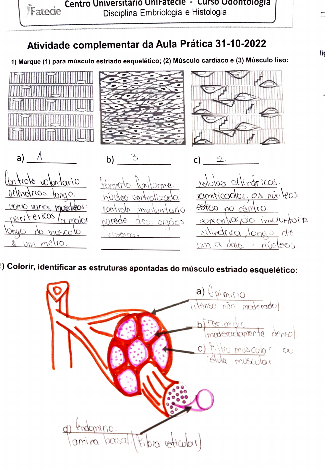 CentroUniversitario UniFatecie Curso aontoi08 Fatecie Disciplina Embriologia e Histologia Atividade complementar da Aula Prática 31-10-2022 li 1) Marque (1) para müsculo estriado esquelético: (2) Músculo cardíaco e (3) Músculo liso: L M a)_ b)3 c) nteoke vountario RlRnodrios longo. nOo Unlforme 4alulos t|indr icos nutieo CoMroalizodo OmticooloJ 0S nuo leos Otoln iny lurteaio stuo o cóniro oKenuGOO iulur tora olindrico long o dt nucleos nOrede OnuC do musco lo Un metco. daio ) Colorir, identificar as estruturas apontadas do músculo estriado esquelético: a)pi nis iO den ngc re rrsdo b)e miri madeiudoente nso|. c) msculo f Ada mUtuloar d)tndomirio { "type": "Document", "isBackSide": false }