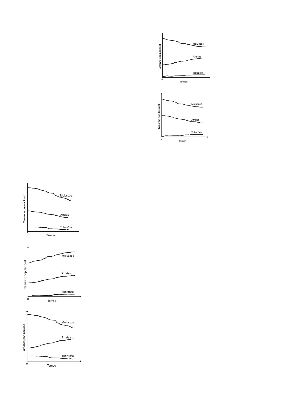 BIOLOGIA Comunidades e Populações 01 - (ENEM) Dados compilados por Jeremy Jackson, do Instituto Scripps de Oceanografia (EUA), mostram que o declínio de 90% dos indivíduos de 11 espécies de tubarões do Atlântico Norte, causado pelo excesso de pesca, fez comque a população de uma arraia, normalmente devorada por eles, explodisse para 40 milhões de indivíduos. Doce vingança: essa horda de arraias é capaz de devorar 840 mil toneladas de moluscos por ano, o que provavelmente explica o colapso da antes lucrativa pesca de mariscos na Baía de Chesapeake (EUA). LOPES, R. J. Nós, o asteroide. Revista Unesp Ciência, abr. 2010. Disponível em: https://issuu.com. Acesso em: 9 maio 2017 (adaptado) Qual das figuras representa a variação do tamanho populacional de tubarões, arraias e moluscos no Atlântico Norte, a partir do momento em que a pesca de tubarões foi iniciada (tempo zero)? a. b. c. d. e. 02 - (ENEM) Existem bactérias que inibem o crescimento de um fungo causador de doenças no tomateiro, por consumirem o ferro disponível no meio. As bactérias também fazem fixação de nitrogênio, disponibilizam cálcio e auxinas, substâncias que estimulam diretamente o crescimento do tomateiro. PELZER, G. Q. et al. Mecanismos de controle da murcha-de-esclerócio e promoção de crescimento em tomateiro mediados por rizobactérias. Tropical Plant Pathology, v. 36, n. 2, mar.-abr. 2011 (adaptado). Qual dos processos biológicos mencionados indica uma relação ecológica de competição? a.Fixação de nitrogênio para o tomateiro. b.Disponibilização de cálcio para o tomateiro. c.Diminuição da quantidade de ferro disponível para o fungo. d.Liberação de substâncias que inibem o crescimento do fungo. e.Liberação de auxinas que estimulam o crescimento do tomateiro. 03 - (ENEM) Uma nova estratégia para o controle da dengue foi apresentada durante o Congresso Internacional de Medicina Tropical, no Rio de Janeiro, em 2012. O projeto traz uma abordagem nova e natural para o combate à doença e já está em fase de testes. O objetivo do programa é cessar a transmissão do vírus da dengue pelo Aedes aegypti, a partir da introdução da bactéria Wolbachia– que é naturalmente encontrada em insetos – nas populações locais de mosquitos. Quando essa bactéria é introduzida no A. aegypti,atua como uma “vacina”, estimulando o sistema imunológico e bloqueando a multiplicação do vírus dentro do inseto. Disponível em: http://portalsaude.saude.gov.br. Acesso em: 20 dez. 2012 (adaptado). Qual o conceito fundamental relacionado a essa estratégia? a.Clonagem. b.Mutualismo. c.Parasitismo. d.Transgênese. e.Controle biológico. 04 - (ENEM) A Mata Atlântica caracteriza-se por uma grande diversidade de epífitas, como as bromélias. Essas plantas estão adaptadas a esse ecossistema e conseguem captar luz, água e nutrientes mesmo vivendo sobre as árvores. Disponível em: www.ib.usp.br. Acesso em: 23 fev. 2013 (adaptado). Essas espécies captam água do(a) a.organismo das plantas vizinhas. b.solo através de suas longas raízes. c.chuva acumulada entre suas folhas. d.seiva bruta das plantas hospedeiras. e.comunidade que vive em seu interior. 05 - (ENEM) Os vaga-lumes machos e fêmeas emitem sinais luminosos para se atraírem para o acasalamento. O macho reconhece a fêmea de sua espécie e, atraído por ela, vai ao seu encontro. Porém, existe um tipo de vaga-lume, o Photuris, cuja fêmea engana e atrai os machos de outro tipo, o Photinusfingindo ser desse gênero. Quando o macho Photinusse aproxima da fêmea Photuris, muito maior que ele, é atacado e devorado por ela. BERTOLDI, O. G.; VASCONCELLOS, J. R. Ciência & sociedade: a aventura da vida, a aventura da tecnologia. São Paulo: Scipione, 2000 (adaptado). A relação descrita no texto, entre a fêmea do gênero Photurise o macho do gênero Photinus, é um exemplo de a.comensalismo. b.inquilinismo. c.cooperação. d.predatismo. e.mutualismo. 06 - (ENEM) No Brasil, cerca de 80% da energia elétrica advém de hidrelétricas, cuja construção implica o represamento de rios. A formação de um reservatório para esse fim, por sua vez, pode modificar a ictiofauna local. Um exemplo é o represamento do Rio Paraná, onde se observou o desaparecimento de peixes cascudos quase que simultaneamente ao aumento do número de peixes de espécies exóticas introduzidas, como o mapará e a corvina, as três espécies com nichos ecológicos semelhantes. PETESSE, M. L., PETRERE, JR. M. Ciência Hoje. São Paulo. n.293 v. 49 jun 2012 (adaptado). Nessa modificação da ictiofauna, o desaparecimento de cascudos é explicado pelo(a) a.redução do fluxo gênico da espécie nativa. b.diminuição da competição intraespecífica. c.aumento da competição interespecífica. d.isolamento geográfico dos peixes. e.extinção de nichos ecológicos. 07 - (ENEM) Existem bactérias que inibem o crescimento de um fungo causador de doenças no tomateiro, por consumirem o ferro disponível no meio. As bactérias também fazem fixação de nitrogênio, disponibilizam cálcio e produzem auxinas, substâncias que estimulam diretamente o crescimento do tomateiro. PELZER, G. Q. et al. “Mecanismos de controle da murcha-de-esclerócio e promoção de crescimento em tomateiro mediados por rizobactérias”. Tropical PIant Pathology, v. 36, n. 2, mar. abr. 2011 (adaptado). Qual dos processos biológicos mencionados indica uma relação ecológica de competição? a.Fixação de nitrogênio para o tomateiro. b.Disponibilização de cálcio para o tomateiro. c.Diminuição da quantidade de ferro disponível para o fungo. d.Liberação de substâncias que inibem o crescimento do fungo. e.Liberação de auxinas que estimulam o crescimento do tomateiro. 08 - (ENEM) Os corais funcionam como termômetros, capazes de indicar, mudando de coloração, pequenas alterações na temperatura da água dos oceanos. Mas, um alerta, eles estão ficando brancos. O seu clareame