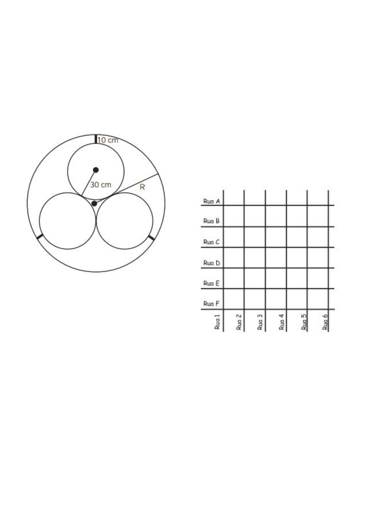 MATEMÁTICA Triângulos 01 - (ENEM) Em um sistema de dutos, três canos iguais, de raio externo 30 cm, são soldados entre si e colocados dentro de um cano de raio maior, de medida R. Para posteriormente ter fácil manutenção, é necessário haver uma distância de 10 cm entre os canos soldados e o cano de raio maior. Essa distância é garantida por um espaçador de metal, conforme a figura: Utilize 1,7 como aproximação para raiz quadrada de três. O valor de R, em centímetros, é igual a: a.64,0. b.65,5. c.74,0. d.81,0. e.91,0. 02 - (ENEM) Diariamente, uma residência consome 20 160 Wh. Essa residência possui 100 células solares retangulares (dispositivos capazes de converter a luz solar em energia elétrica) de dimensões 6 cm X 8 cm. Cada uma das tais células produz, ao longo do dia, 24 Wh por centímetro de diagonal. O proprietário dessa residência quer produzir, por dia, exatamente a mesma quantidade de energia que sua casa consome. Qual deve ser a ação desse proprietário para que ele atinja o seu objetivo? a.Retirar 16 células. b.Retirar 40 células. c.Acrescentar 5 células. d.Acrescentar 20 células. e.Acrescentar 40 células 03 - (ENEM) Uma família resolveu comprar um imóvel num bairro cujas ruas estão representadas na figura. As ruas com nomes de letras são paralelas entre si e perpendiculares às ruas identificadas com números. Todos os quarteirões são quadrados, com as mesmas medidas, e todas as ruas têm a mesma largura, permitindo caminhar somente nas direções vertical e horizontal. Desconsidere a largura das ruas. A família pretende que esse imóvel tenha a mesma distância de percurso até o local de trabalho da mãe, localizado na rua 6 com a rua E, o consultório do pai, na rua 2 com a rua E, e a escola das crianças, na rua 4 com a rua A. Com base nesses dados, o imóvel que atende as pretensões da família deverá ser licalizado no encontro das ruas a.3 e C b.4 e C c.4 e D d.4 e E e.5 e C 04 - (IFSP) Um restaurante foi representado em sua planta por um retângulo PQRS. Um arquiteto dividiu sua área em: cozinha (C), área de atendimento ao público (A) e estacionamento (E), como mostra a figura abaixo. Sabendo que P, H e R são colineares, que PH mede 9 m e que SH mede 12 m, a área total do restaurante, em metros quadrados, é a.150 b.200 c.250 d.300 e.350 05 - (ENEM) Um senhor, pai de dois filhos, deseja comprar dois terrenos, com áreas de mesma medida, um para cada filho. Um dos terrenos visitados já está demarcado e, embora não tenha um formato convencional (como se observa na Figura B), agradou ao filho mais velho e, por isso, foi comprado. O filho mais novo possui um projeto arquitetônico de uma casa que quer construir, mas, para isso, precisa de um terreno na forma retangular (como mostrado na Figura A) cujo comprimento seja 7m maior do que a largura. Para satisfazer o filho mais novo, esse senhor precisa encontrar um terreno retangular cujas medidas, em metro, do comprimento e da largura sejam iguais, respectivamente, a a.7,5 e 14,5 b.9,0 e 16,0 c.9,3 e 16,3 d.10,0 e 17,0 e.13,5 e 20,5 06 - (FGV) Num triângulo isósceles ABC, de vértice A, a medida do ângulo obtuso formado pelas bissetrizes dos ângulos B e C é 140° . Então,.as medidas dos ângulos A, B e C são, respectivamente: a.129°, 30° e 30° b.80°, 50° e 50° c.100°, 40° e 40° d.90°, 45° e 45° e.140°, 20° e 20° 07 - (UFTM) Sabe-se que x + 3, 4x + 2 e 6x + 3 são, nessa ordem, três termos consecutivos de uma Progressão Geométrica crescente e constituem as medidas dos lados de um triângulo escaleno. A medida do perímetro desse triângulo é, em u.c., igual a a.16. b.19. c.15. d.24. e.14. 08 - (FUVEST) Na figura a seguir, tem-se que AD=AE, CD=CF e BA=BC. Se o ângulo EDF mede 80°, então o ângulo ABC mede: a.20° b.30° c.50° d.60° e.90° 09 - (UFSM) A caminhada é uma das atividades físicas que, quando realizada com frequência, torna-se eficaz na prevenção de doenças crônicas e na melhora da qualidade de vida. Para a prática de uma caminhada, uma pessoa sai do ponto A, passa pelos pontos B e C e retorna ao ponto A, conforme trajeto indicado na figura. Quantos quilômetros ela terá caminhado, se percorrer todo o trajeto? a.2,29. b.2,33. c.3,16. d.3,50. e.4,80. 10 - (ENEM) Uma criança deseja criar triângulos utilizando palitos de fósforo de mesmo comprimento. Cada triângulo será construído com exatamente 17 palitos e pelo menos um dos lados do triângulo deve ter o comprimento de exatamente 6 palitos. A figura ilustra um triângulo construído com essas características. A quantidade máxima de triângulos não congruentes dois a dois que podem ser construídos é a.3. b.5. c.6. d.8. e.10. 11 - (FUVEST) Duas retas s e t do plano cartesiano se interseptam no ponto (2,2). O produto de seus coeficientes angulares é 1 e a reta s intercepta o eixo dos y no ponto (0,3). A área do triângulo delimitado pelo eixo dos x e pelas retas s e t é: a.2 b.3 c.4 d.5 e.6 12 - (ITA) Considere 12 pontos distintos dispostos no plano, 5 dos quais estão numa mesma reta. Qualquer outra reta do plano contém, no máximo, 2 destes pontos. Quantos triângulos podemos formar com os vértices nestes pontos? a.210 b.315 c.410 d.415 e.521 13 - (FUVEST) Os comprimentos dos lados de um triângulo ABC formam umaPA. Sabendo-se também que o perímetro de ABC vale 15 e que o ângulo  mede 120°, então o produto dos comprimentos dos lados é igual a a.25 b.45 c.75 d.105 e.125 14 - (FUVEST) Na figura AB = BD = CD. Então: a.y = 3x b.y = 2x c.x + y = 180º d.x = y e.3x = 2y 15 - (UEL) Unindo os pontos médios de um quadrado de 15 cm de lado construímos um novo quadrado. Unindo os pontos médios desse novo quadrado construímos um terceiro quadrado, e assim sucessivamente. Realizando esse processo indefinidamente, teremos um número infinito de quadrados. A soma das áreas de todos esses quadrados é: a.102 cm2 b.120 cm2 c.225 cm2 d.345 cm2 e.450 cm2 GABARITO 01 – C