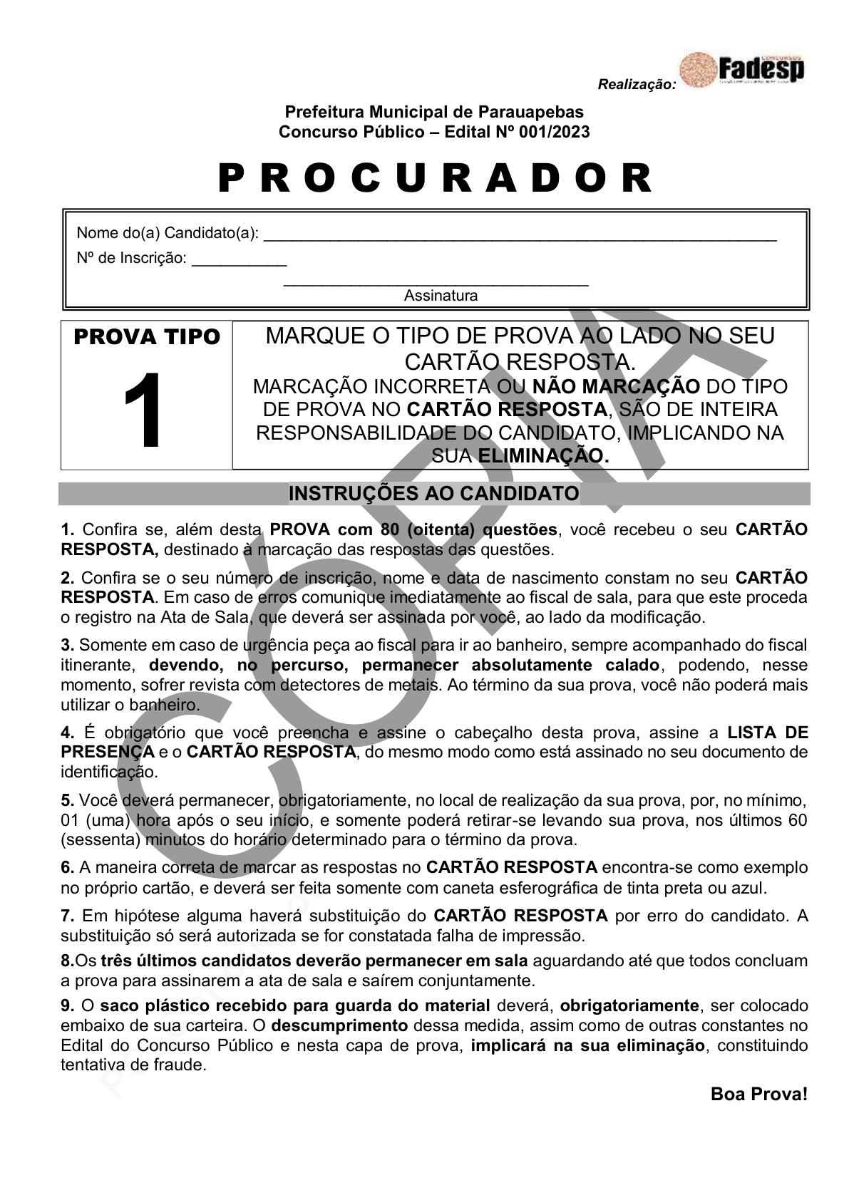pcimarkpci MjgwNDowZDQxOmU2Yjc6MjMwMDo3Y2UyOmQ4Mjc6NTBkMDoxYWFj:VHVlLCAyOSBPY3QgMjAyNCAwNzozNToxMSAtMDMwMA== www.pciconcursos.com.br Realização: Prefeitura Municipal de Parauapebas Concurso Público – Edital Nº 001/2023 P R O C U R A D O R PROVA TIPO 1 MARQUE O TIPO DE PROVA AO LADO NO SEU CARTÃO RESPOSTA. MARCAÇÃO INCORRETA OU NÃO MARCAÇÃO DO TIPO DE PROVA NO CARTÃO RESPOSTA, SÃO DE INTEIRA RESPONSABILIDADE DO CANDIDATO, IMPLICANDO NA SUA ELIMINAÇÃO. INSTRUÇÕES AO CANDIDATO 1. Confira se, além desta PROVA com 80 (oitenta) questões, você recebeu o seu CARTÃO RESPOSTA, destinado à marcação das respostas das questões. 2. Confira se o seu número de inscrição, nome e data de nascimento constam no seu CARTÃO RESPOSTA. Em caso de erros comunique imediatamente ao fiscal de sala, para que este proceda o registro na Ata de Sala, que deverá ser assinada por você, ao lado da modificação. 3. Somente em caso de urgência peça ao fiscal para ir ao banheiro, sempre acompanhado do fiscal itinerante, devendo, no percurso, permanecer absolutamente calado, podendo, nesse momento, sofrer revista com detectores de metais. Ao término da sua prova, você não poderá mais utilizar o banheiro. 4. É obrigatório que você preencha e assine o cabeçalho desta prova, assine a LISTA DE PRESENÇA e o CARTÃO RESPOSTA, do mesmo modo como está assinado no seu documento de identificação. 5. Você deverá permanecer, obrigatoriamente, no local de realização da sua prova, por, no mínimo, 01 (uma) hora após o seu início, e somente poderá retirar-se levando sua prova, nos últimos 60 (sessenta) minutos do horário determinado para o término da prova. 6. A maneira correta de marcar as respostas no CARTÃO RESPOSTA encontra-se como exemplo no próprio cartão, e deverá ser feita somente com caneta esferográfica de tinta preta ou azul. 7. Em hipótese alguma haverá substituição do CARTÃO RESPOSTA por erro do candidato. A substituição só será autorizada se for constatada falha de impressão. 8.Os três últimos candidatos deverão permanecer em sala aguardando até que todos concluam a prova para assinarem a ata de sala e saírem conjuntamente. 9. O saco plástico recebido para guarda do material deverá, obrigatoriamente, ser colocado embaixo de sua carteira. O descumprimento dessa medida, assim como de outras constantes no Edital do Concurso Público e nesta capa de prova, implicará na sua eliminação, constituindo tentativa de fraude. Boa Prova! Nome do(a) Candidato(a): ______________________________________________________ Nº de Inscrição: __________ ________________________________ Assinatura pcimarkpci MjgwNDowZDQxOmU2Yjc6MjMwMDo3Y2UyOmQ4Mjc6NTBkMDoxYWFj:VHVlLCAyOSBPY3QgMjAyNCAwNzozNToxMSAtMDMwMA== www.pciconcursos.com.br pcimarkpci MjgwNDowZDQxOmU2Yjc6MjMwMDo3Y2UyOmQ4Mjc6NTBkMDoxYWFj:VHVlLCAyOSBPY3QgMjAyNCAwNzozNToxMSAtMDMwMA== www.pciconcursos.com.br 3 DIREITO CONSTITUCIONAL 01 O desenvolvimento histórico das constituições indica a existência de atributos e princípios fundamentais. Sobre o tema é correto afirmar o seguinte: (A) a noção de supremacia da Constituição tem sua origem remontando à Magna Carta Inglesa de 1215, que consagrou o princípio da supremacia formal da Lei sobre a vontade do Rei João. (B) o princípio da supremacia é característica fundamental de qualquer texto constitucional e se impõe de modo que qualquer texto ou ato normativo público ou privado apenas será considerado válido caso esteja em desacordo com a forma ou o conteúdo prescrito no texto constitucional. (C) também corresponde ao princípio da supremacia da Constituição, e é consagrado em nossa Constituição Federal em seu artigo 60, a existência de normas dotadas de rigidez extraordinária. Assim, é possível a declaração de inconstitucionalidade de norma constitucional proveniente do Constituinte Originário, quando foram violadas as cláusulas pétreas, tendo em vista o caráter estruturante da Constituição e da salvaguarda dos direitos fundamentais. (D) o sistema constitucional brasileiro prevê a existência de mecanismo formal de controle de constitucionalidade das leis e atos normativos do Poder Público, porém a existência deste mecanismo não se mostra como elemento essencial de uma Constituição, possuindo relevância apenas em face da rigidez constitucional. 02 Considerando os direitos e as garantias fundamentais, tais como contidas na Constituição Federal, é correto afirmar que (A) o mandado de segurança coletivo apenas pode ser manejado por partido político com representação no Congresso Nacional, por entidade sindical de âmbito nacional ou por associação legalmente constituída e em funcionamento há pelo menos um ano. (B) o fornecimento de informações de interesse geral, por autoridade pública, previsto no artigo 5º XXXIII da Constituição Federal, depende de requerimento do interessado e pode se subordinar ao pagamento de taxas. (C) a vedação da existência de Juízo ou Tribunal de exceção afasta a possibilidade de exercício da jurisdição por ramo do Poder Judiciário diverso da propositura da ação. (D) o “habeas corpus” como garantia constitucional sujeita-se às regras do processo, pelo que não pode ser concedido de ofício. 03 A Declaração de Direitos do Homem e do Cidadão, de 1789, estabeleceu, em seu artigo 16º, que qualquer sociedade em que não esteja assegurada a garantia dos direitos, nem estabelecida a separação dos poderes, não tem Constituição. A previsão de direitos, em nossa Carta Magna, expressa-se de modo que (A) a aquisição de outra nacionalidade, de modo voluntário, implica a perda da nacionalidade originária brasileira, ressalvada a hipótese de imposição de naturalização, pela norma estrangeira, ao brasileiro residente em estado estrangeiro, como condição para permanência em seu território ou para o exercício de direitos civis. (B) o brasileiro nato, quaisquer qu